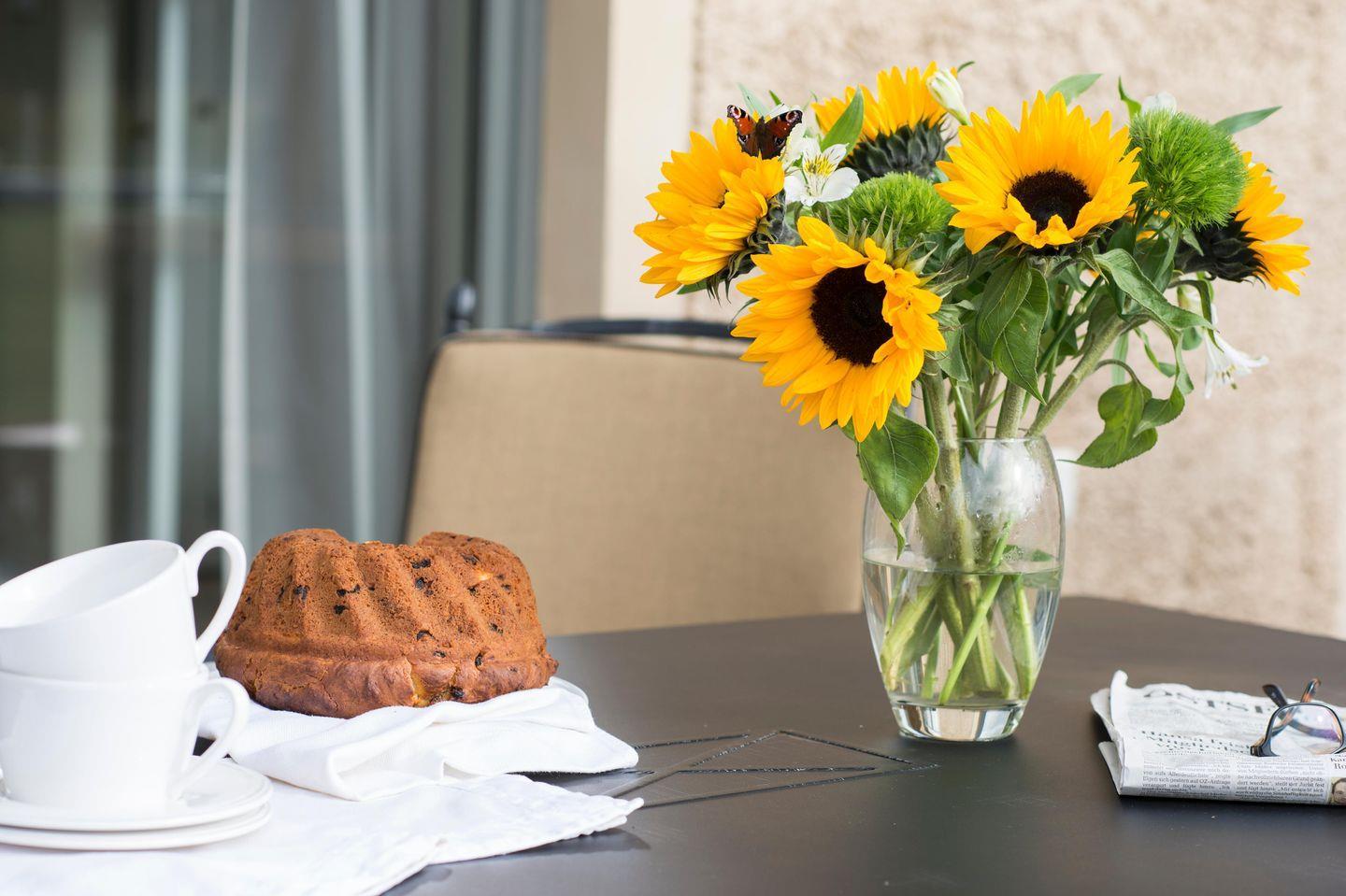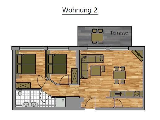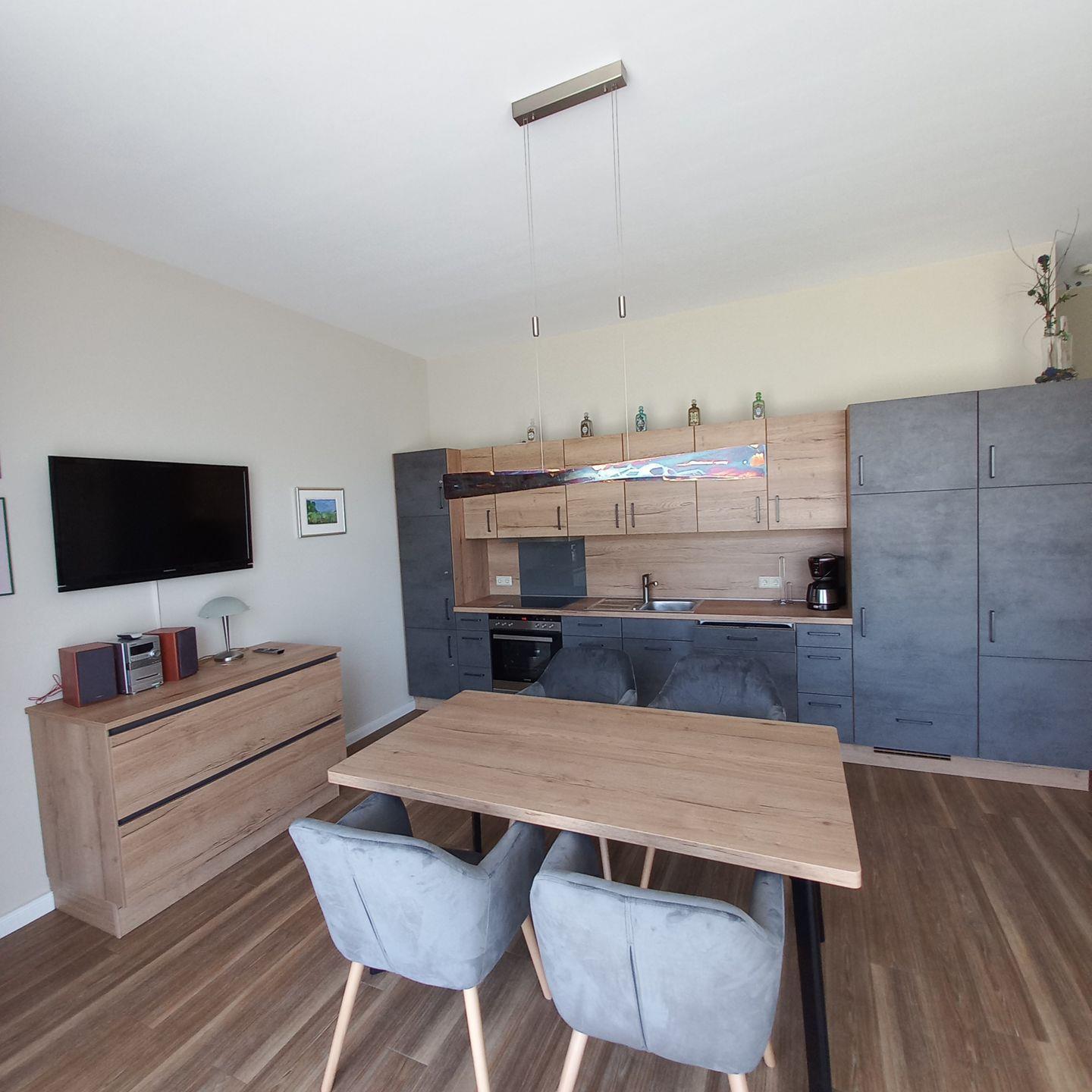 Die zum Innenhof der Remise nach Süden ausgerichtete Terrasse begehen Sie aus der gemütlich eingerichteten Wohnküche. Die moderne offene Küchenzeile ist komplett, incl. Geschirrspüler ausgestattet.