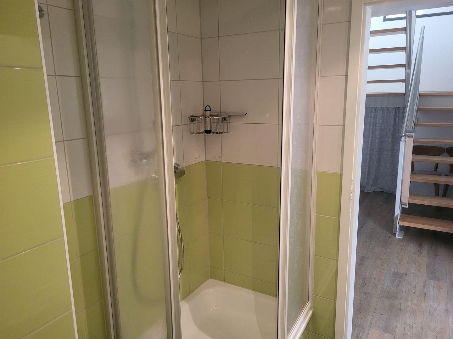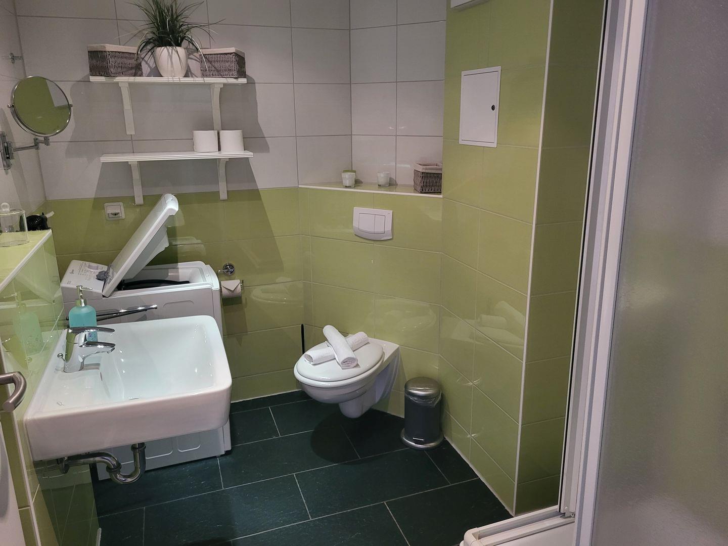 Das Badezimmer ist mit Dusche, WC, Waschbecken, Wandheizkörper, Fön ausgestattet.