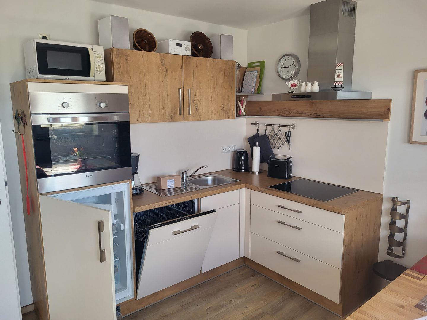 Eine voll ausgestattete Einbauküchenzeile ist integriert.