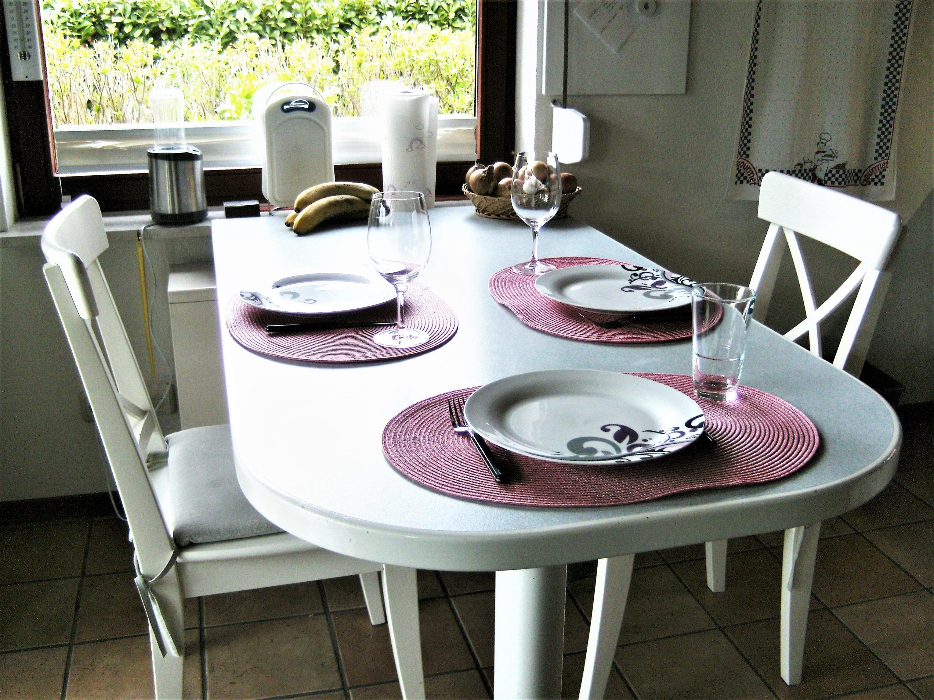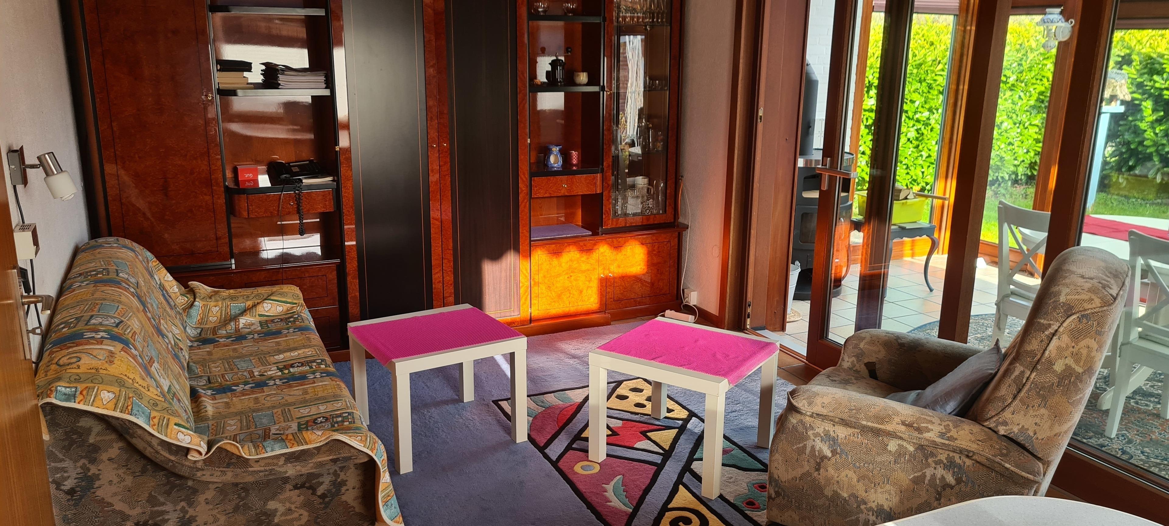 Wohnzimmer mit offener Küche: Ausziehcouch mit 2 zusätzlichen Schlafmöglichkeiten, TV, kostenloses Internet via LAN und WLAN (abschaltbar wenn gewünscht), Festnetz-Telefon, Ceran-Platte mit 4 Kochfeldern, Kühlschrank, Geschirrspüler, Spüle, Esstisch mit 2 Stühlen (weitere können vom Wintergarten geholt werden) , reichlich Gläser, Geschirr und Küchenutensilien
