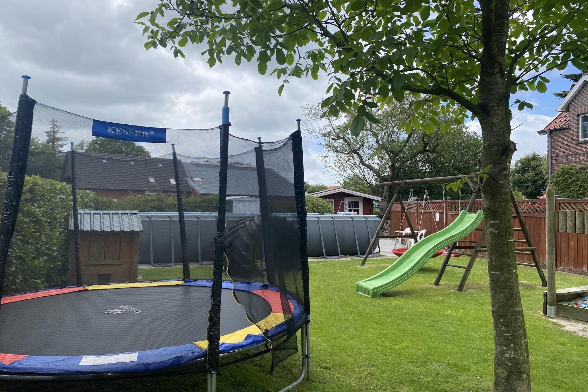 Parterre: (Küche(Kochplatte(4 Kochplatten, elektrisch), Wasserkocher, Toaster, Backofen, Mikrowelle, Spülmaschine, Kühl-/Gefrierkombination), Wohn-/Schlafzimmer(Schlafcouch 1 Pers., TV(Satellit), Esstisch, Radio, CD-Spieler), Badezimmer(Dusche, Waschbecken, Toilette)) In der 1. Etage: (Schlafzimmer(Doppelbett), Schlafzimmer(2x Einzelbett)) Abstellraum(Gemeinschaftliche Nutzung mit anderen Gästen), Reiten, Spielplatz, Liegewiese, Babybett, Waschmaschine, Heizung, Terrasse, Terrasse, Gartenmöbel, Grill, Parkplatz, Trampolin, Pool(Gemeinschaftliche Nutzung mit anderen Gästen, beheizbar, 8 x 4 m.), Sandkasten, Tischfußball, Hochstuhl, Gesellschaftsspiele, Schaukel, Handtücher inklusive, Bettwäsche inklusive