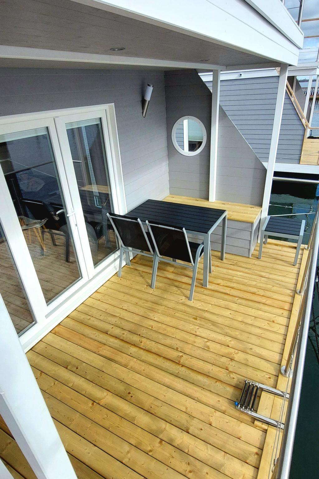 TOSCA verfügt über eine Terrasse im Erdgeschoss mit einem Essplatz für fünf Personen. Weiterhin besteht dort die Möglichkeit, die vorhandene Hängematte einzuhängen. Von dieser Terrasse gelangt man über eine Treppe zu der ca. 40qm großen Dachterrasse mit Loungeecke und Sonnenliegen. Hier können Sie einen wundervollen Ausblick genießen und entspannen.