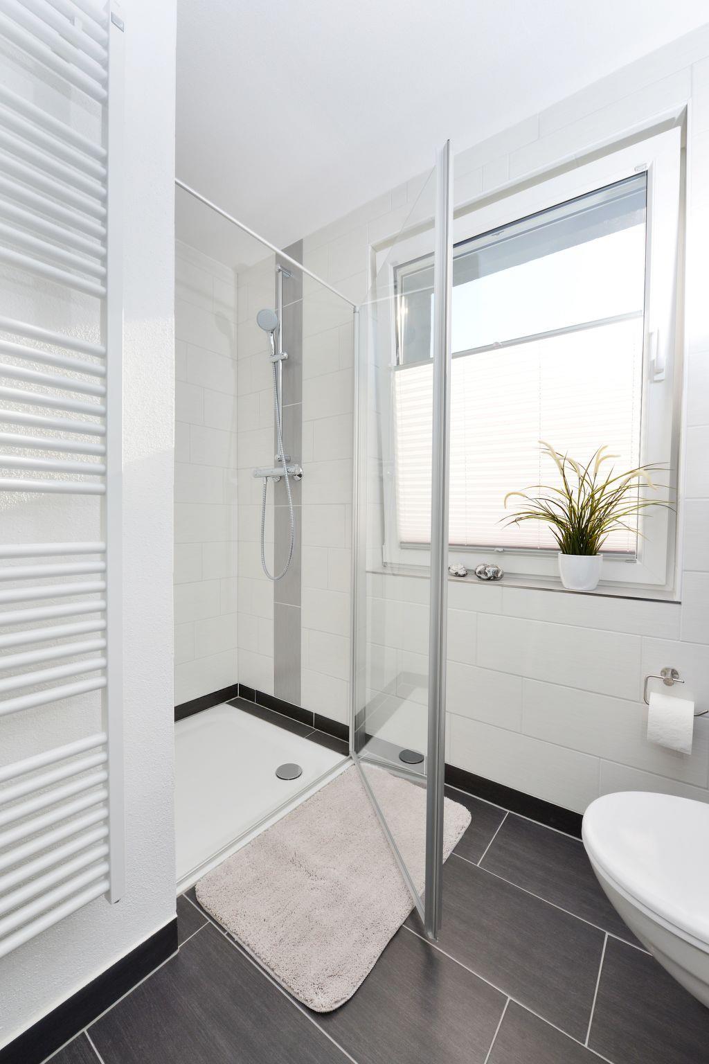 Zusammen mit dem Schlafzimmer befindet sich im Obergeschoss das Badezimmer. Es ist ausgestattet mit einer ebenerdigen Dusche, einem beheizten Handtuchhalter, sowie einem Waschtisch, einem WC und einer Waschmaschine.