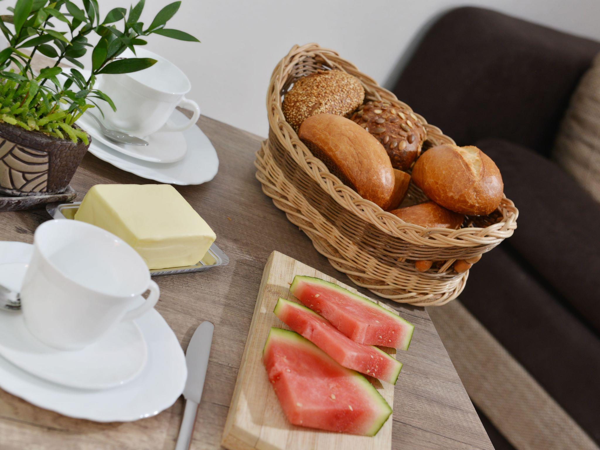 Das Wohnzimmer ist modern eingerichtet, verfügt über einen Essbereich und eine gemütliche Sofaecke, die sich zur Schlafgelegenheit umbauen lässt. Für Unterhaltung sorgt der Flachbildschirm und der Internetanschluss über WLAN.