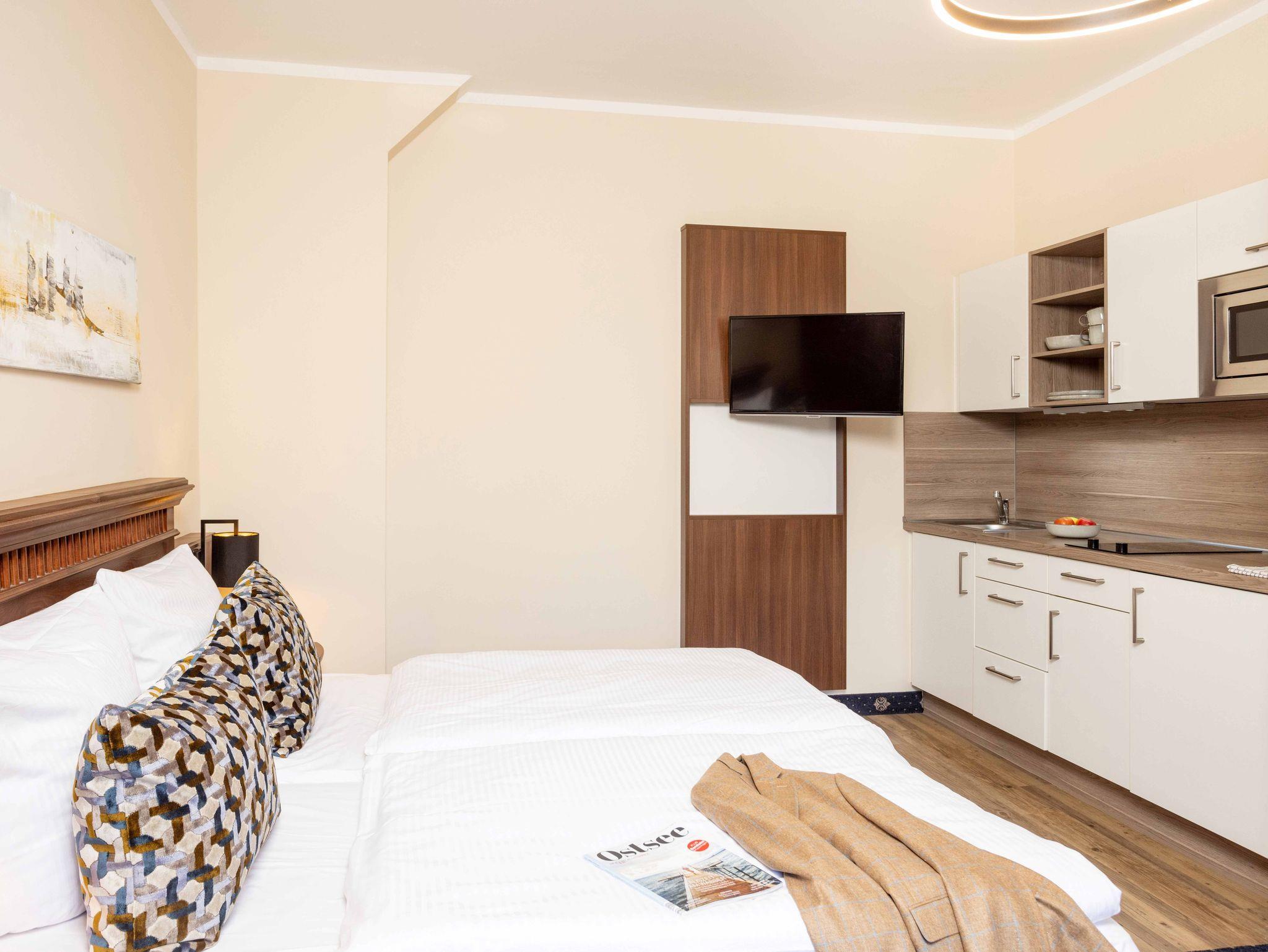 Unsere modernen 1-Raum-Apartments Classic befinden sich im Erdgeschoss, 1. und 2. OG mit Zugang über eine Außentreppe über unseren Innenhof. Zur Ausstattung gehören ein komfortables Boxspringbett, eine kleine Sitzecke mit Tisch, eine praktische Küchenzeile und ein Badezimmer mit Dusche und WC.