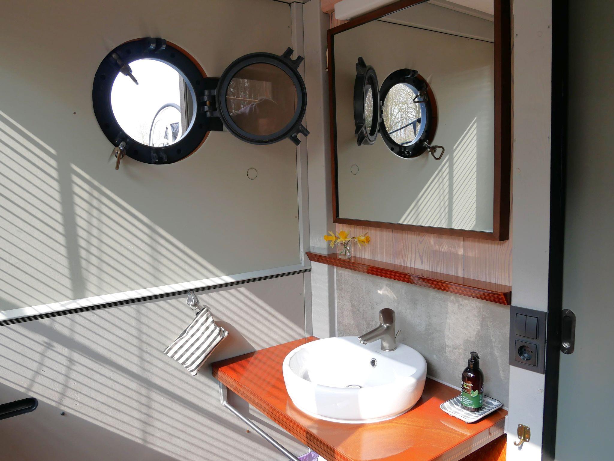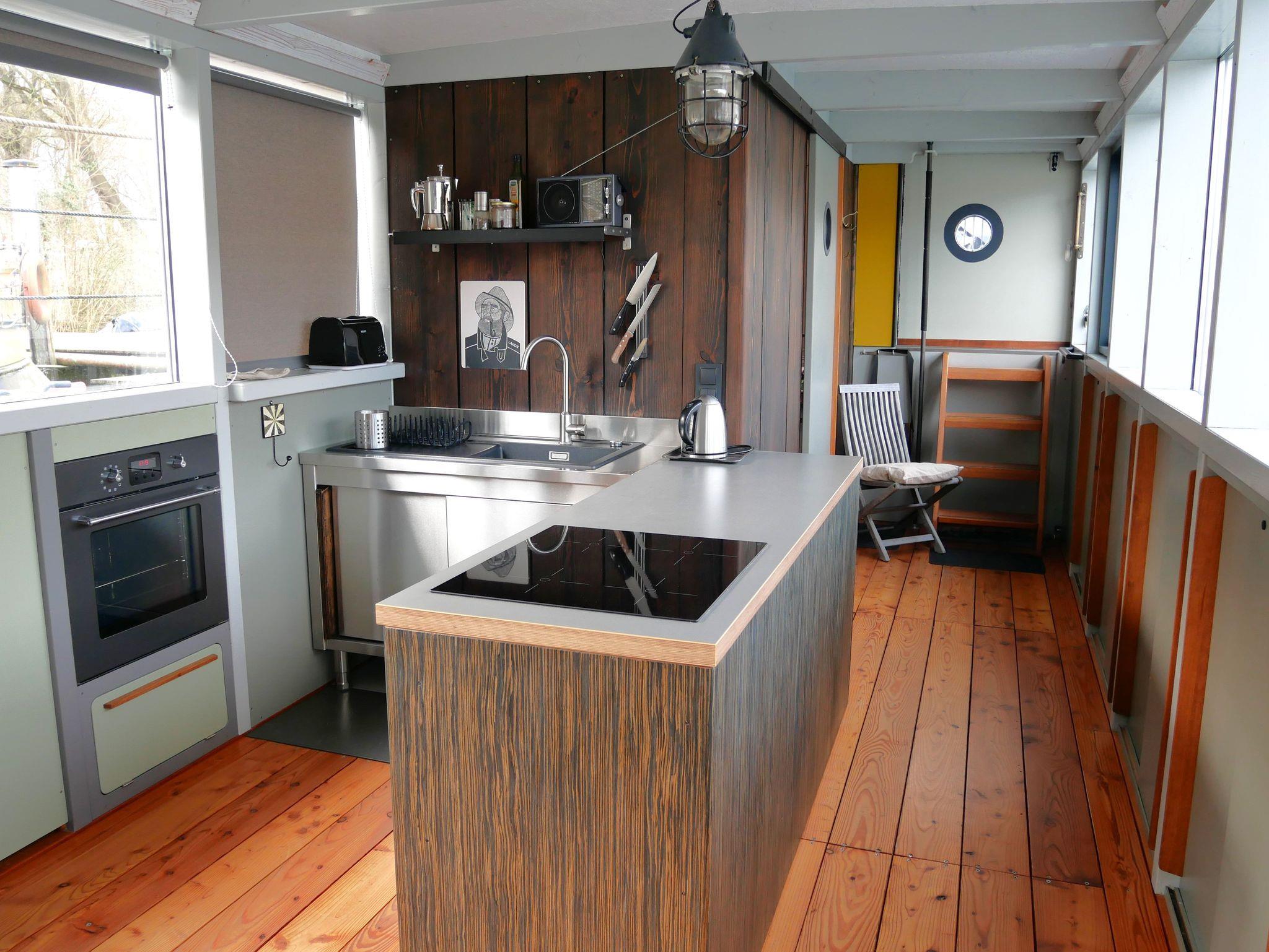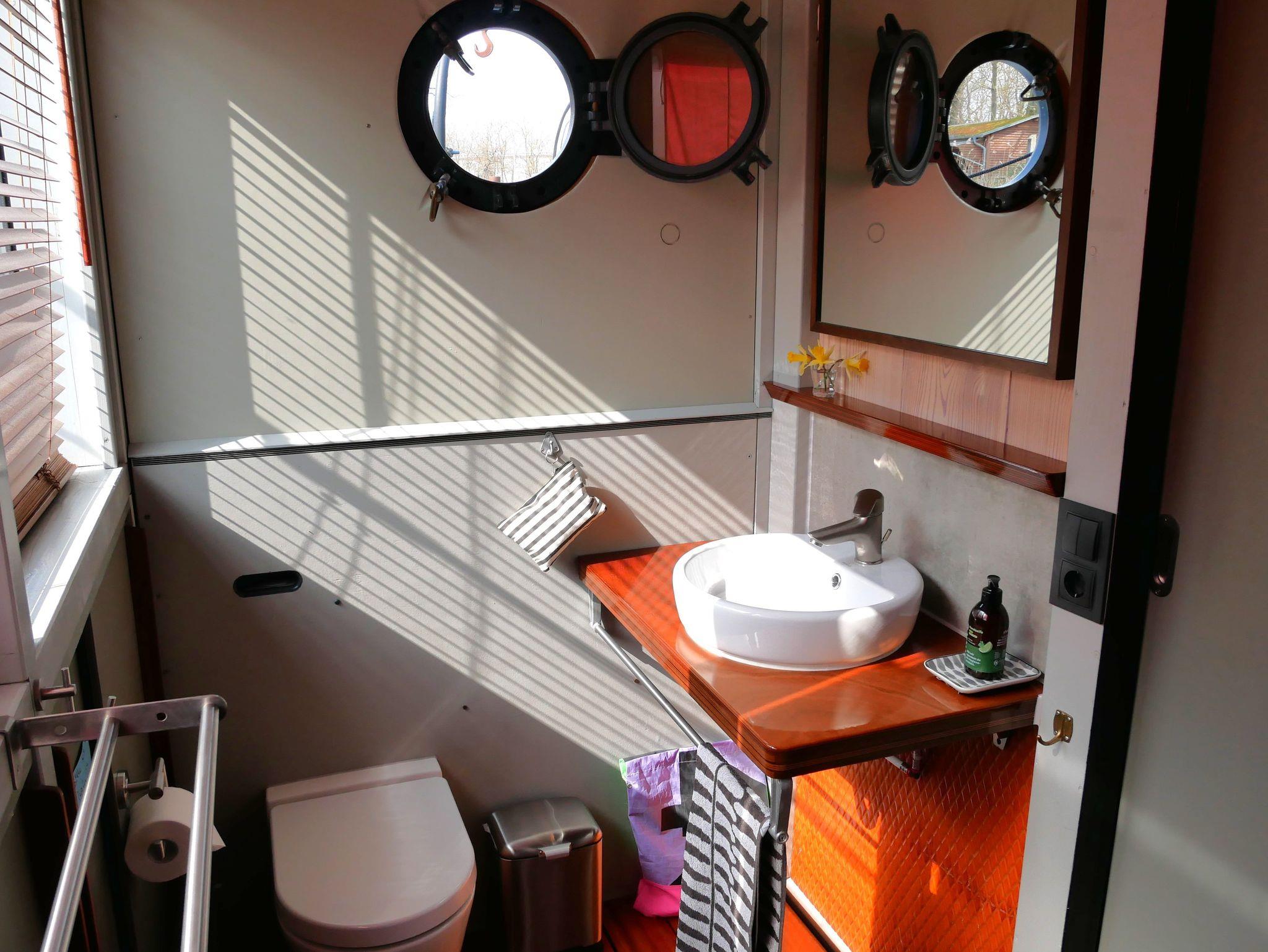 Das Hausboot ist ausgestattet mit einem Wohn-Schlafbereich mit offener Wohnküche, einem separaten Schlafbereich sowie einem Bad mit DU/WC.