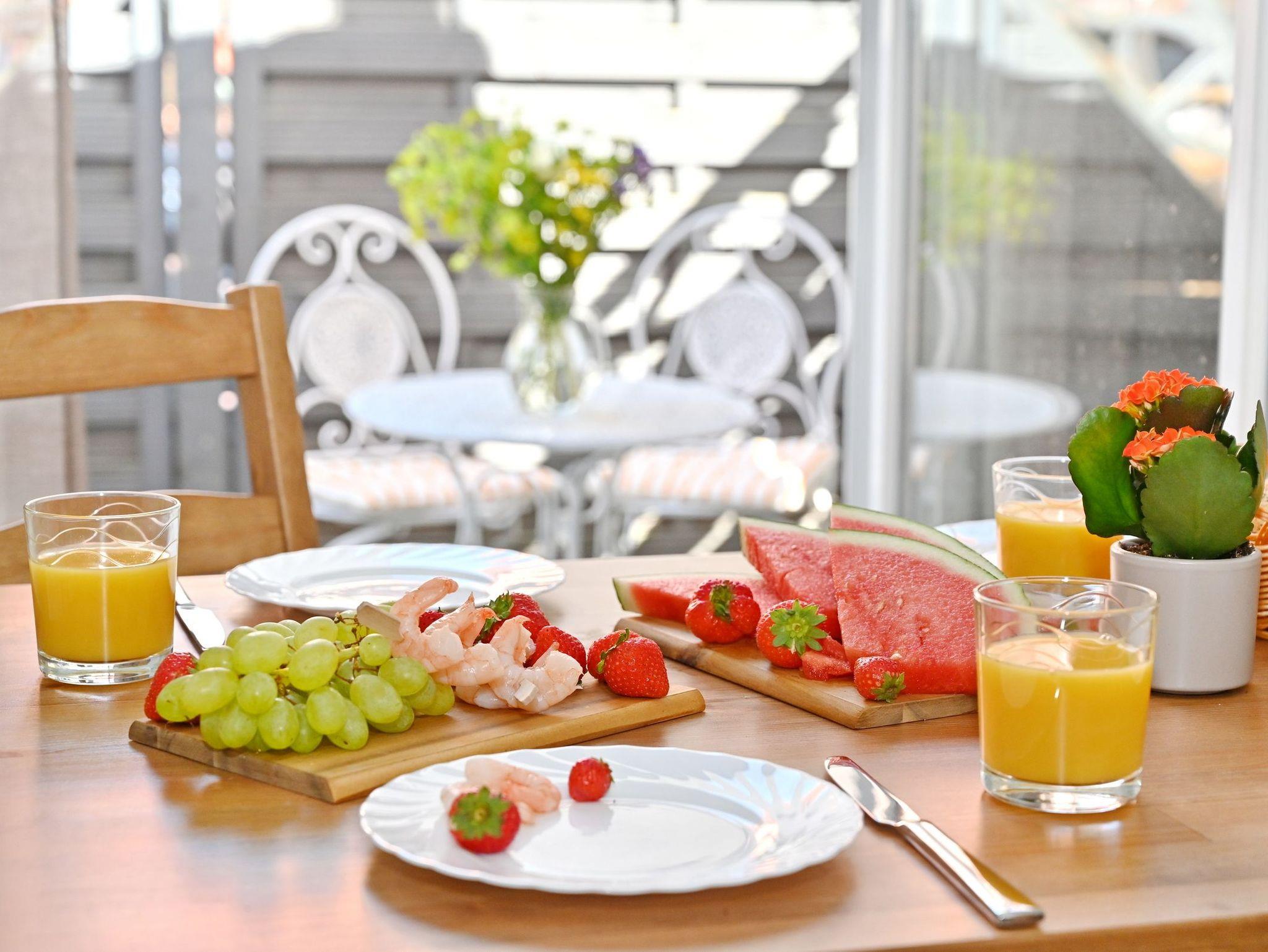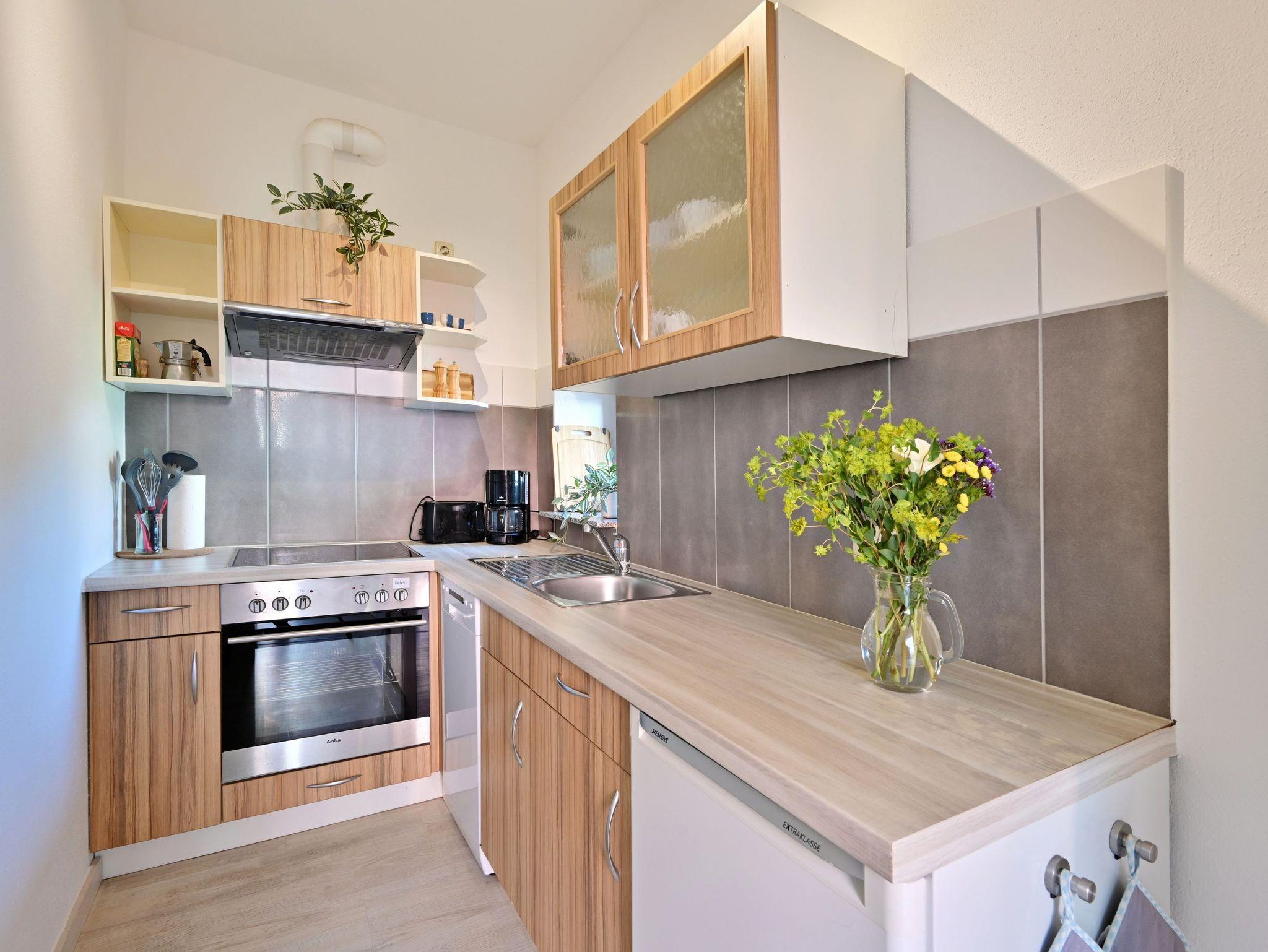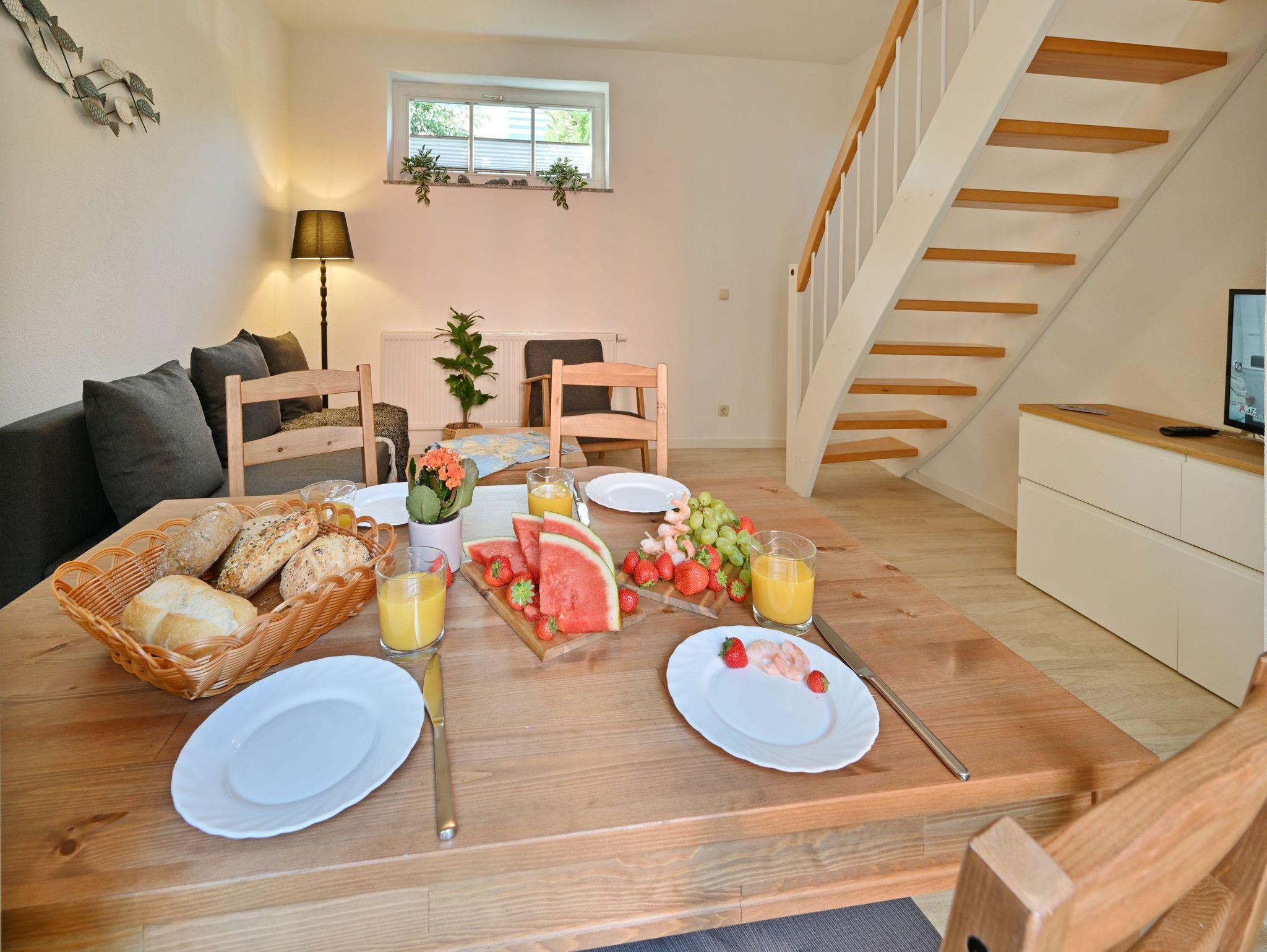 Unser Ferienhaus auf dem Hinterhof hat ein Schlafzimmer im Obergeschoss mit Doppelbett und eine Schlafcouch (150cm) im Wohnzimmer im Erdgeschoss. Die Küche ist ebenfalls im Erdgeschoss und verfügt über einen Abzug. Zusammen mit dem Schlafzimmer befindet sich im Obergeschoss das Badezimmer. Es ist ausgestattet mit einer ebenerdigen Dusche, einem beheizten Handtuchhalter, sowie einem Waschtisch, einem WC und einer Waschmaschine. Das Wohnzimmer ist modern eingerichtet, verfügt über einen Essbereich und eine gemütliche Sofaecke, die sich zur Schlafgelegenheit umbauen lässt. Für Unterhaltung sorgt der Flachbildschirm und der Internetanschluss über WLAN. Auf der am Wohnzimmer grenzenden kleinen Terrasse gibt es Sitzgelegenheiten für zwei Personen, um den Abend bei einem Glas Wein ausklingen zu lassen. Auch Grill Zubehör ist vorhanden.