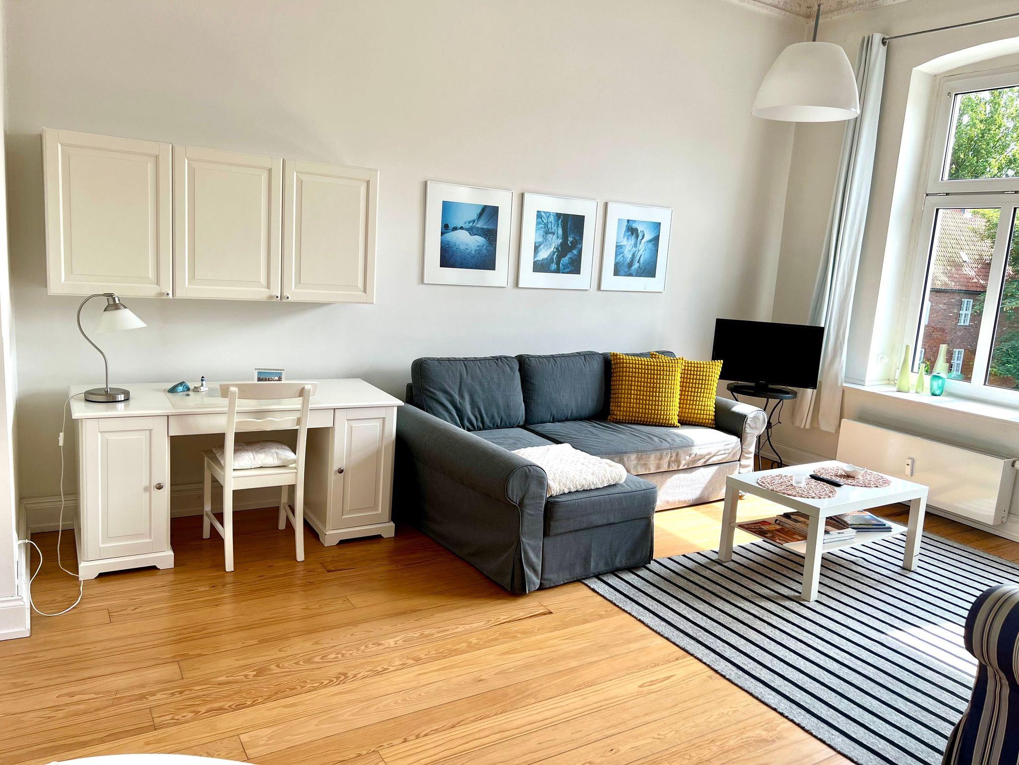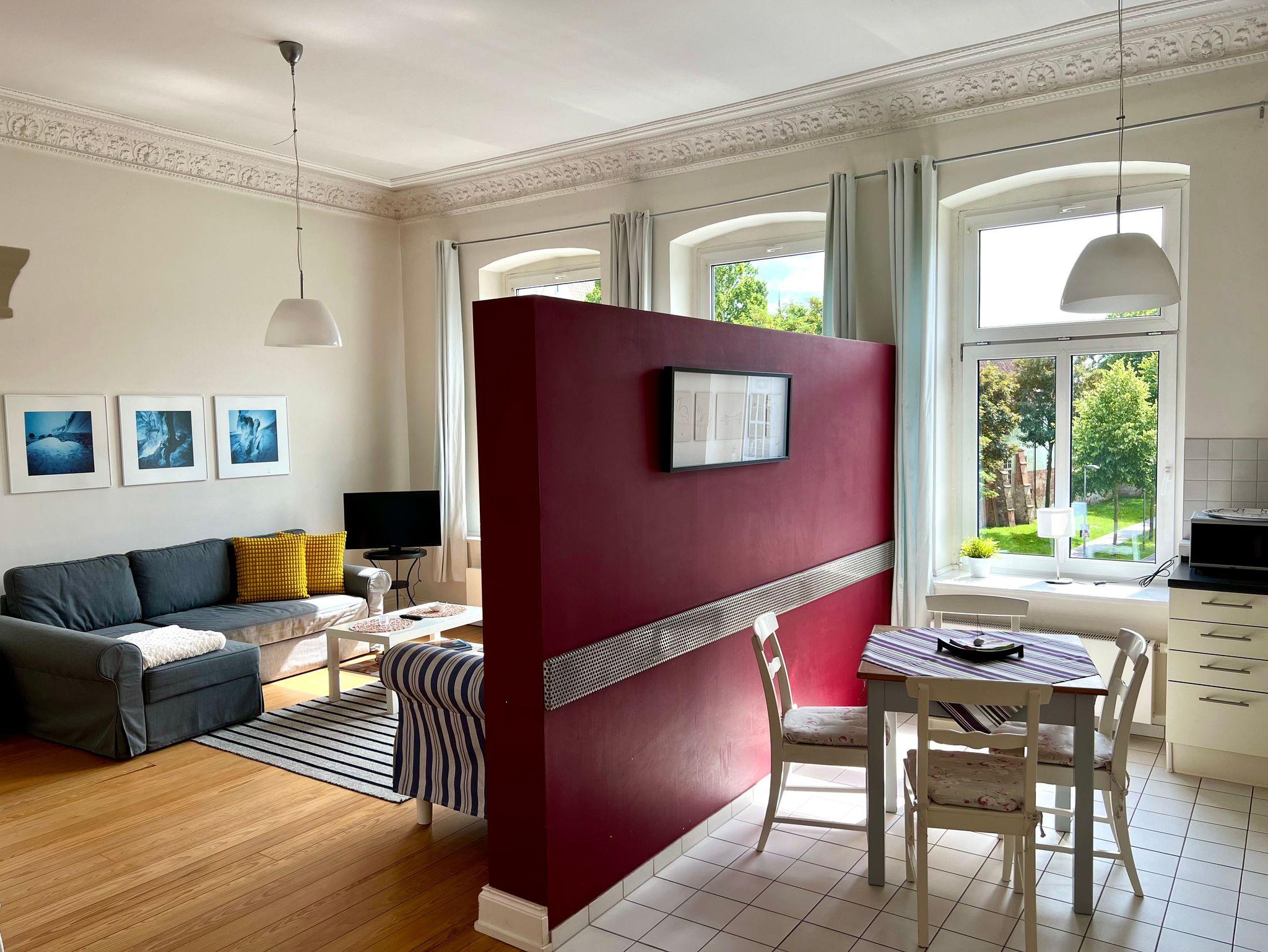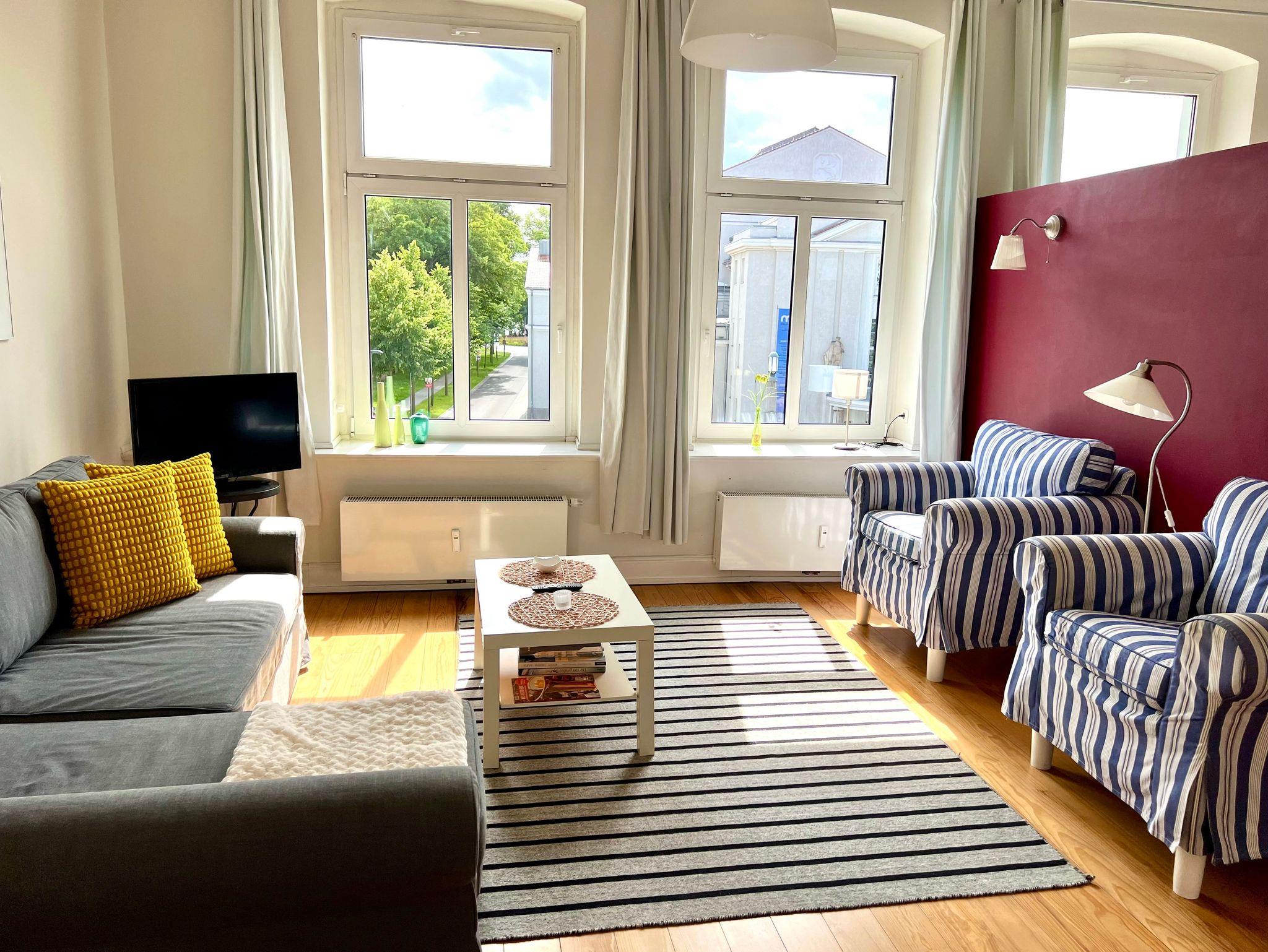 Moderne Ferienwohnung im Jugendstil-Haus auf der Altstadtinsel Stralsunds mit Blick auf Theater und Hafen.