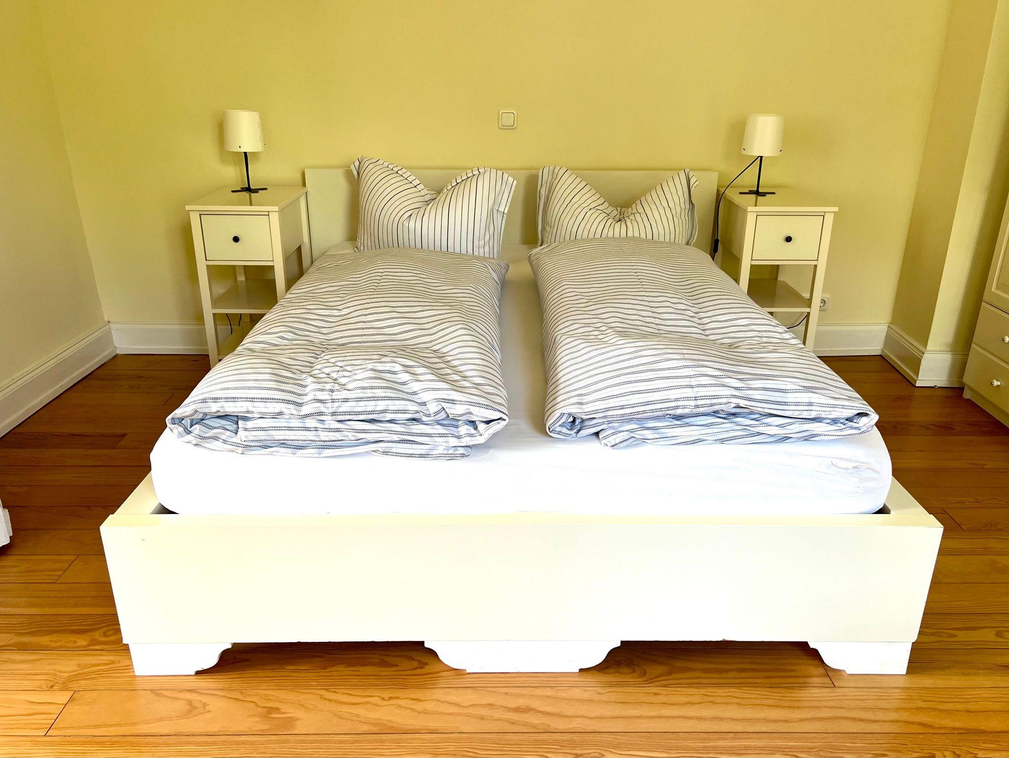 Die Wohnung ist insgesamt 76,84 qm groß und bietet zwei große, helle Wohnräume mit Deckenstuck, eine Küche mit Essplatz, ein Wohnzimmer mit Bettsofa (160 x 200 cm) und Arbeitsplatz, ein Schlafzimmer mit Doppelbett (160 x 200 cm) und Sofa und Dusche/WC mit behindertengerechten Einrichtungen. WLan kostenfrei.