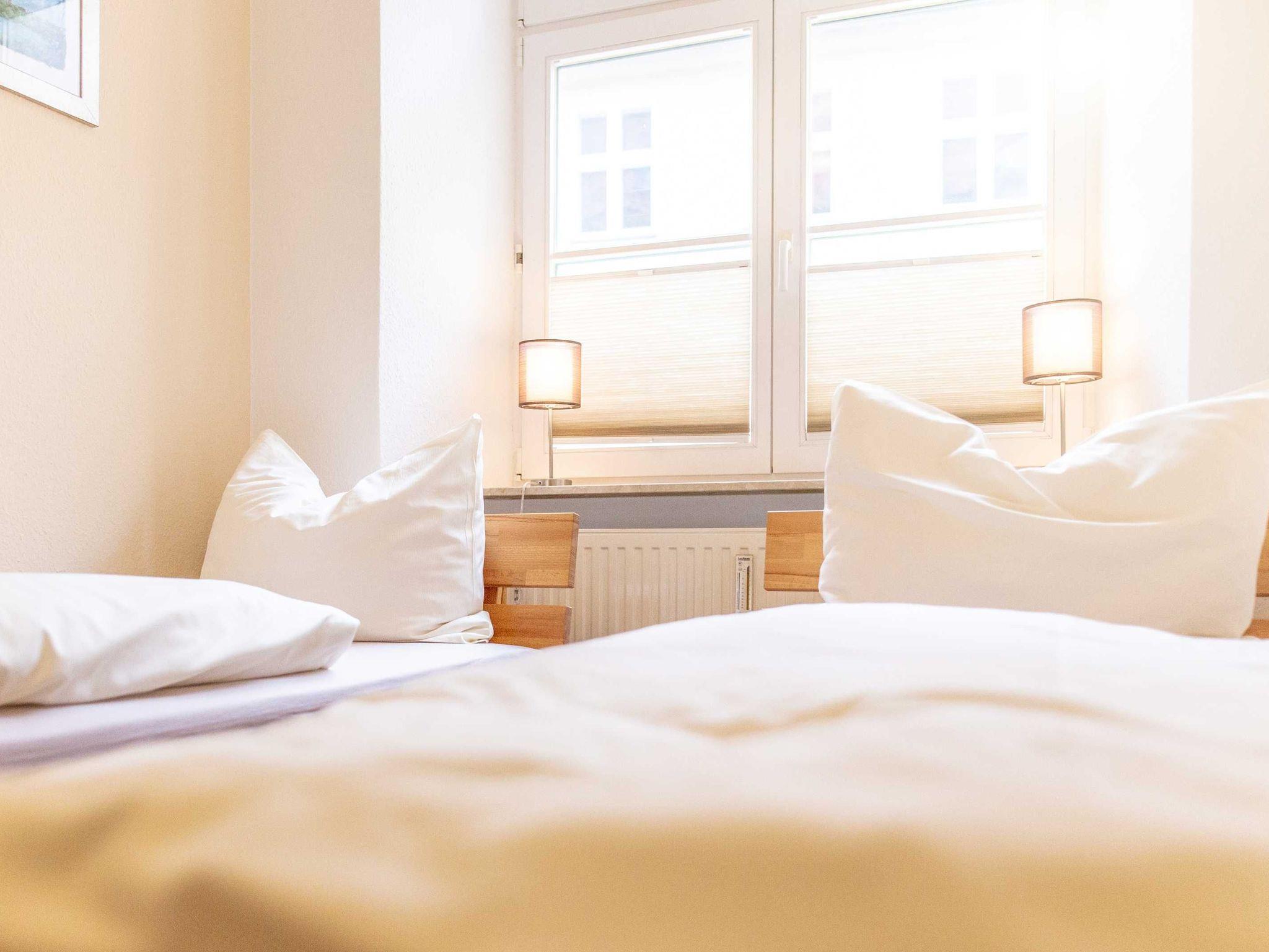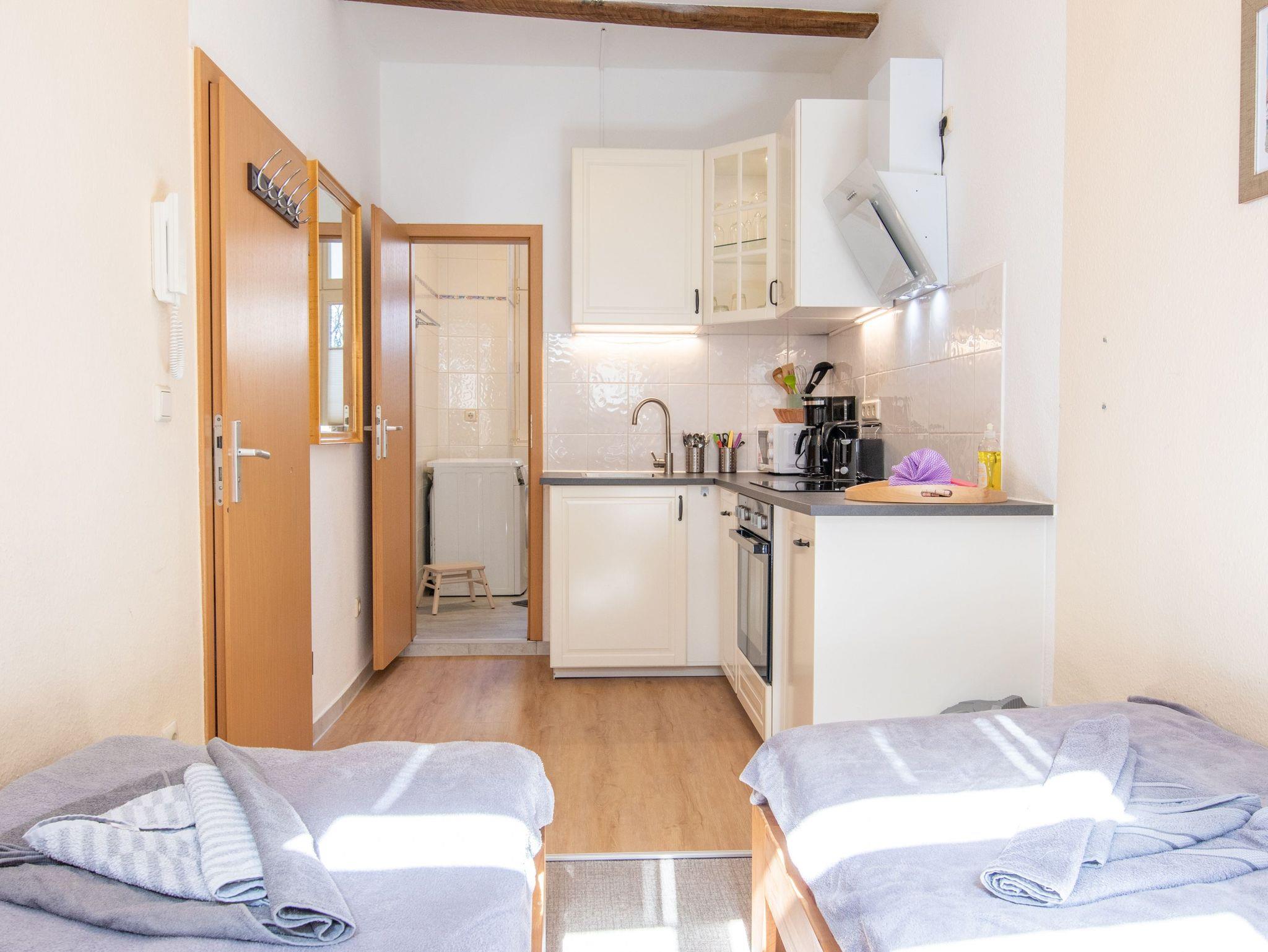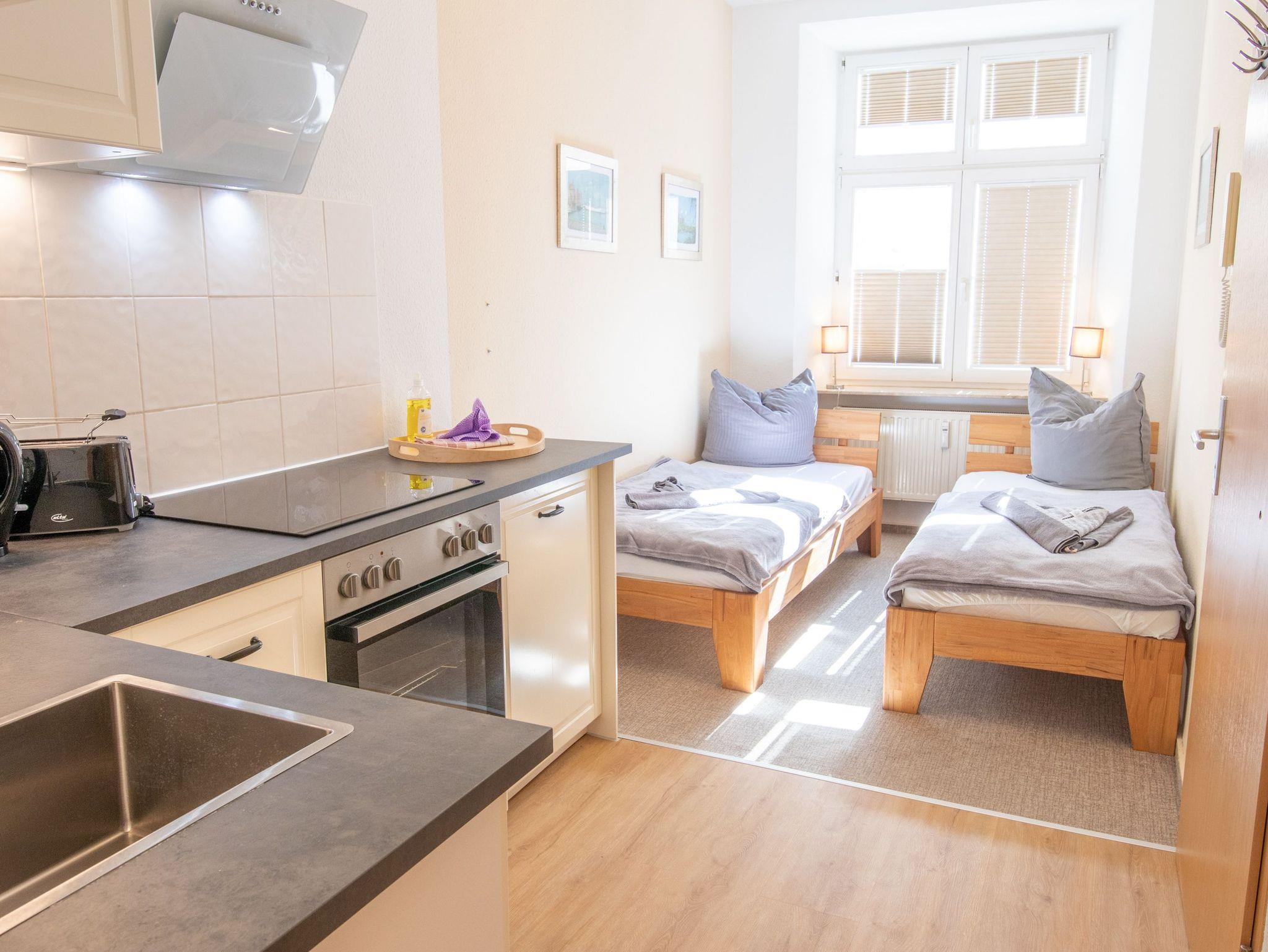 Die Ferienwohnung 1 verfügt auf 35m² Fläche über 2 Räume sowie ein seperates Badezimmer. Die Küche ist mit Spüle, Geschirrspüler, Backofen, Cerankochfeld, Kühlschrank mit Gefrierfach, Wasserkocher, Toaster, Kaffeemaschine, täglichen Küchenhelfern, Besteck, Geschirr etc. ausgestattet. In der Küche befindet sich auch ein Schlafbereich mit zwei zusammenstellbaren Einzelbetten. Der zweite Raum, das Schlafzimmer ist über den öffentlichen, aber sehr ruhigen Hausflur zu erreichen und nur ca. 2 m entfernt. Hier befinden sich ein Doppelbett (180x200cm), Smart-TV und eine gemütliche Sitzecke. Das Badezimmer verfügt über Dusche, WC und Waschbecken.