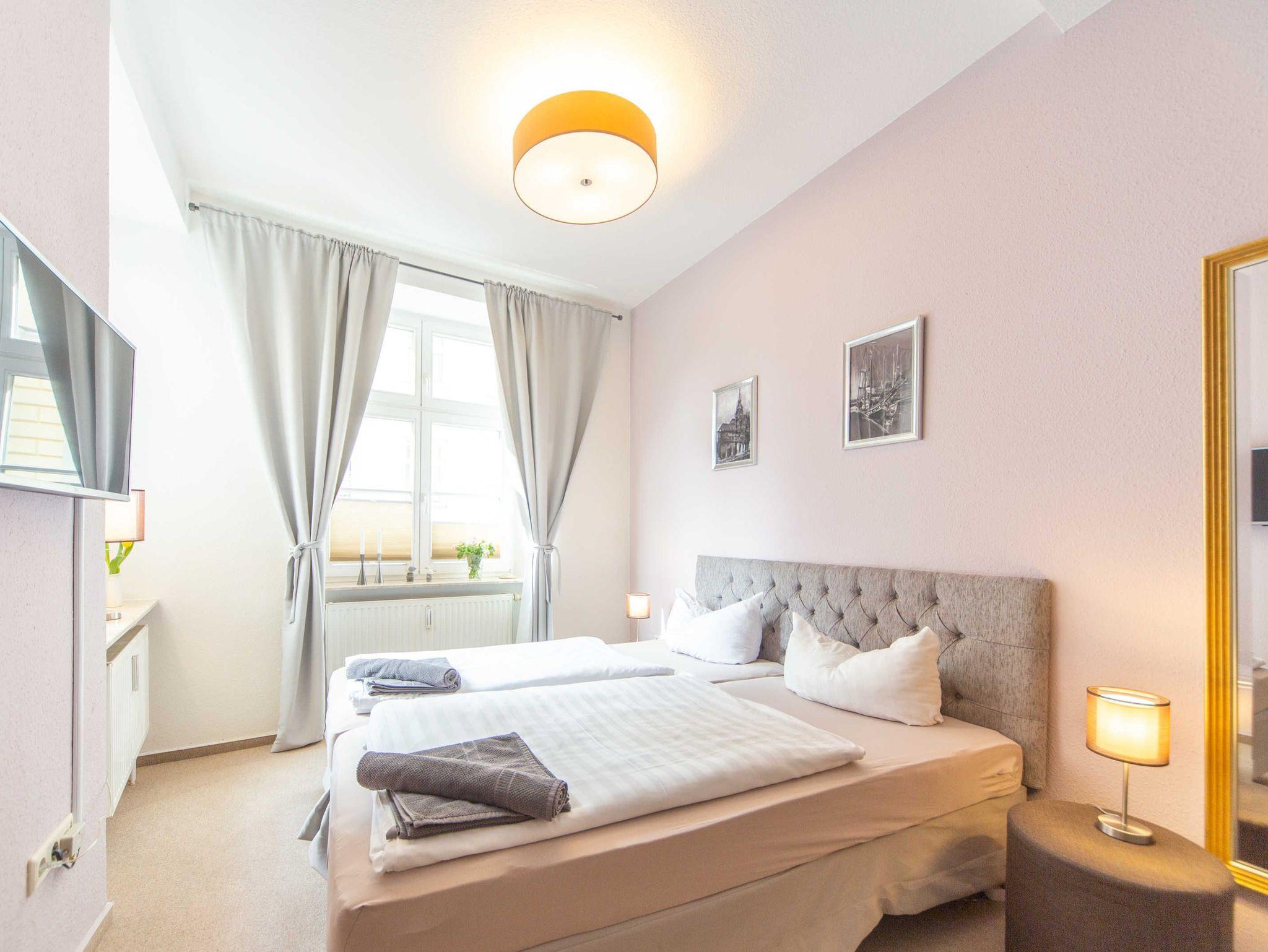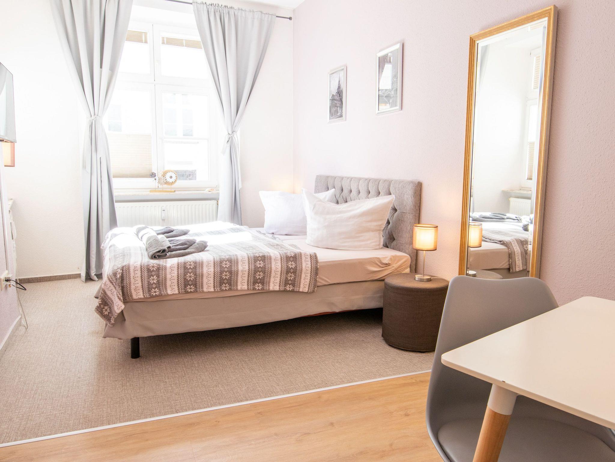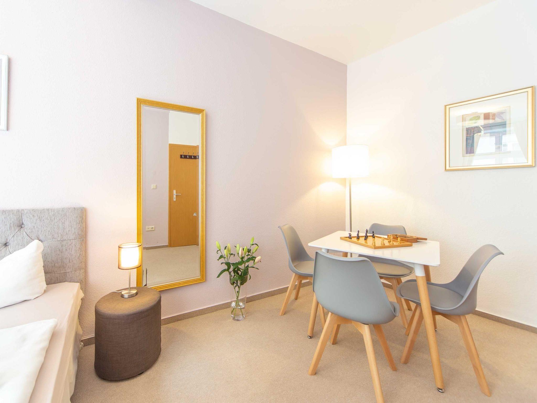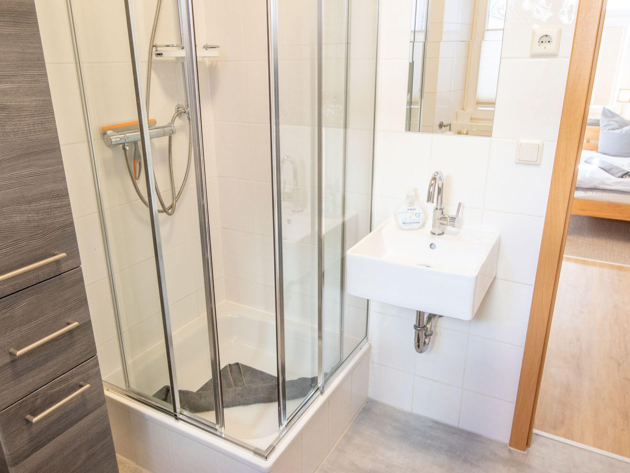 Die Ferienwohnung 1 verfügt auf 35m² Fläche über 2 Räume sowie ein seperates Badezimmer. Die Küche ist mit Spüle, Geschirrspüler, Backofen, Cerankochfeld, Kühlschrank mit Gefrierfach, Wasserkocher, Toaster, Kaffeemaschine, täglichen Küchenhelfern, Besteck, Geschirr etc. ausgestattet. In der Küche befindet sich auch ein Schlafbereich mit zwei zusammenstellbaren Einzelbetten. Der zweite Raum, das Schlafzimmer ist über den öffentlichen, aber sehr ruhigen Hausflur zu erreichen und nur ca. 2 m entfernt. Hier befinden sich ein Doppelbett (180x200cm), Smart-TV und eine gemütliche Sitzecke. Das Badezimmer verfügt über Dusche, WC und Waschbecken.