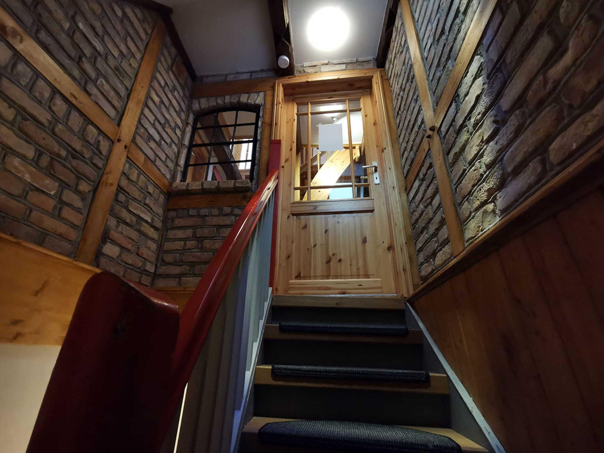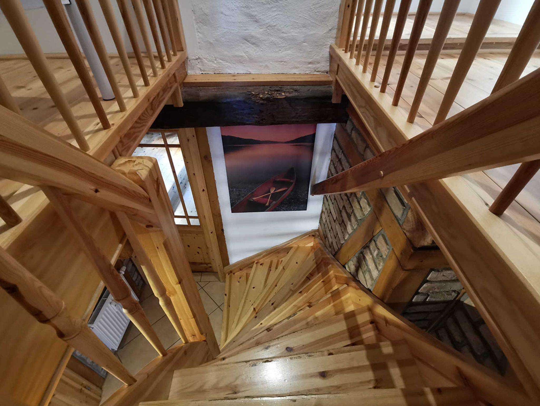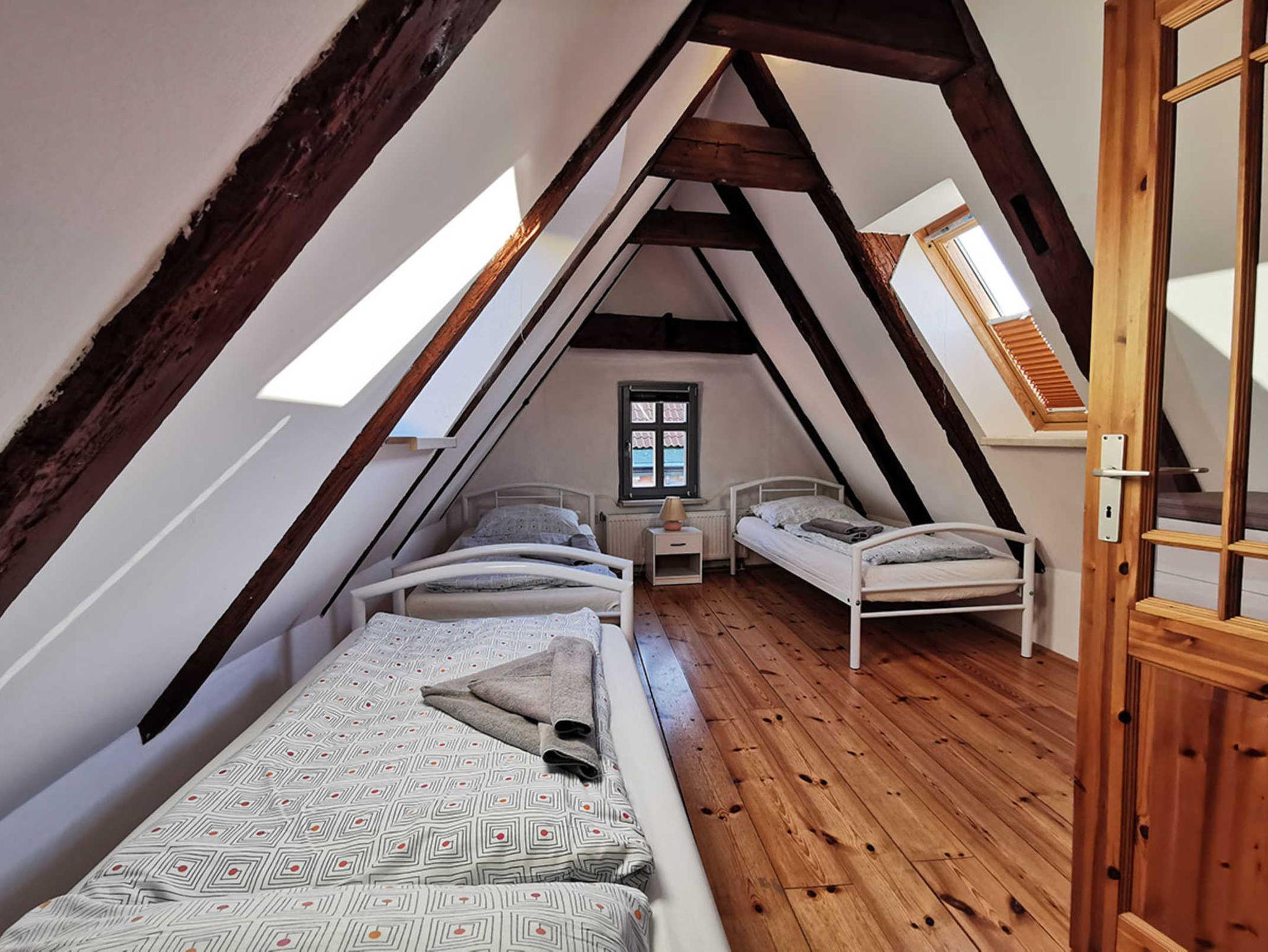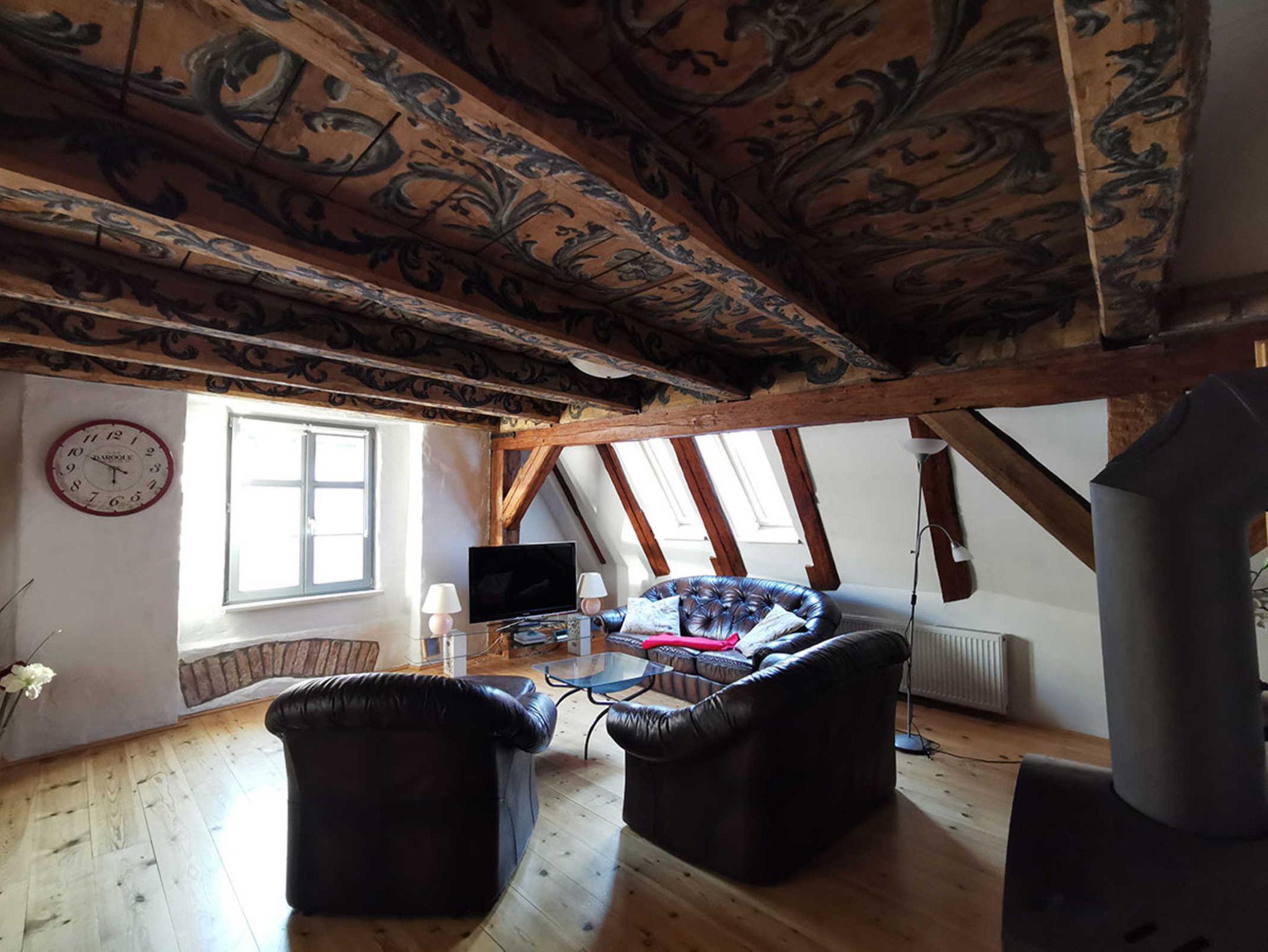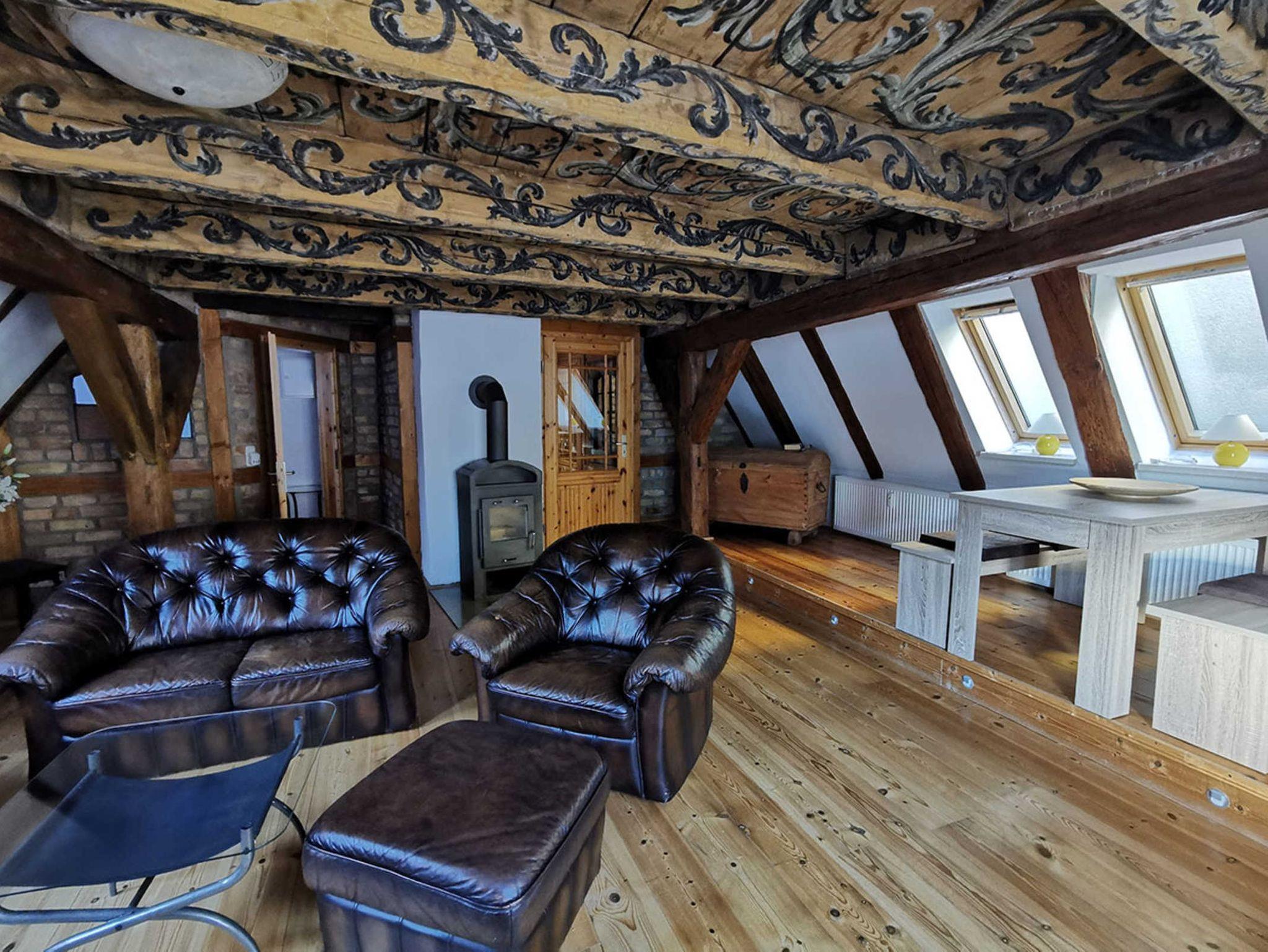 Unsere Ferienwohnung Oberdeck 3 befindet sich in der Frankenstraße 51 im 1. Obergeschoss, über 2 Etagen (110qm, 4 Zimmer) mit Dielen & Fliesen, Dachterrasse, offenes historisches Fachwerk, Blick auf alle Kirchen Stralsunds und Grüner Innenhof. Über die Treppe im Flur erreichen Sie die erste Wohnebene mit einer großen Küche mit Zugang zur Terrasse, 1 Bad, 1 großen Wohnzimmer mit Zugang zu einem Schlafraum mit 1 Einzelbett. In der oberen Etage befinden sich 2 weitere Schlafzimmer, wo sich 6 Einzelbetten befinden und 1 Gäste-WC mit Waschbecken.