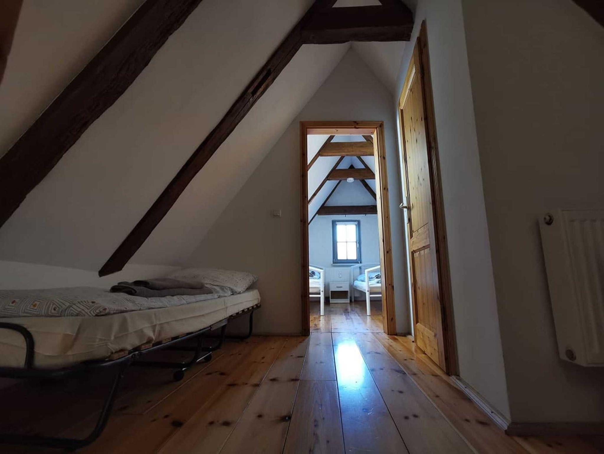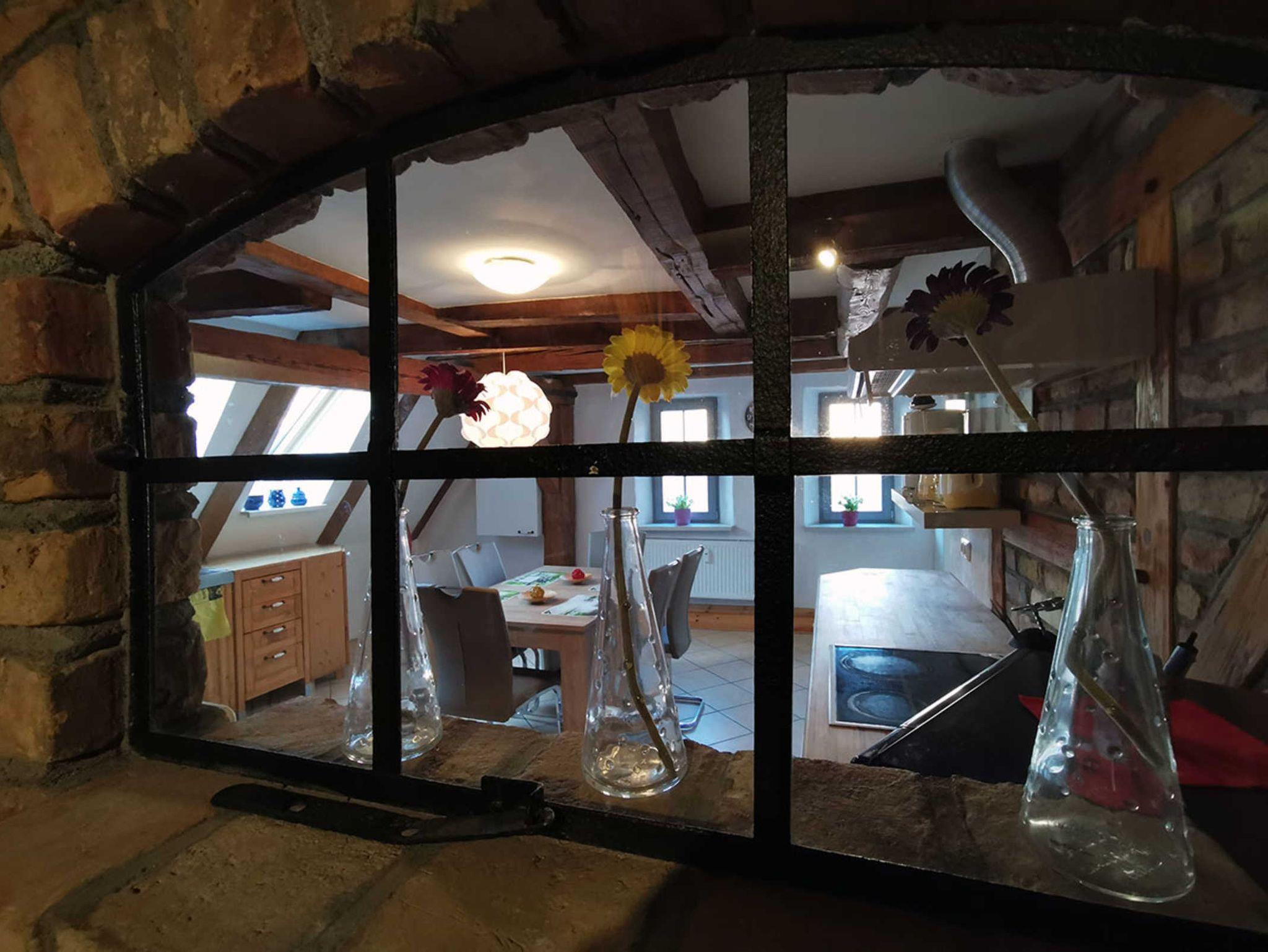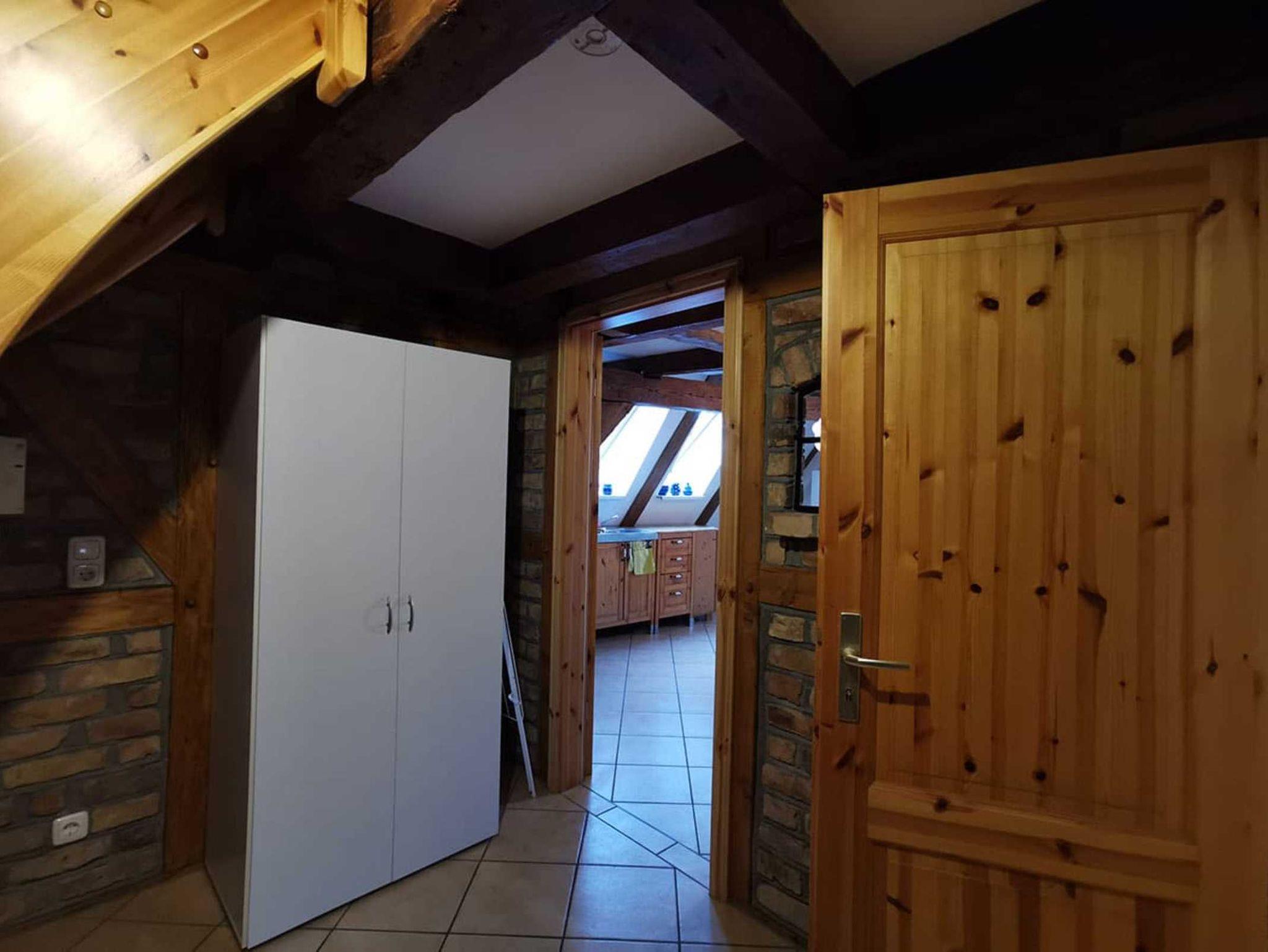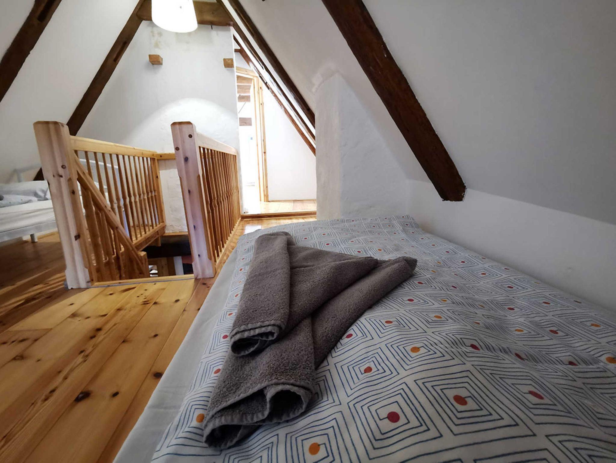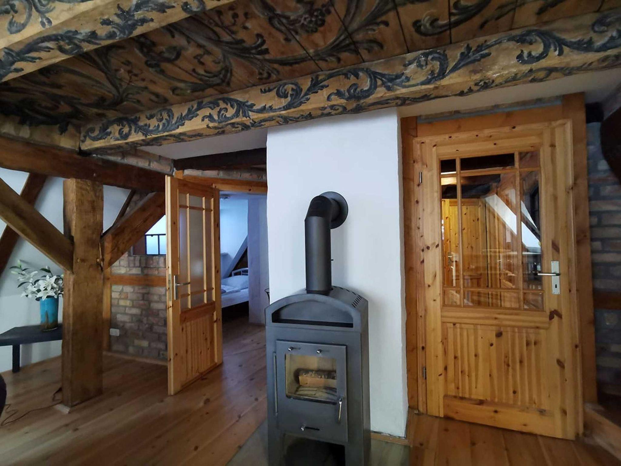 Unsere Ferienwohnung Oberdeck 3 befindet sich in der Frankenstraße 51 im 1. Obergeschoss, über 2 Etagen (110qm, 4 Zimmer) mit Dielen & Fliesen, Dachterrasse, offenes historisches Fachwerk, Blick auf alle Kirchen Stralsunds und Grüner Innenhof. Über die Treppe im Flur erreichen Sie die erste Wohnebene mit einer großen Küche mit Zugang zur Terrasse, 1 Bad, 1 großen Wohnzimmer mit Zugang zu einem Schlafraum mit 1 Einzelbett. In der oberen Etage befinden sich 2 weitere Schlafzimmer, wo sich 6 Einzelbetten befinden und 1 Gäste-WC mit Waschbecken.