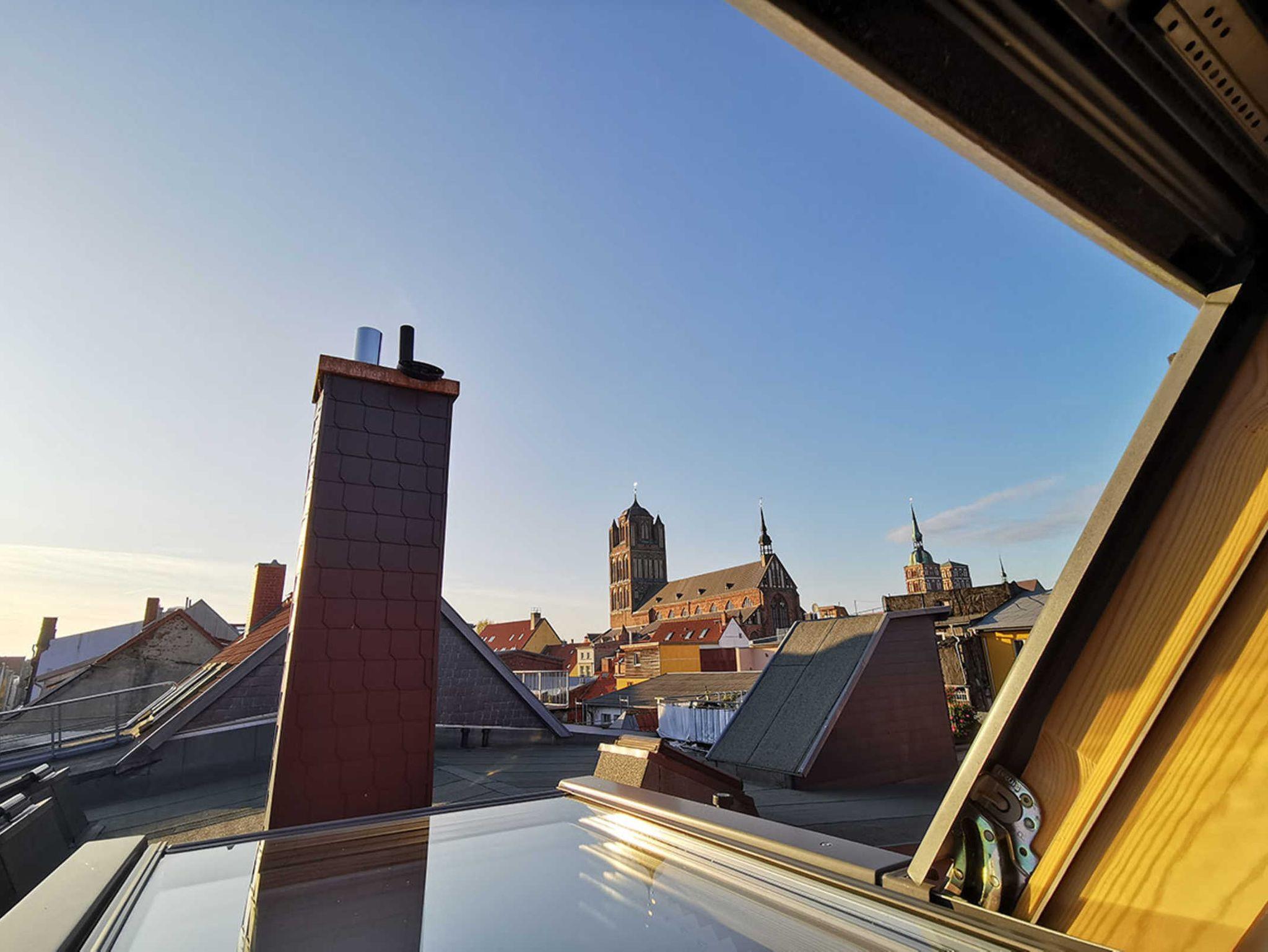 Moderne Ferienwohnung Oberdeck 3 in Stralsund mit Dachterrasse und Blick auf historische Kirchen.