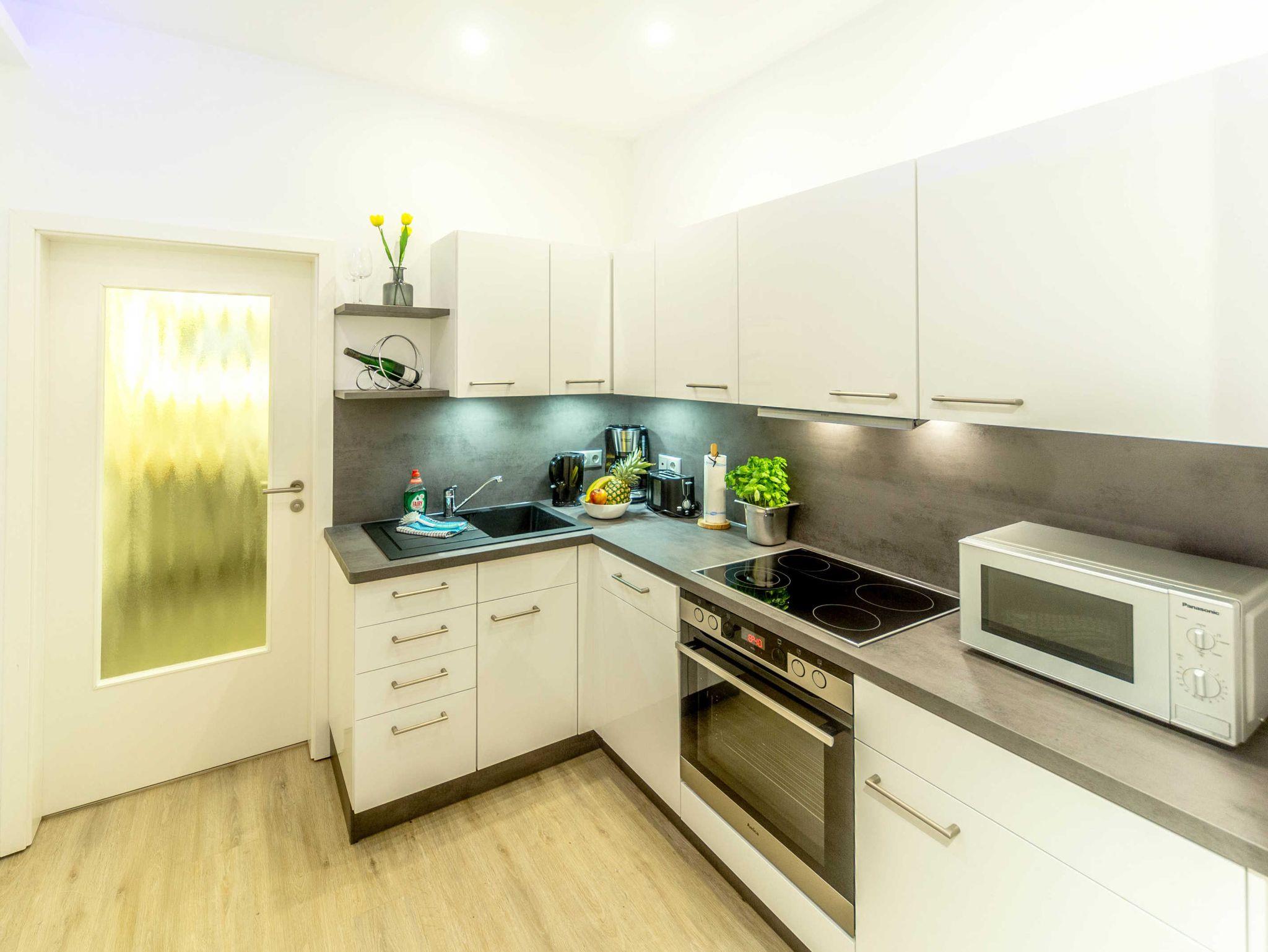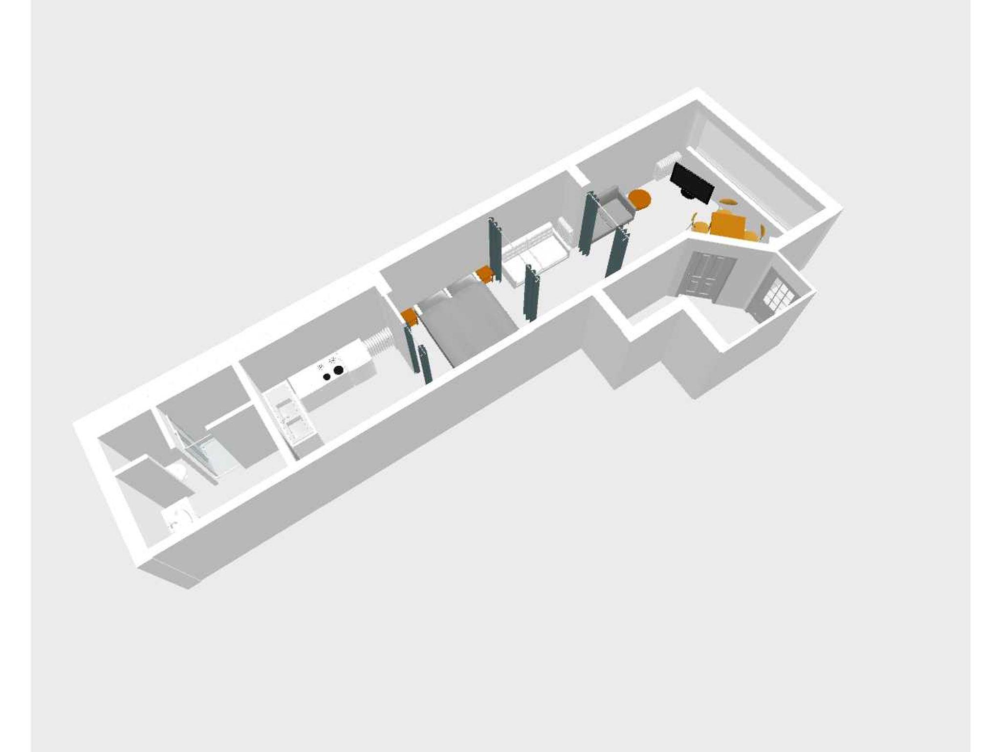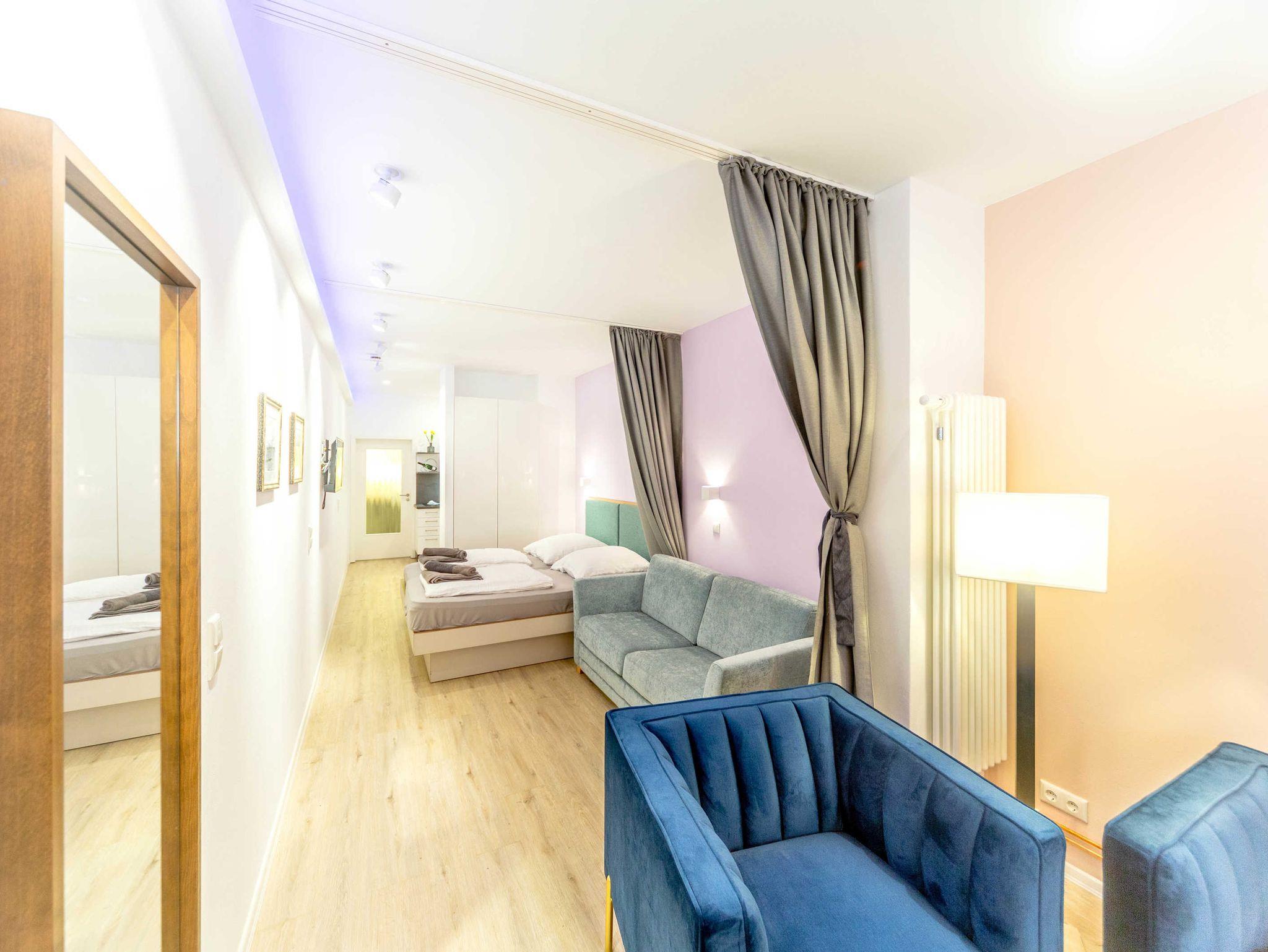 Das sehr stilvoll eingerichtete Altstadtstudio verfügt auf 45m² Fläche über 1 Wohn-und Essbereich sowie 2 abtrennbare Schlafbereiche, eine Küche und ein Badezimmer. Man betritt die Ferienwohnung im Wohnbereich mit großer Fensterfront. Das Zimmer ist modern und gemütlich mit Sofa und Sessel, Sitzgruppe mit kleinem Tisch für 4 Personen, TV und Radio ausgestattet. Das erste Schlafzimmer verfügt über ein Doppelbett (180x200cm), Smart-TV und einen Kleiderschrank. Das zweite Schlafzimmer ist mit einem Schlafsofa (150x200cm) ausgestattet. Die Bereiche können mittels Schaalvorhängen separiert werden. Durch die beiden Schlafbereiche kommt man in die vollwertige Küche und ins Bad. Die Küche ist mit Spüle, Geschirrspüler, Backofen, Cerankochfeld, Kühlschrank mit Gefrierfach, Wasserkocher, Toaster, Tassimo Kaffeemaschine, täglichen Küchenhelfern, Besteck, Geschirr etc. ausgestattet. Das hochwertige Badezimmer ist separat abschließbar und bietet eine großzügige Dusche (100x160cm), WC und Waschbecken.