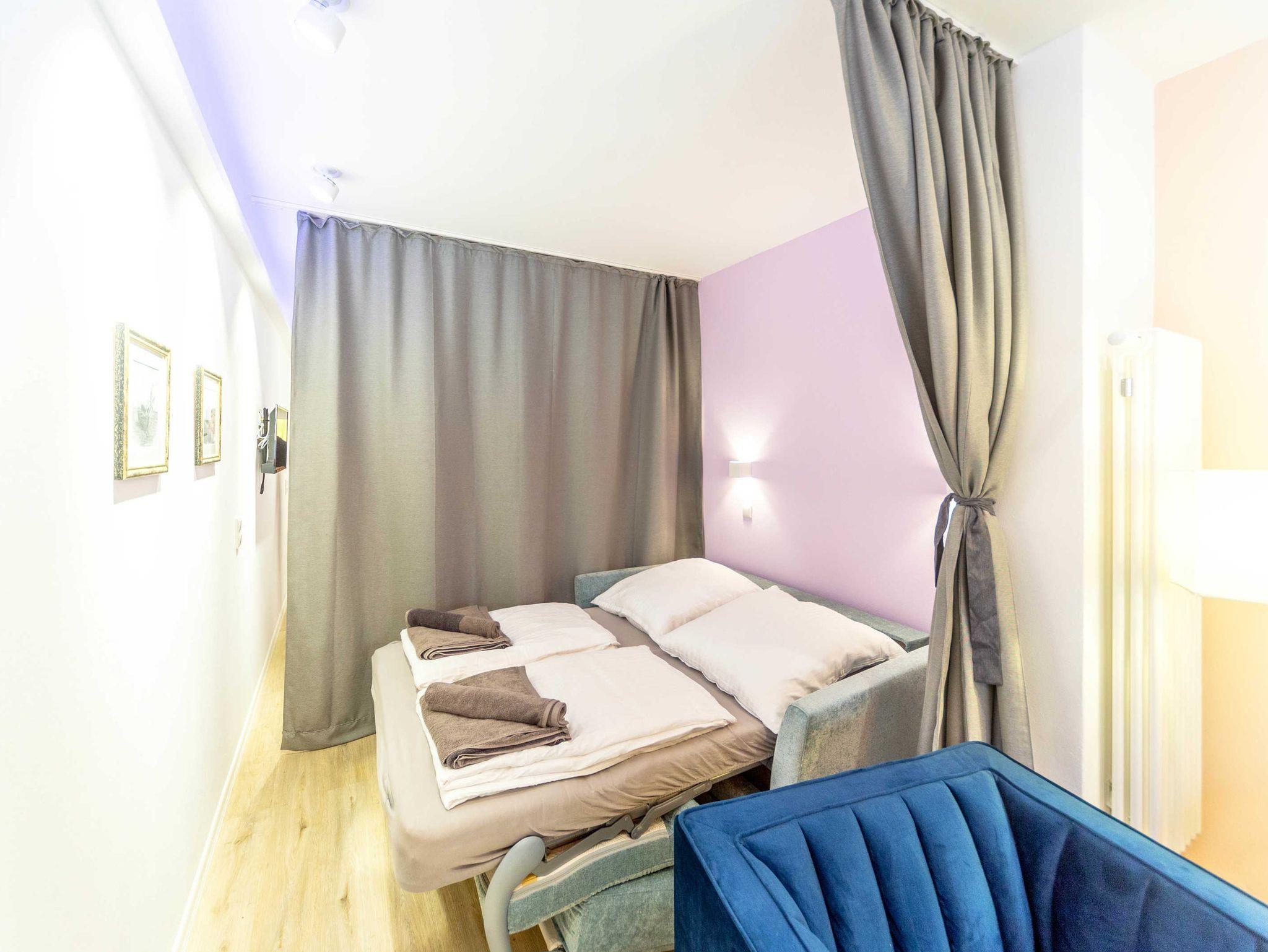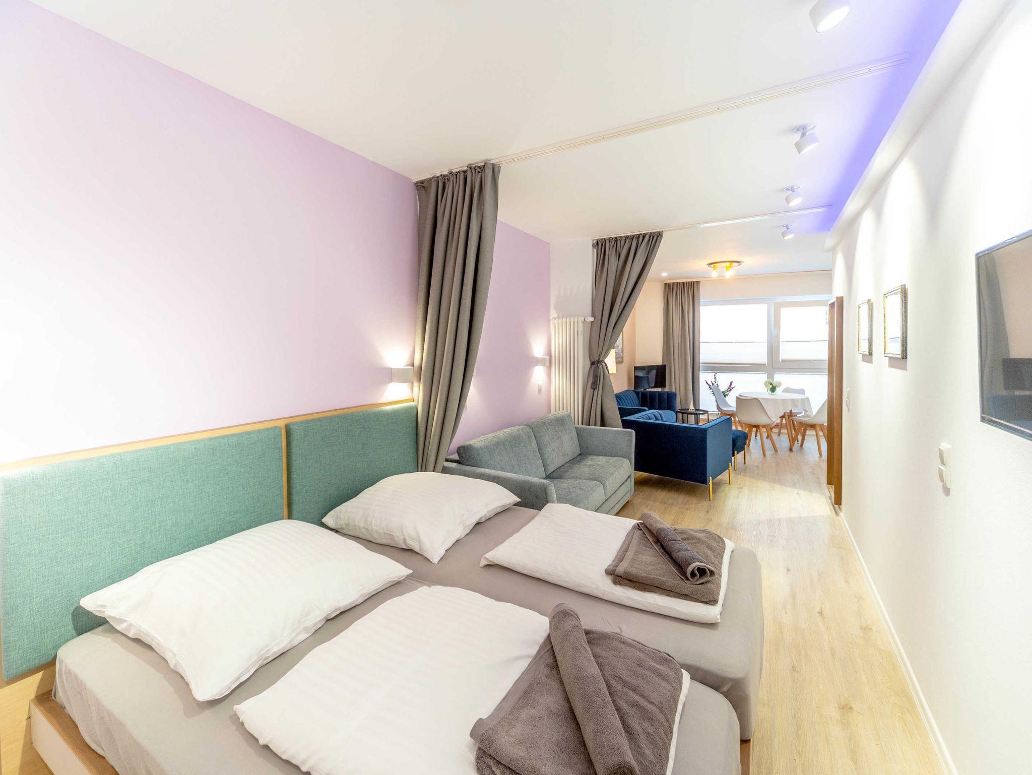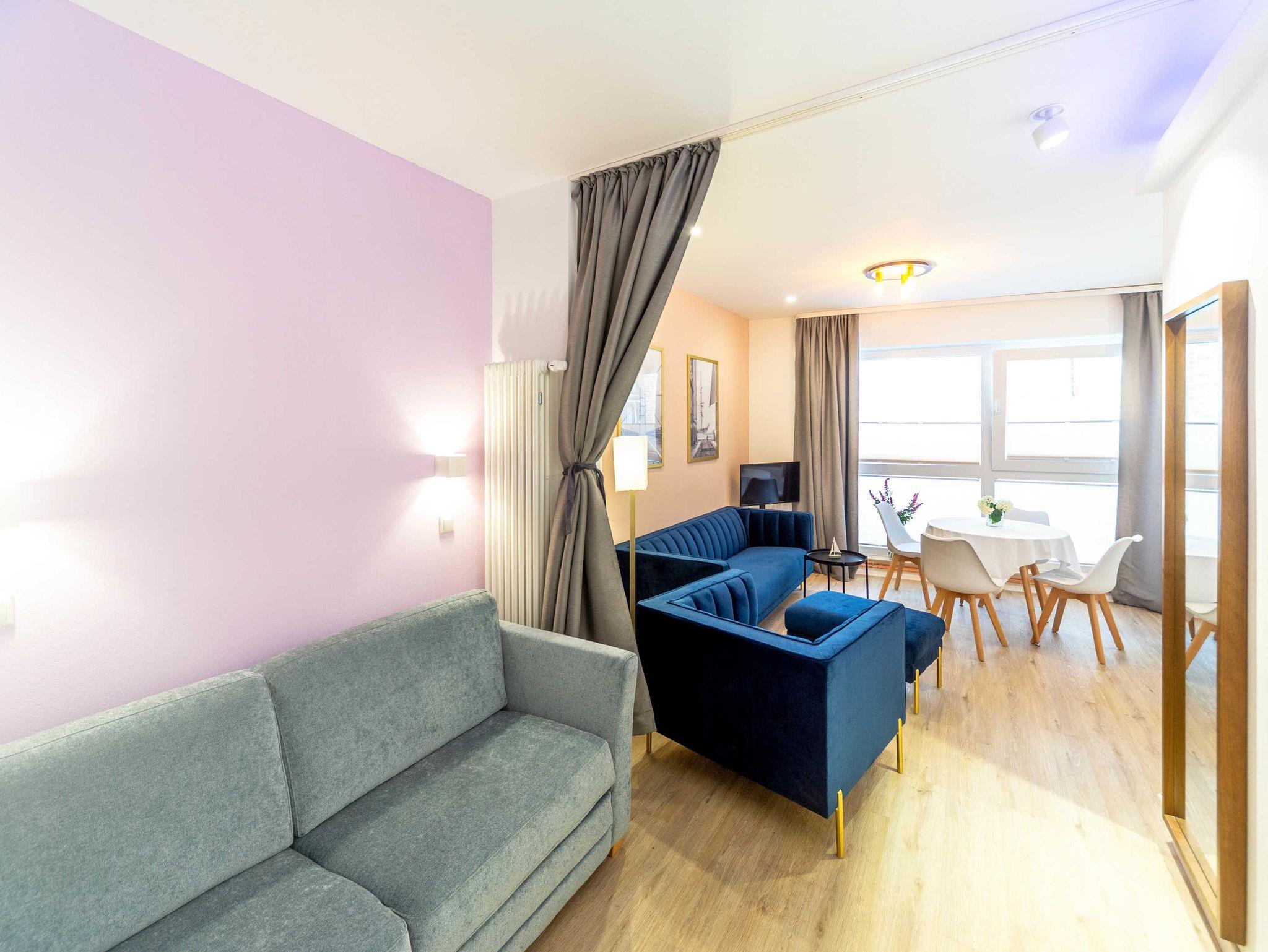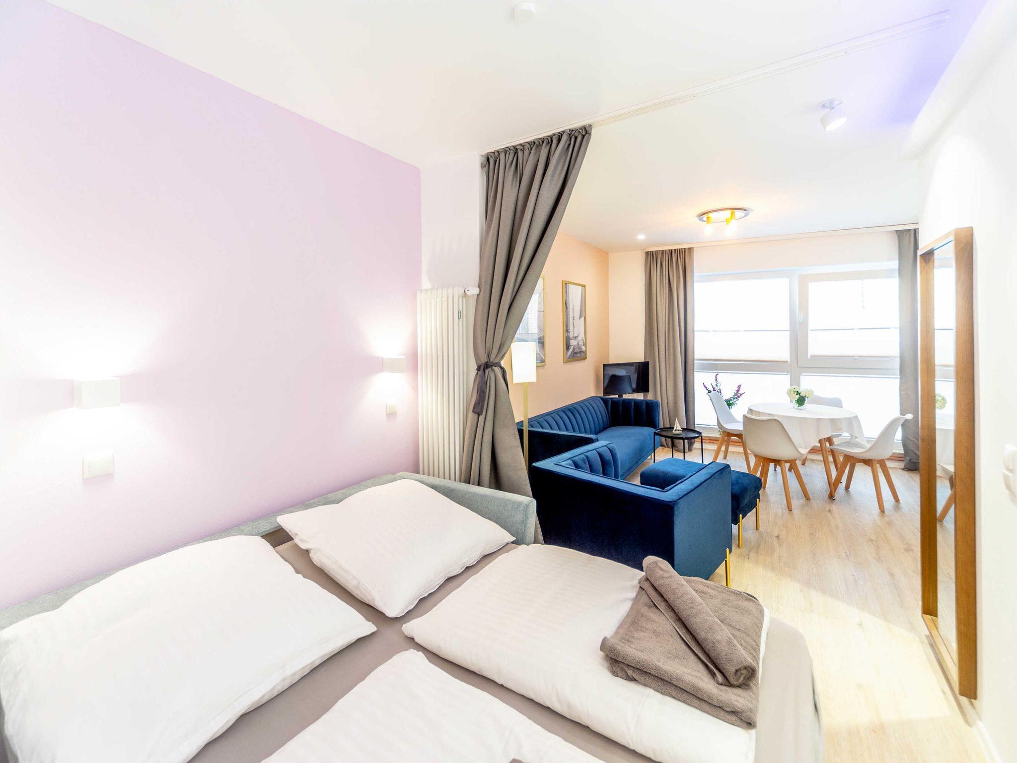 Stilvolles Altstadtstudio in Stralsund mit modernem Wohnbereich und zwei abtrennbaren Schlafbereichen.