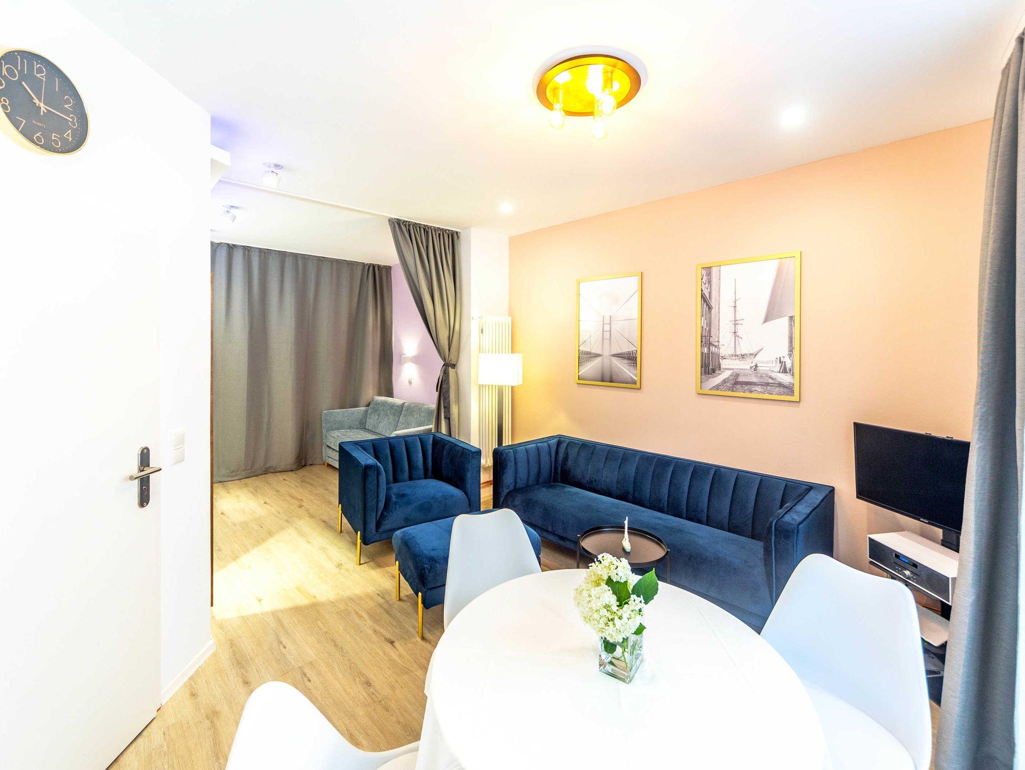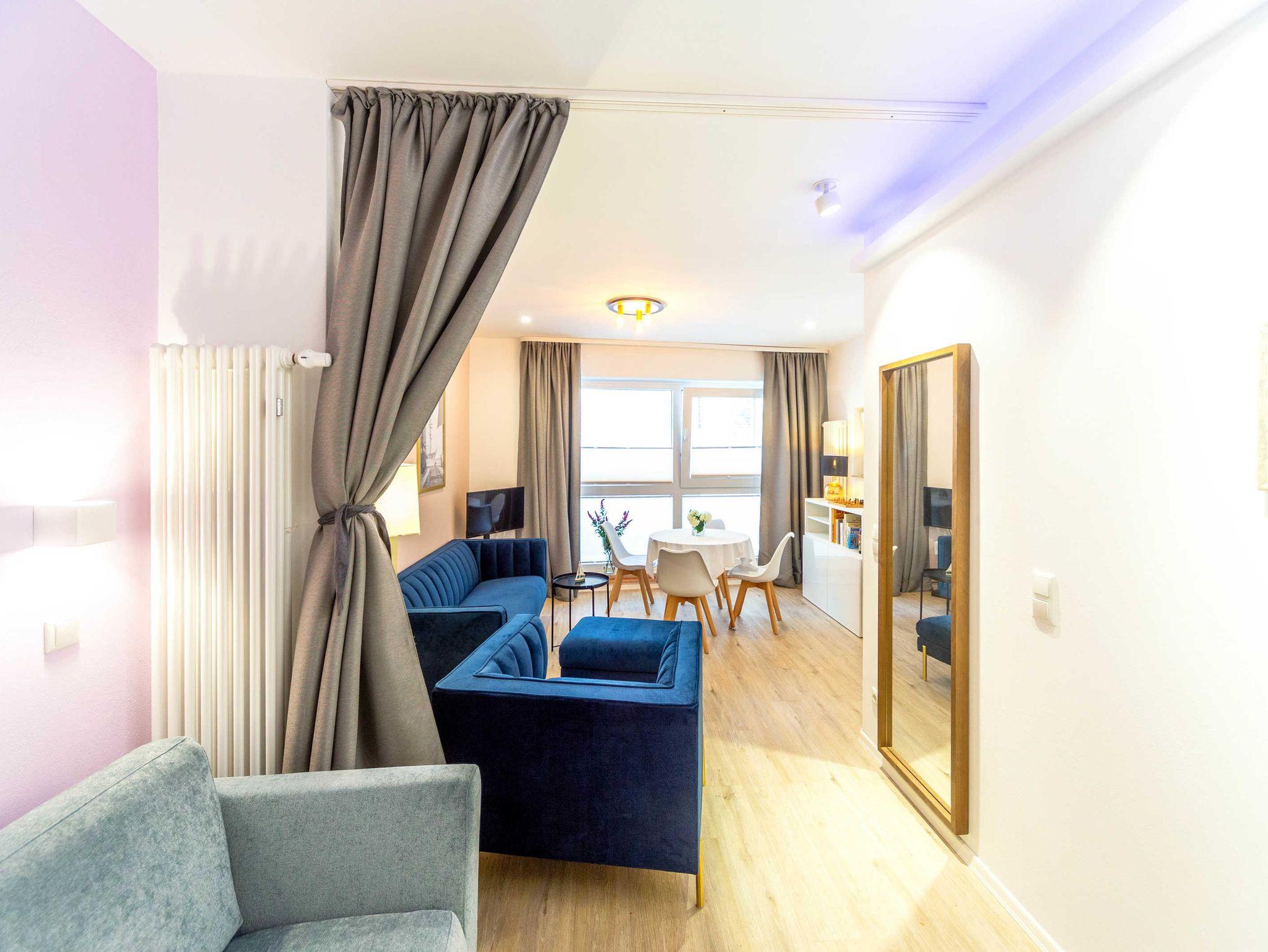Das sehr stilvoll eingerichtete Altstadtstudio verfügt auf 45m² Fläche über 1 Wohn-und Essbereich sowie 2 abtrennbare Schlafbereiche, eine Küche und ein Badezimmer. Man betritt die Ferienwohnung im Wohnbereich mit großer Fensterfront. Das Zimmer ist modern und gemütlich mit Sofa und Sessel, Sitzgruppe mit kleinem Tisch für 4 Personen, TV und Radio ausgestattet. Das erste Schlafzimmer verfügt über ein Doppelbett (180x200cm), Smart-TV und einen Kleiderschrank. Das zweite Schlafzimmer ist mit einem Schlafsofa (150x200cm) ausgestattet. Die Bereiche können mittels Schaalvorhängen separiert werden. Durch die beiden Schlafbereiche kommt man in die vollwertige Küche und ins Bad. Die Küche ist mit Spüle, Geschirrspüler, Backofen, Cerankochfeld, Kühlschrank mit Gefrierfach, Wasserkocher, Toaster, Tassimo Kaffeemaschine, täglichen Küchenhelfern, Besteck, Geschirr etc. ausgestattet. Das hochwertige Badezimmer ist separat abschließbar und bietet eine großzügige Dusche (100x160cm), WC, Waschmaschine und Waschbecken.