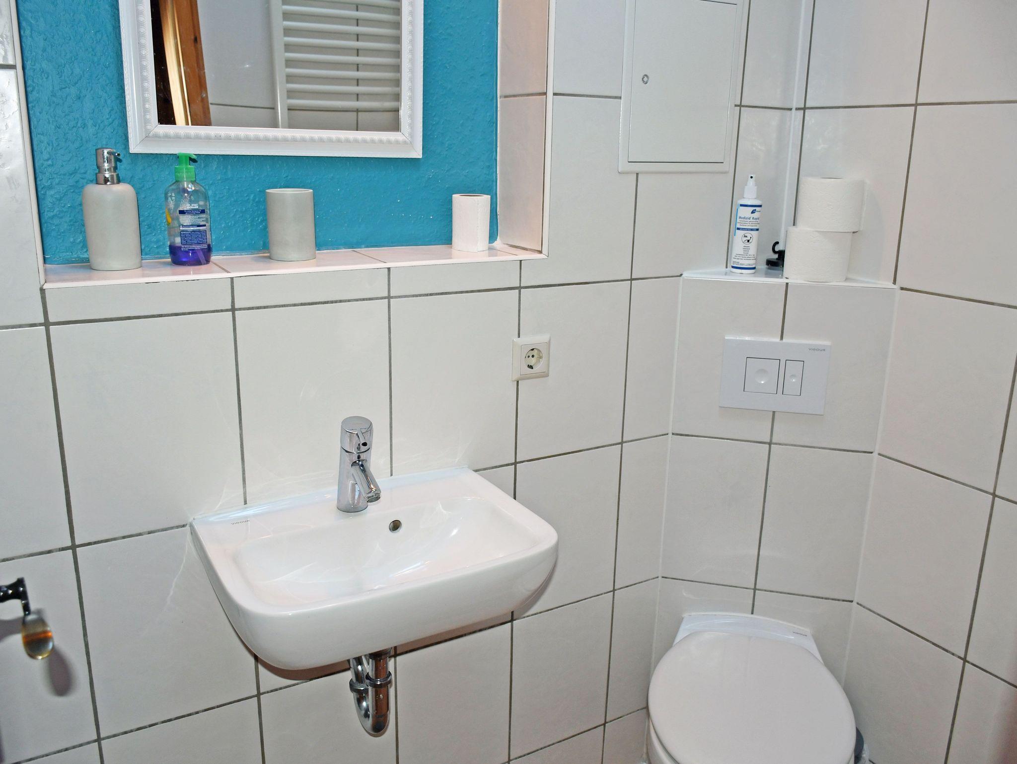 Im Obergeschoss liegt auch ein kleines Bad mit Waschbecken und Dusche.