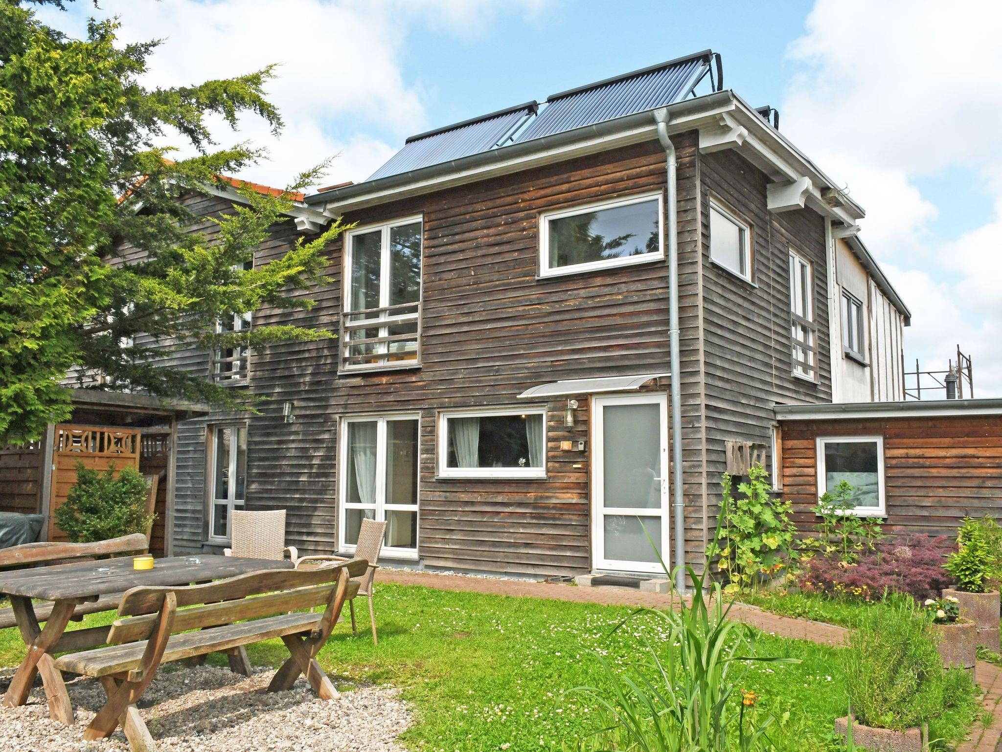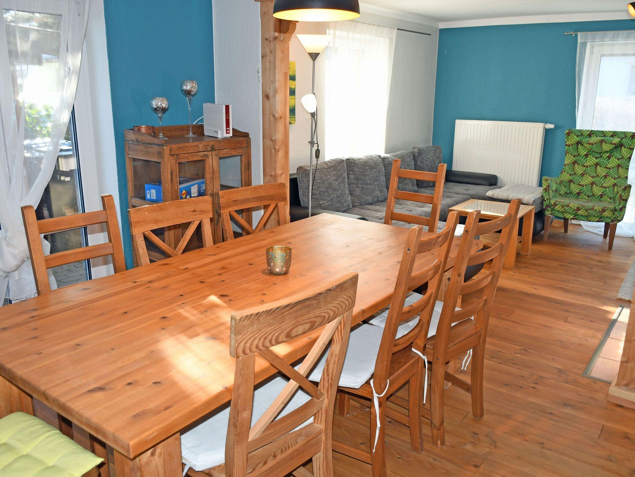 Es ist ca. 120 qm groß, hat Platz für maximal 10 Erwachsene und zwei Kinder bis 3 J. im Kinderreisebett. Im Erdgeschoss liegt der Wohnraum mit bequemer Sitzcouch mit Tisch und einem modernen Flachbild-TV-Gerät. Ein Kamin sorgt auch in der kühleren Jahreszeit für Behaglichkeit. Hier steht auch ein großer Esstisch mit Stühlen.