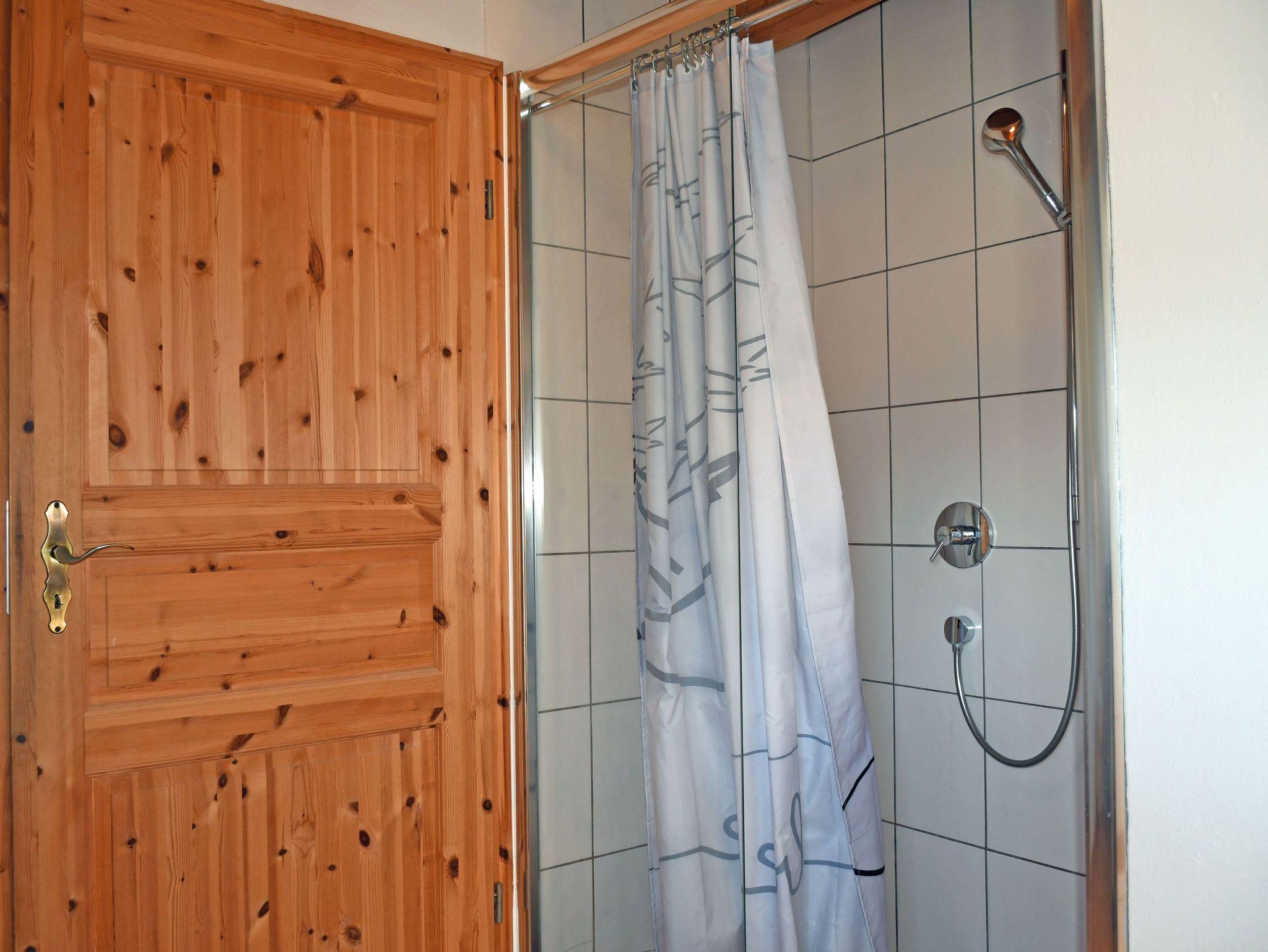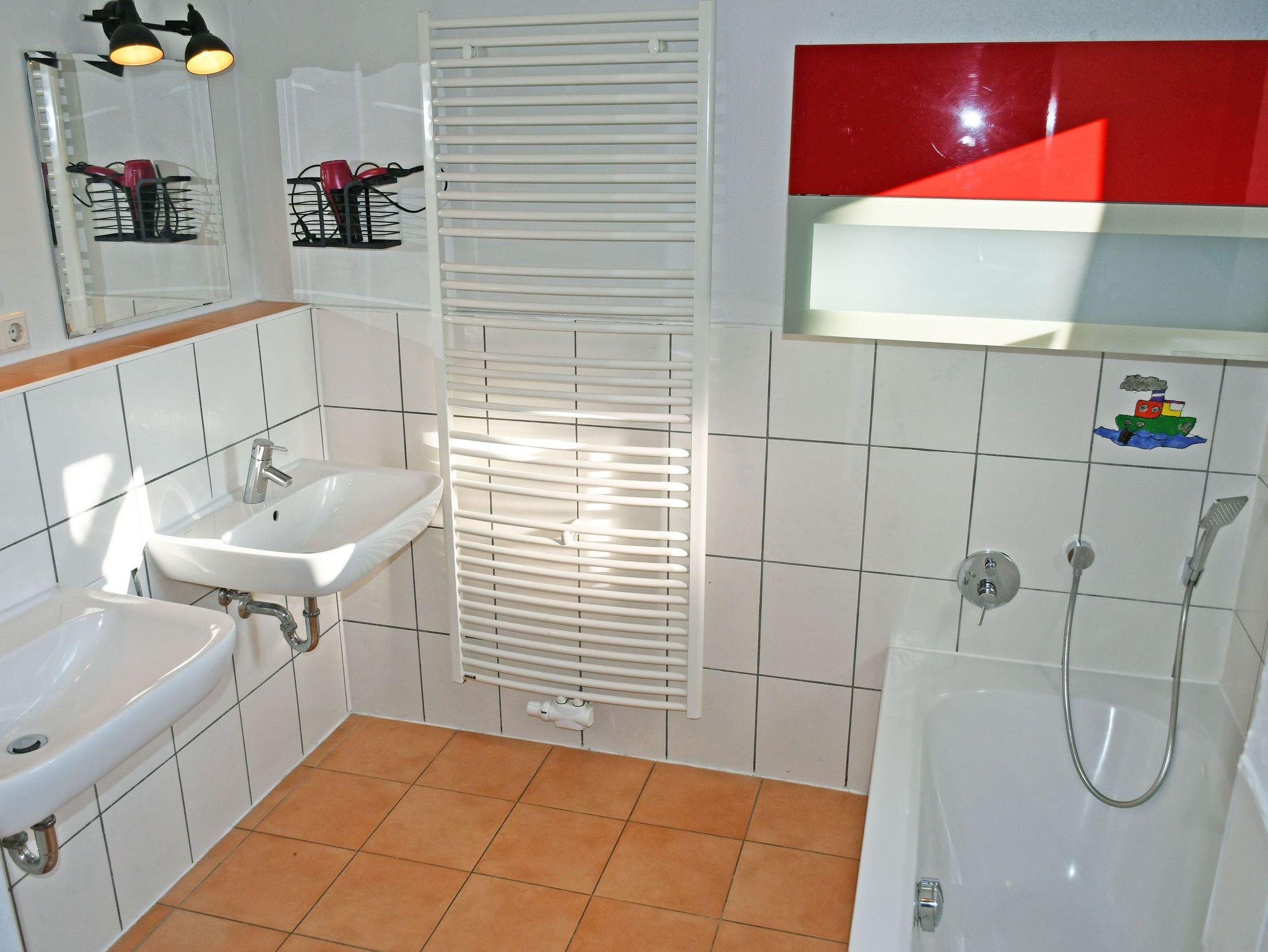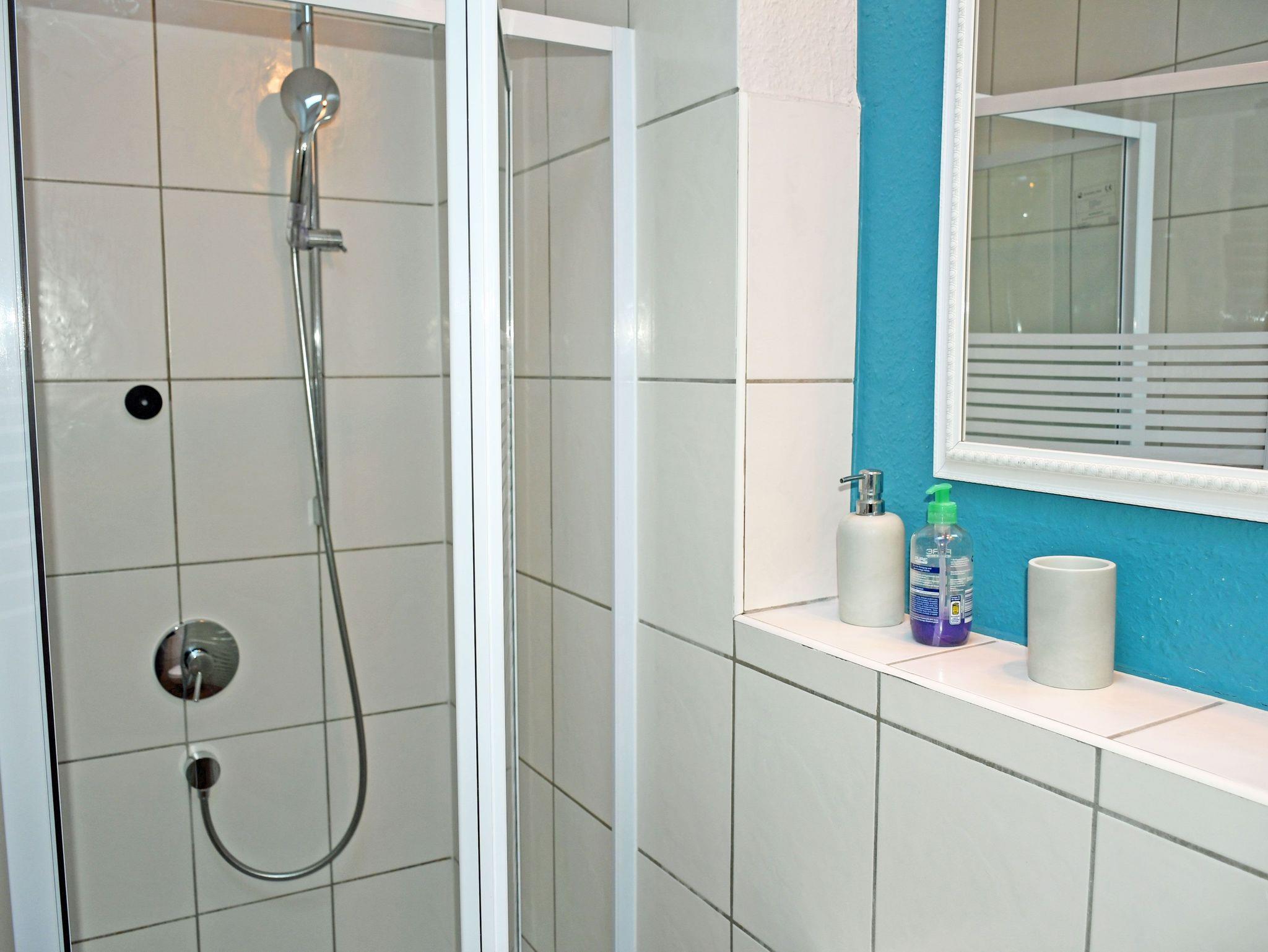 Das im Erdgeschoss liegende Bad ist mit Dusche, Badewanne, Haartrockner, WC und Waschtisch ausgestattet, es hat Fenster und Tageslicht.