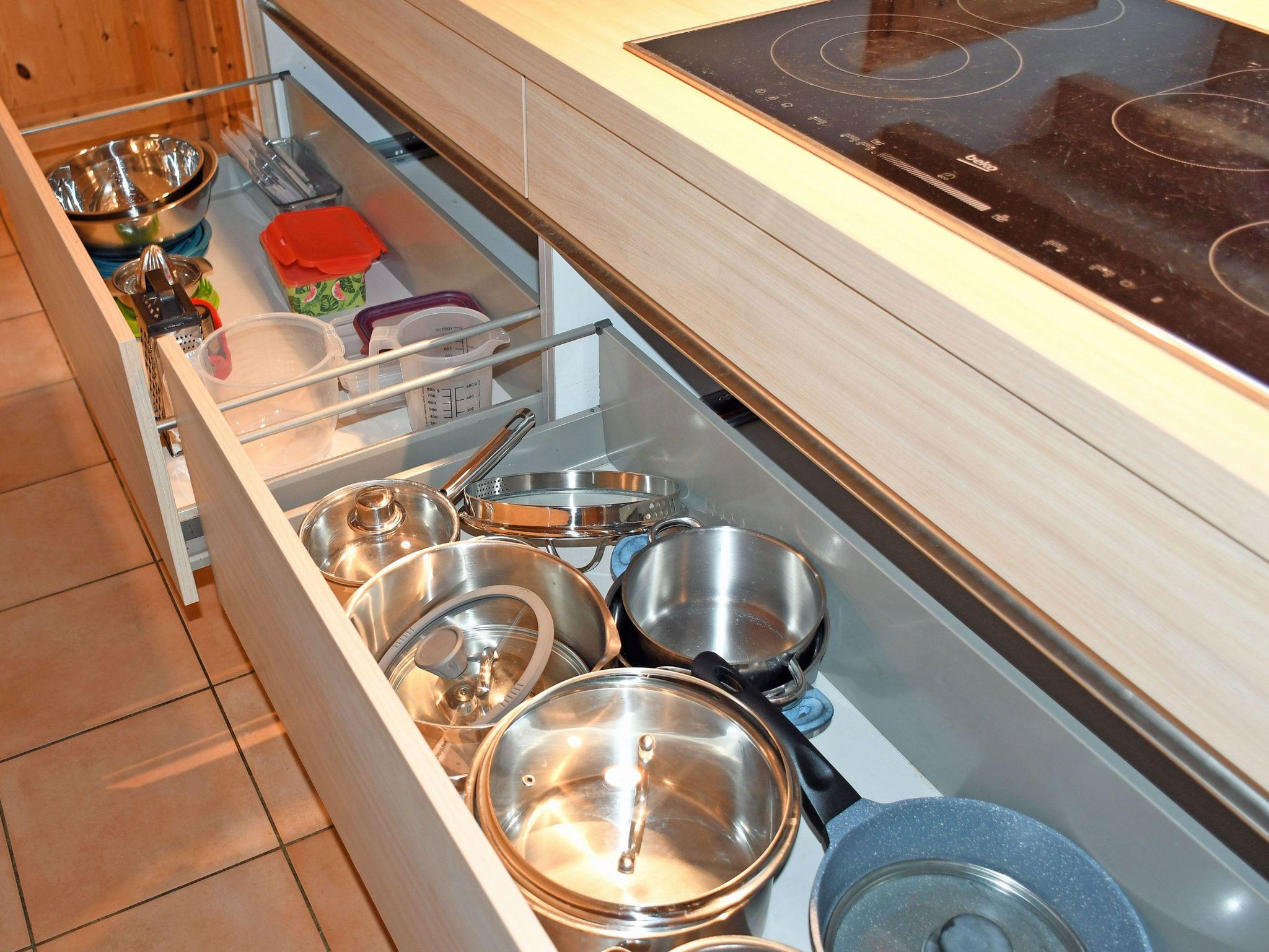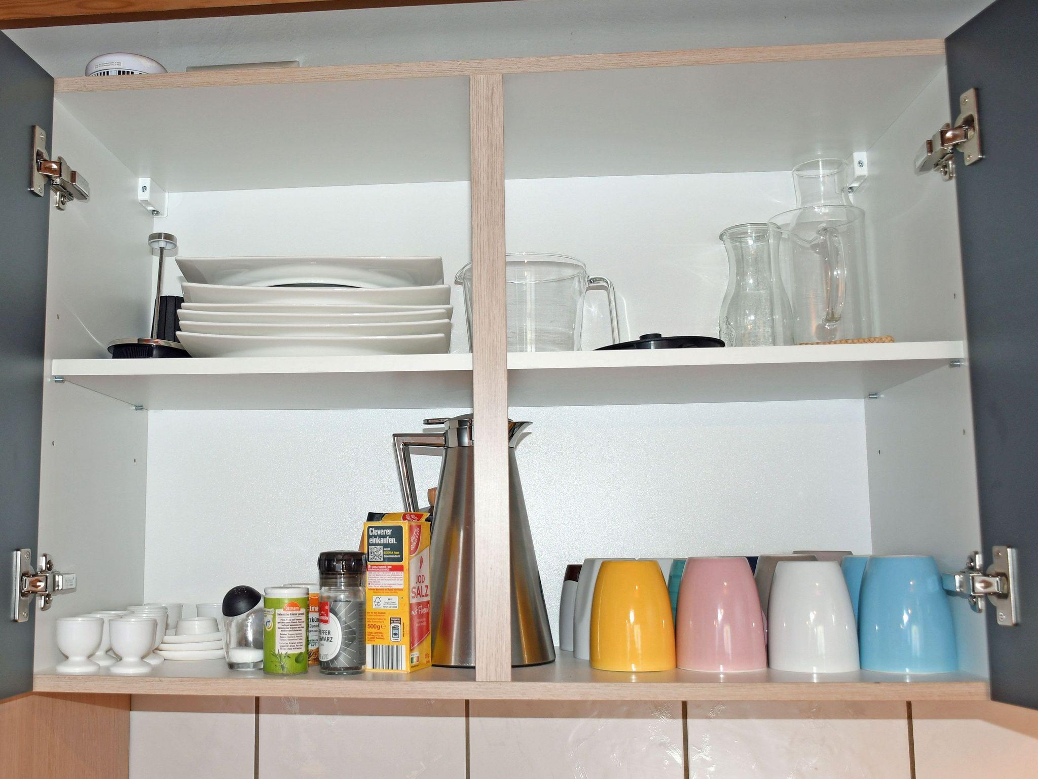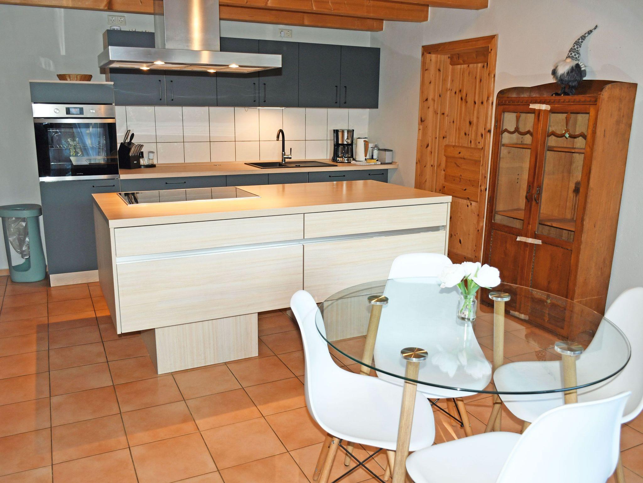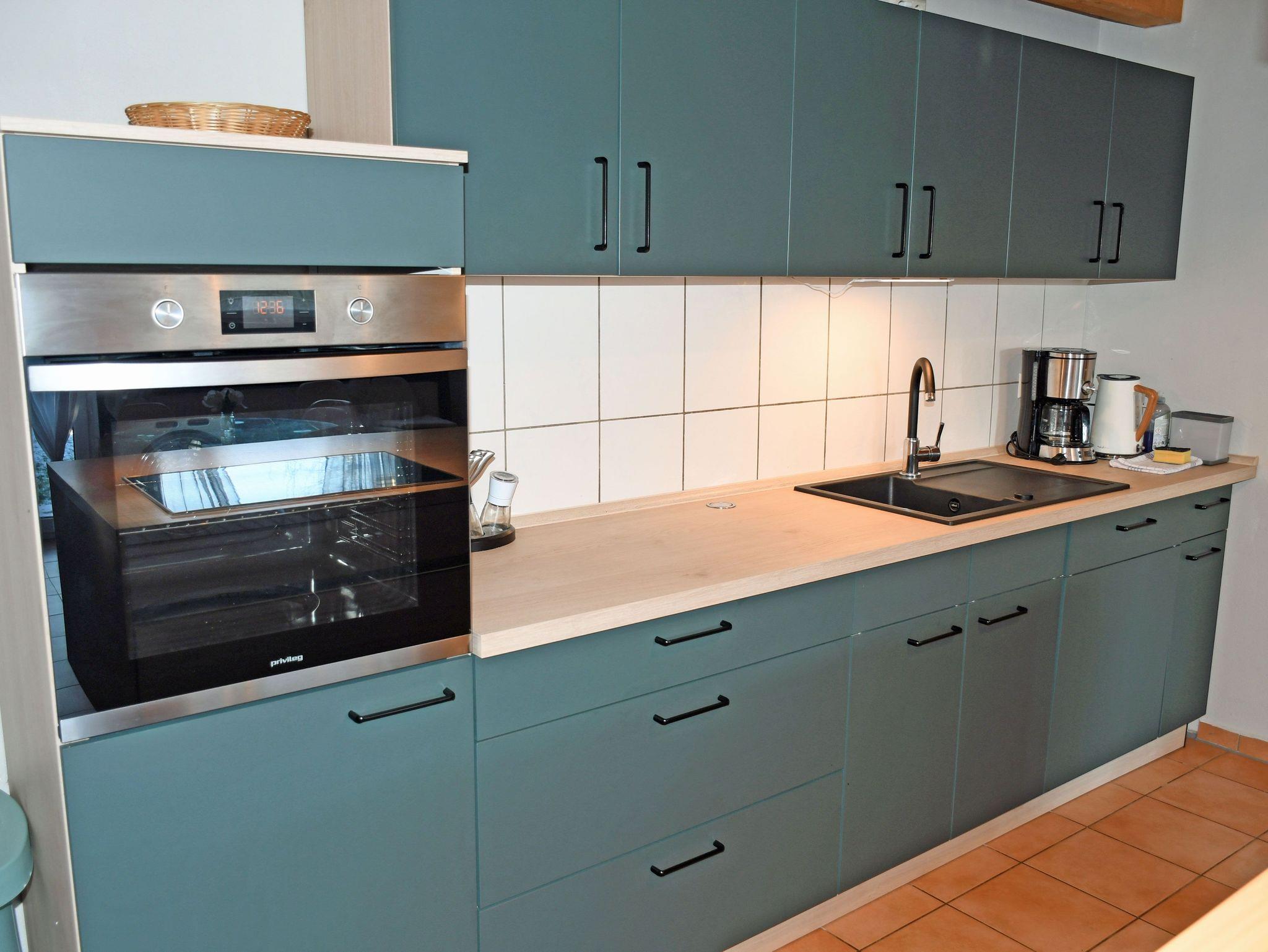 Die moderne separate Küche ist mit einem Ceranfeld-Herd, Backofen, Spülmaschine, Wasserkocher, Kaffeemaschine, Toaster und Kühlschrank mit Gefrierfach komplett ausgestattet. Hier steht auch ein Esstisch mit Sitzgelegenheiten.