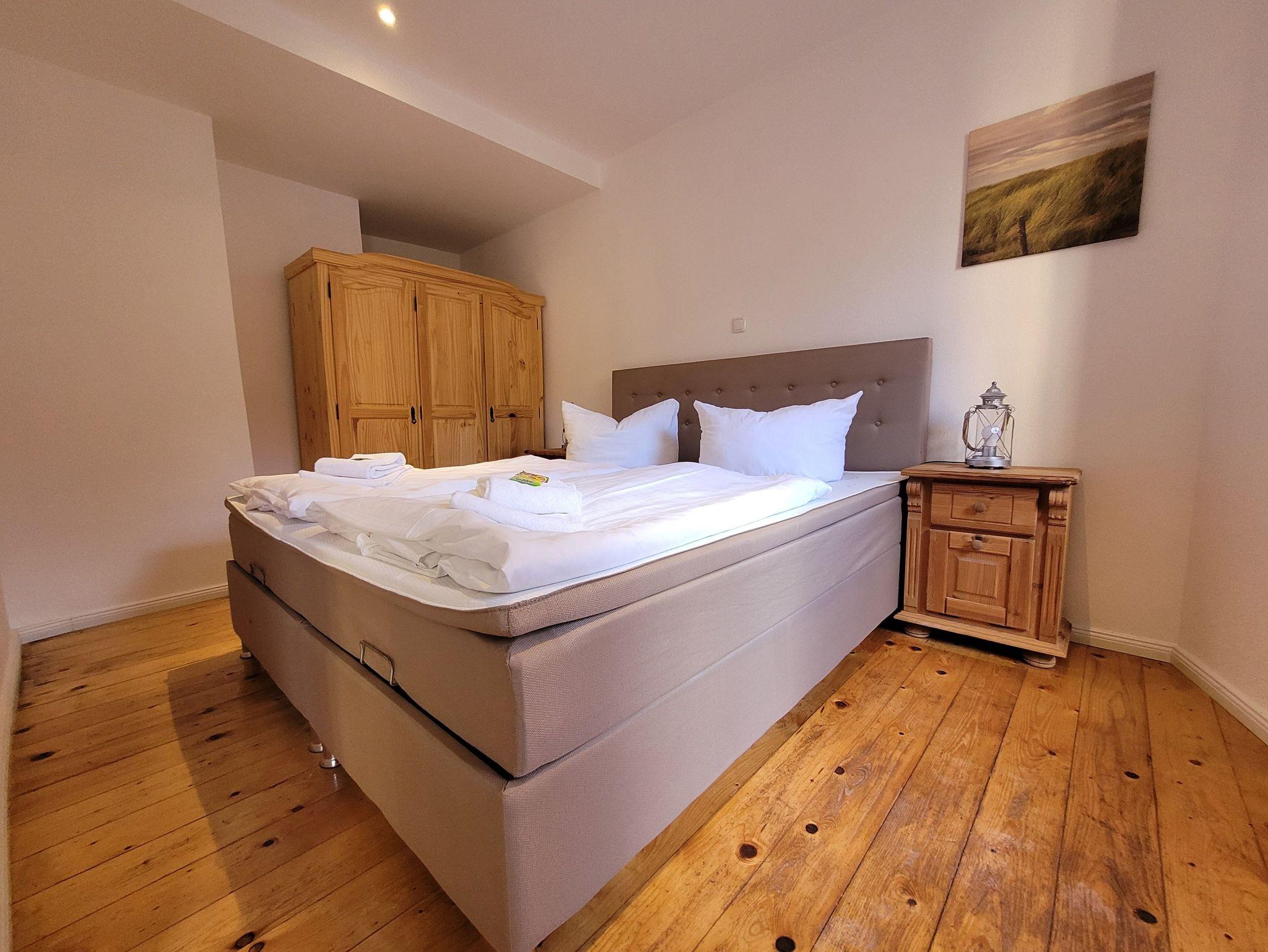 Die Wohnung befindet sich im Hochparterre und hat ca. 60 qm. In dem Schlafzimmer steht ein Doppelbett. Im Wohnzimmer befindet sich eine große Schlafcouch für 2 Personen.