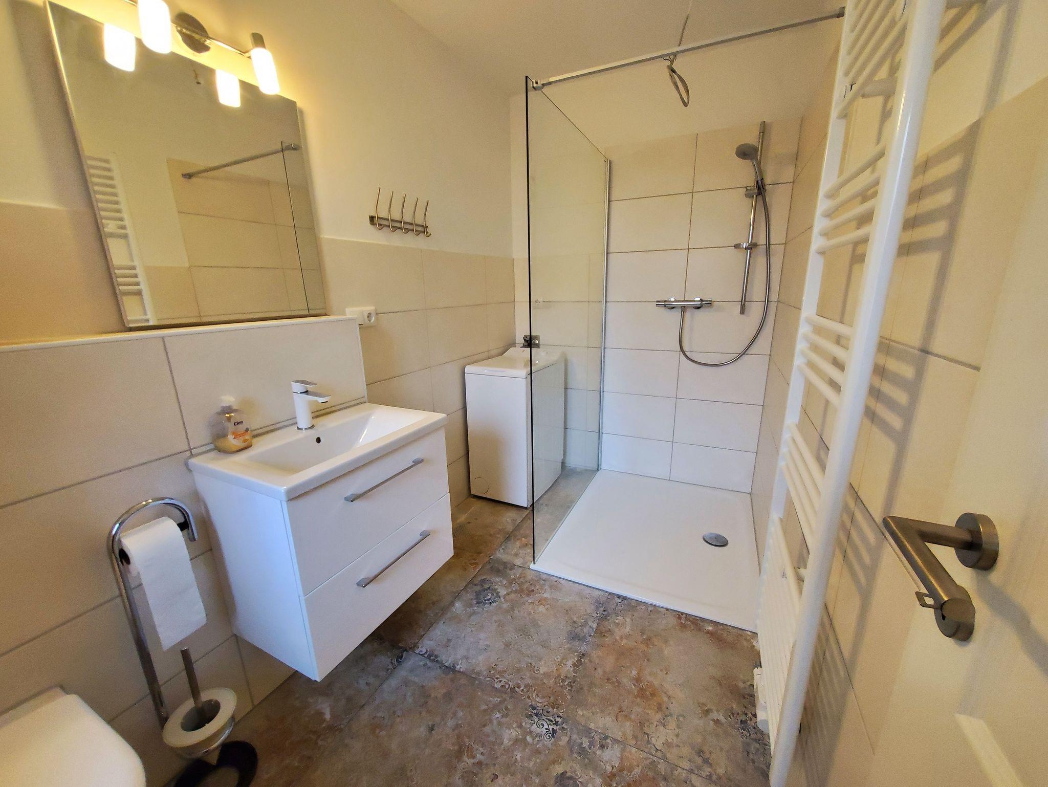 Die Wohnung verfügt über ein großes Bad mit bodentiefer großer Dusche. Im Deck I ist ebenfalls eine Waschmaschine vorhanden. Ein Wäscheständer zum Trocknen Ihrer Wäsche steht zur Verfügung.