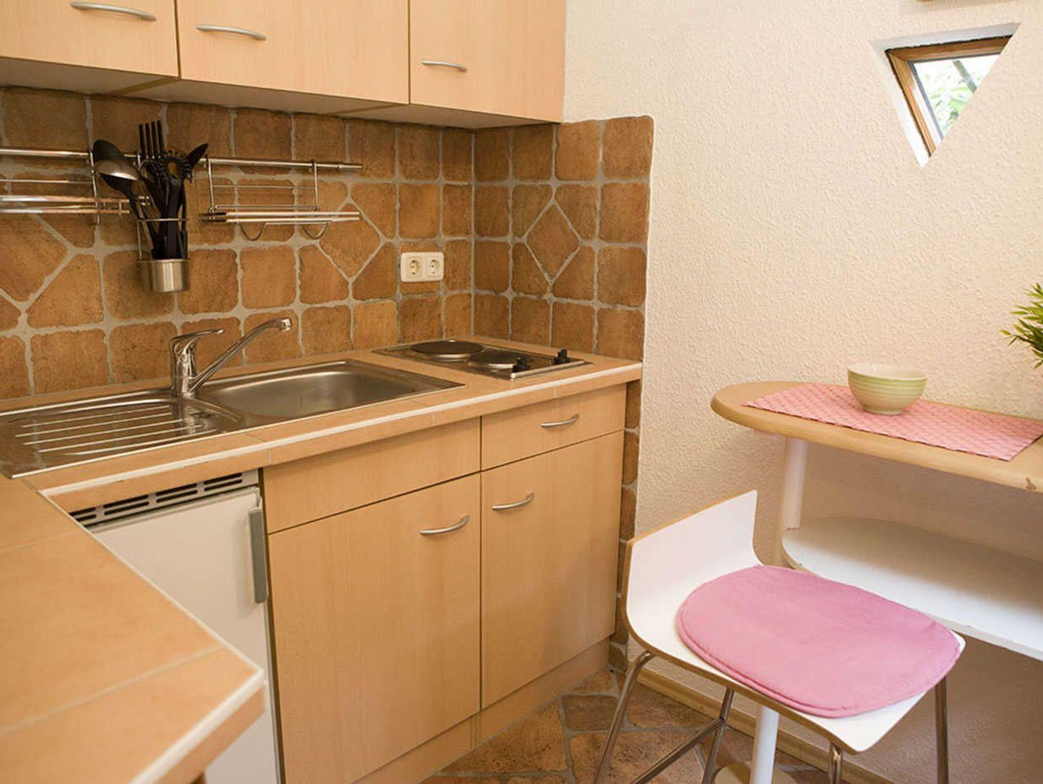 EBK: Kühlschrank, E-Herd mit 2 Platten, Wasserkocher, Toaster, Kaffeemaschine, Geschirr, Besteck
