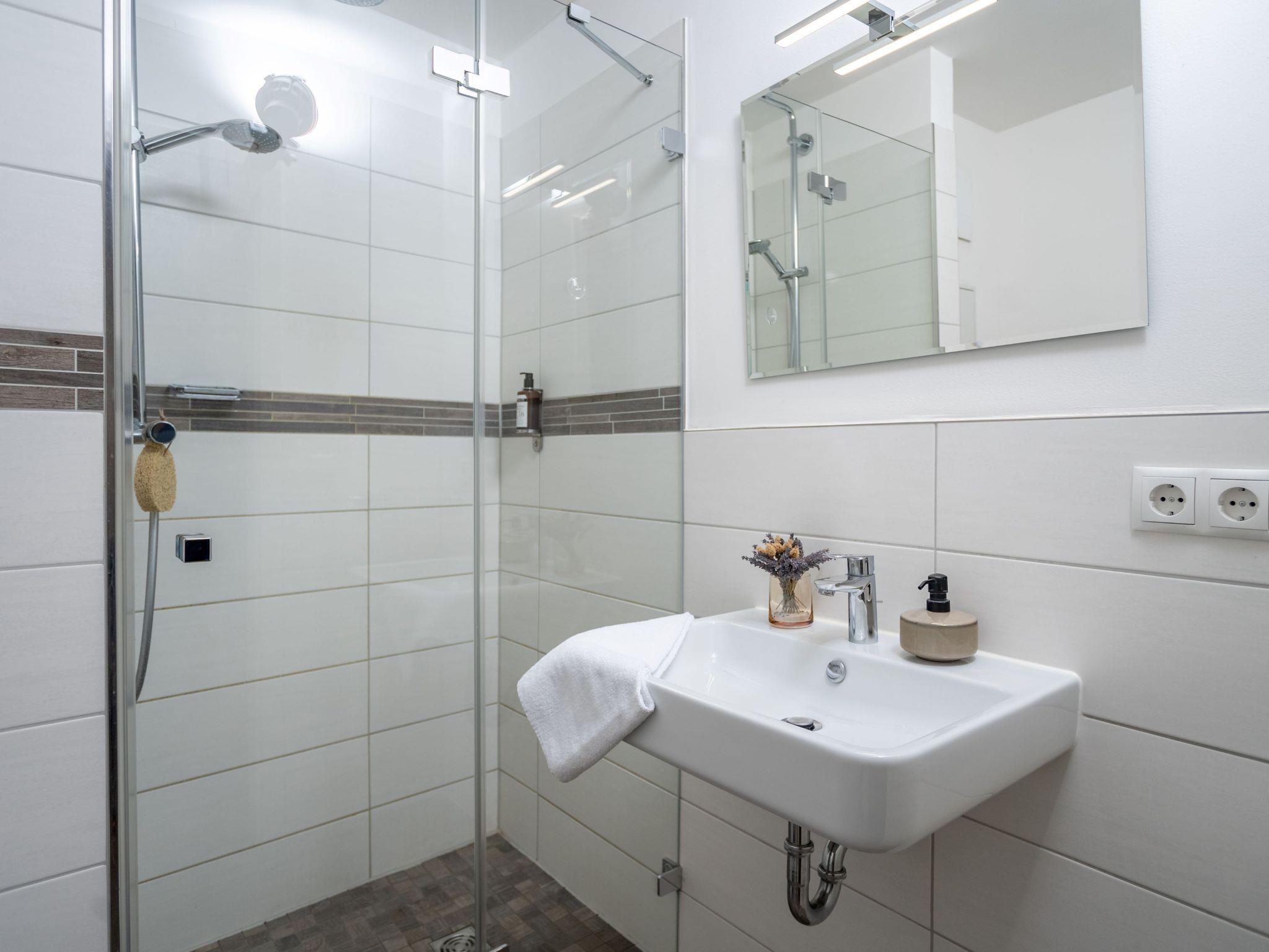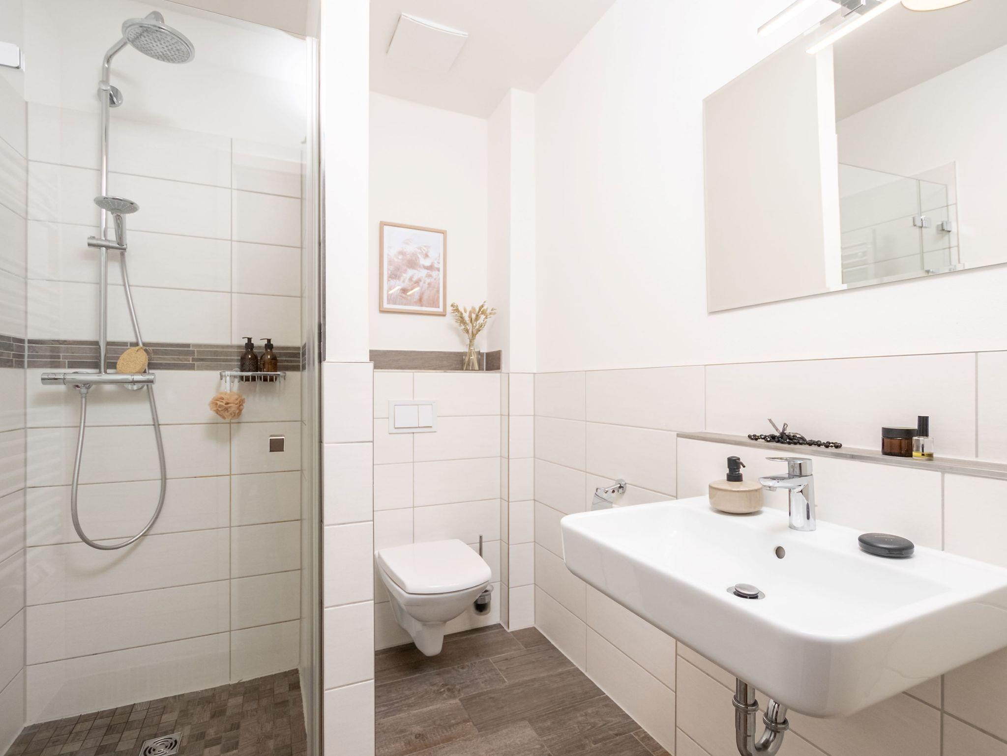 Unsere modernen Zwei-Raum-Apartments Classic befinden sich im Erdgeschoss sowie im 1. und 2. Obergeschoss. Zur Ausstattung gehören ein komfortables Boxspringbett in einem separaten Schlafzimmer, eine gemütliche Sitzecke mit Esstisch und Schlafcouch, eine praktische Küchenzeile und ein Badezimmer mit Dusche.