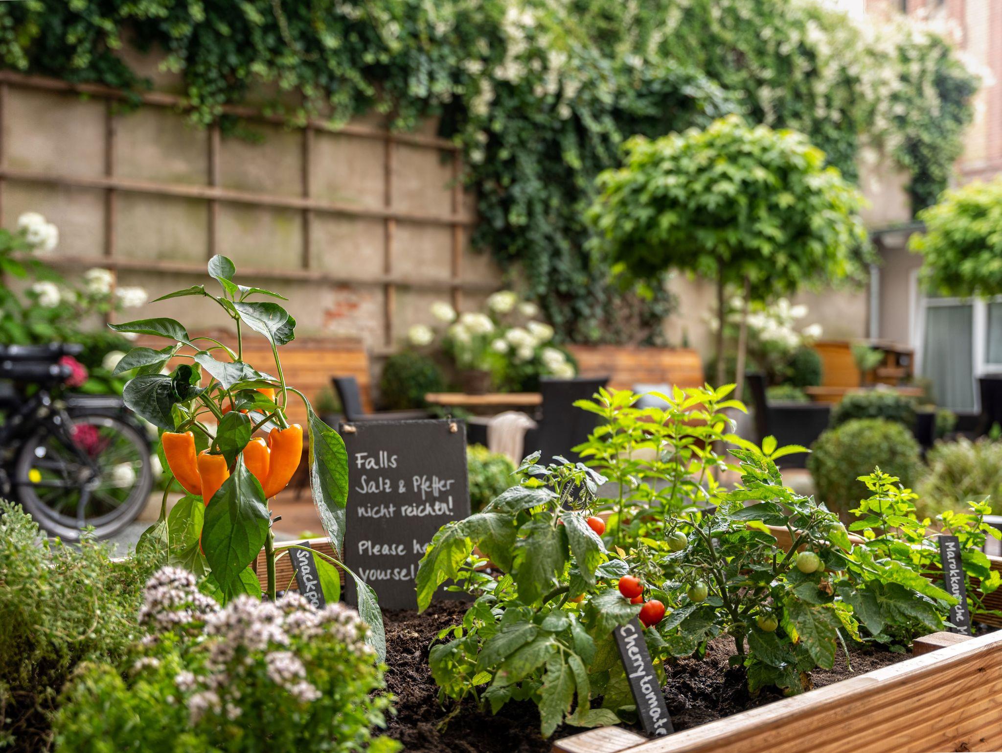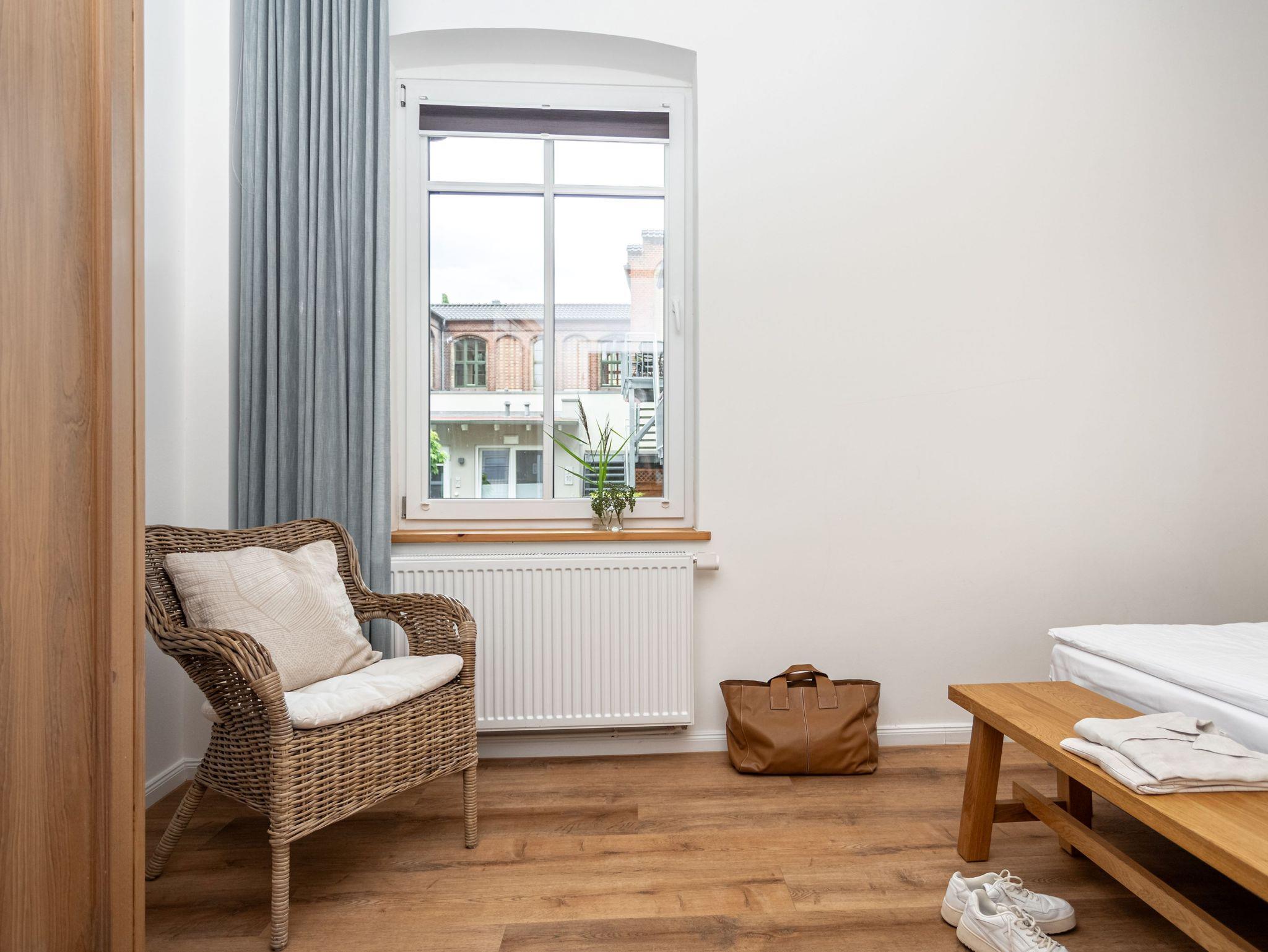 Modernes Apartment in Stralsunds historischer Altstadt mit Blick auf St. Marienkirche und Garten.