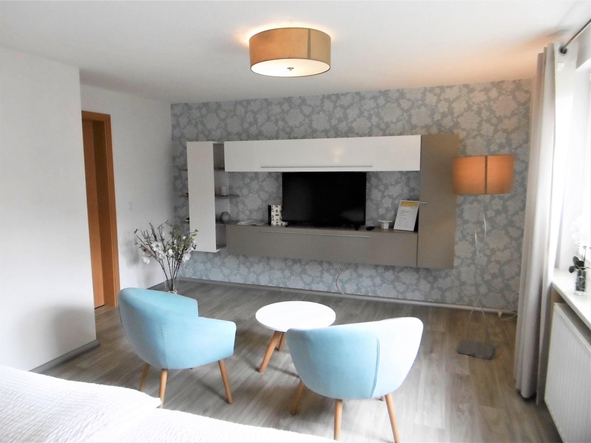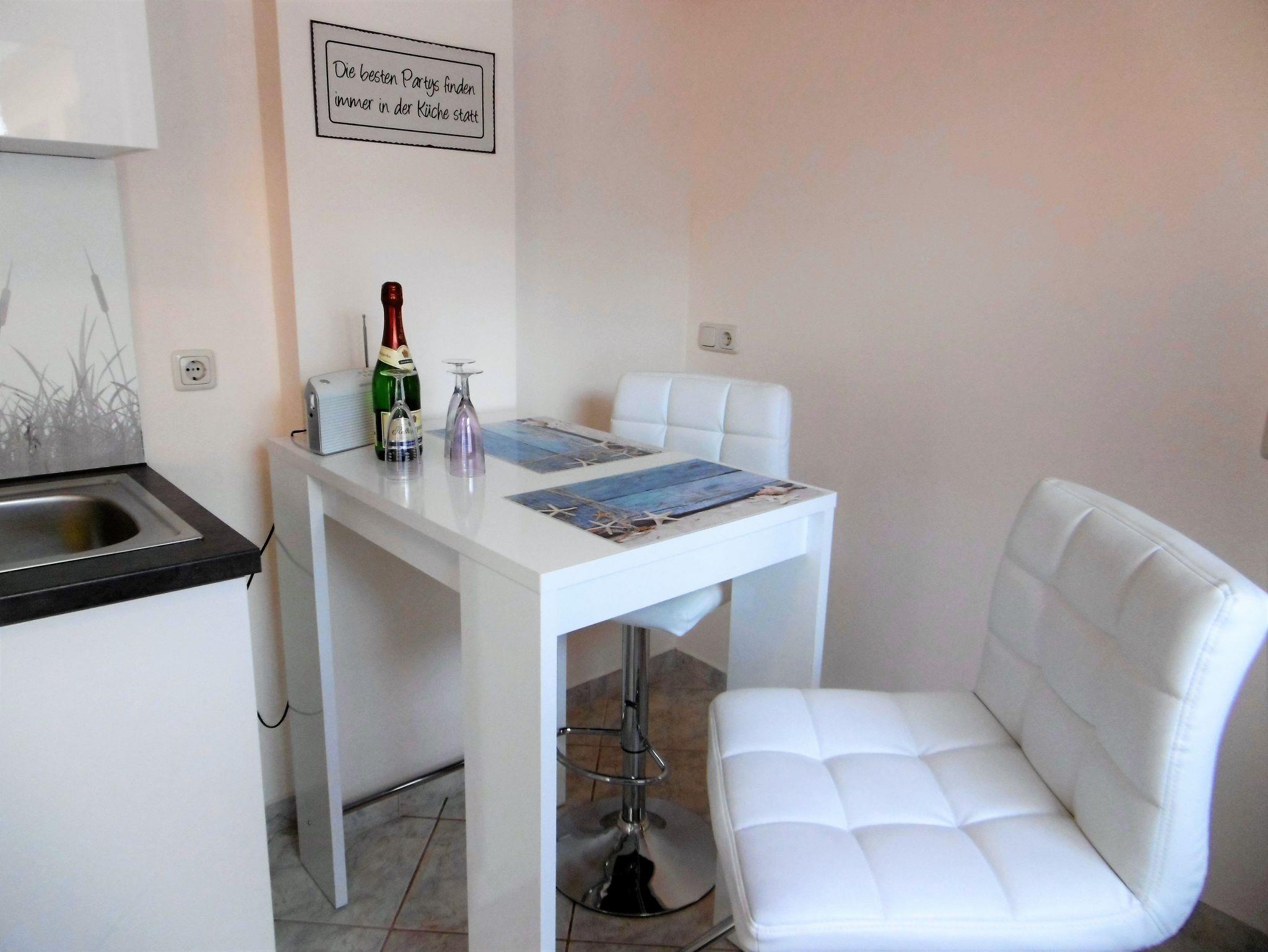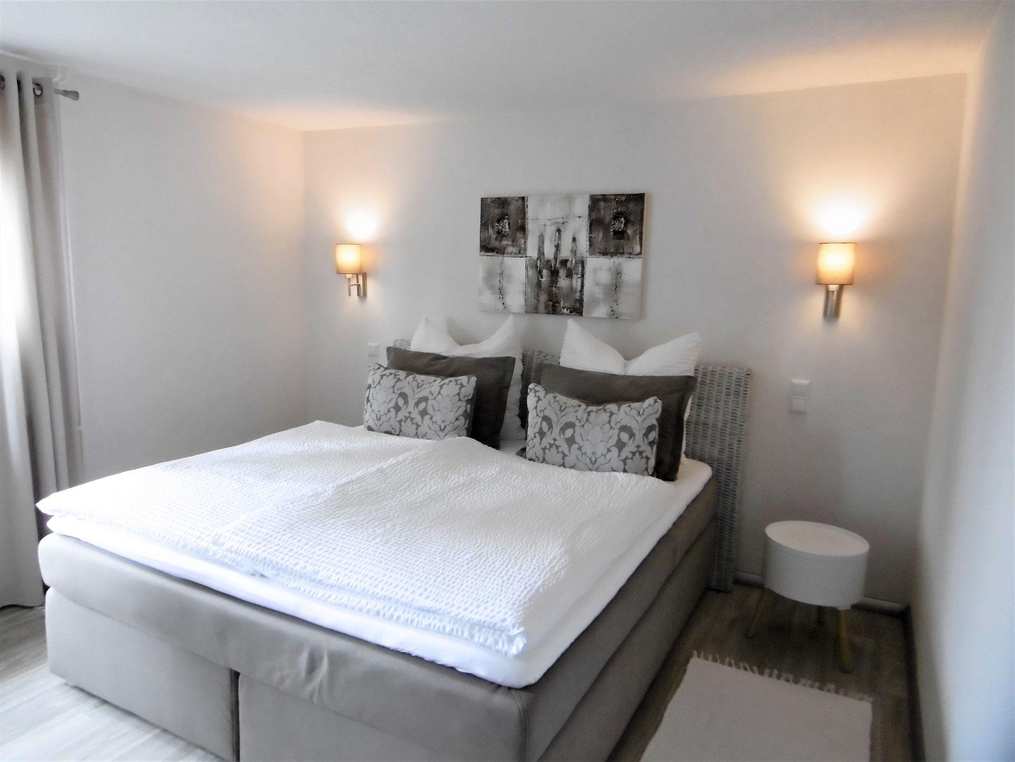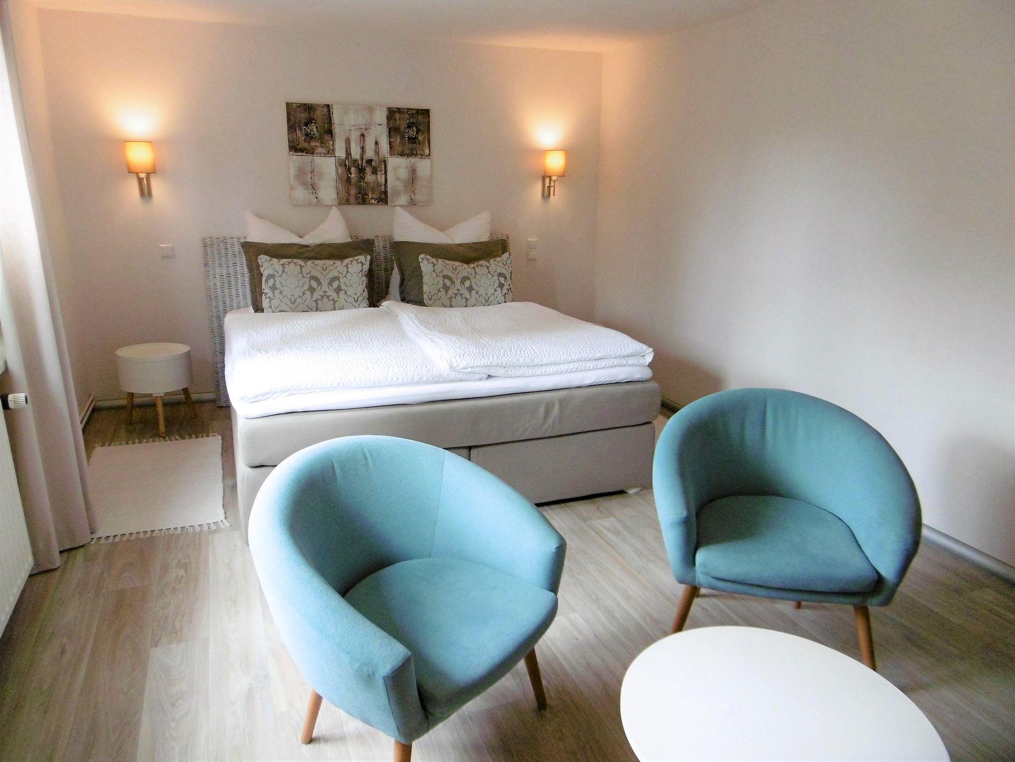 Die modern ausgestattete Ferienwohnung im Erdgeschoss umfasst ein Wohn-/ Schlafzimmer, ein separates Schlafzimmer, eine Küche, ein Badezimmer mit ebenerdiger Dusche und eine kleine Diele. Zur Unterkunft gehört ein kostenloser PKW-Stellplatz auf dem Grundstück sowie eine möblierte Außenterrasse.