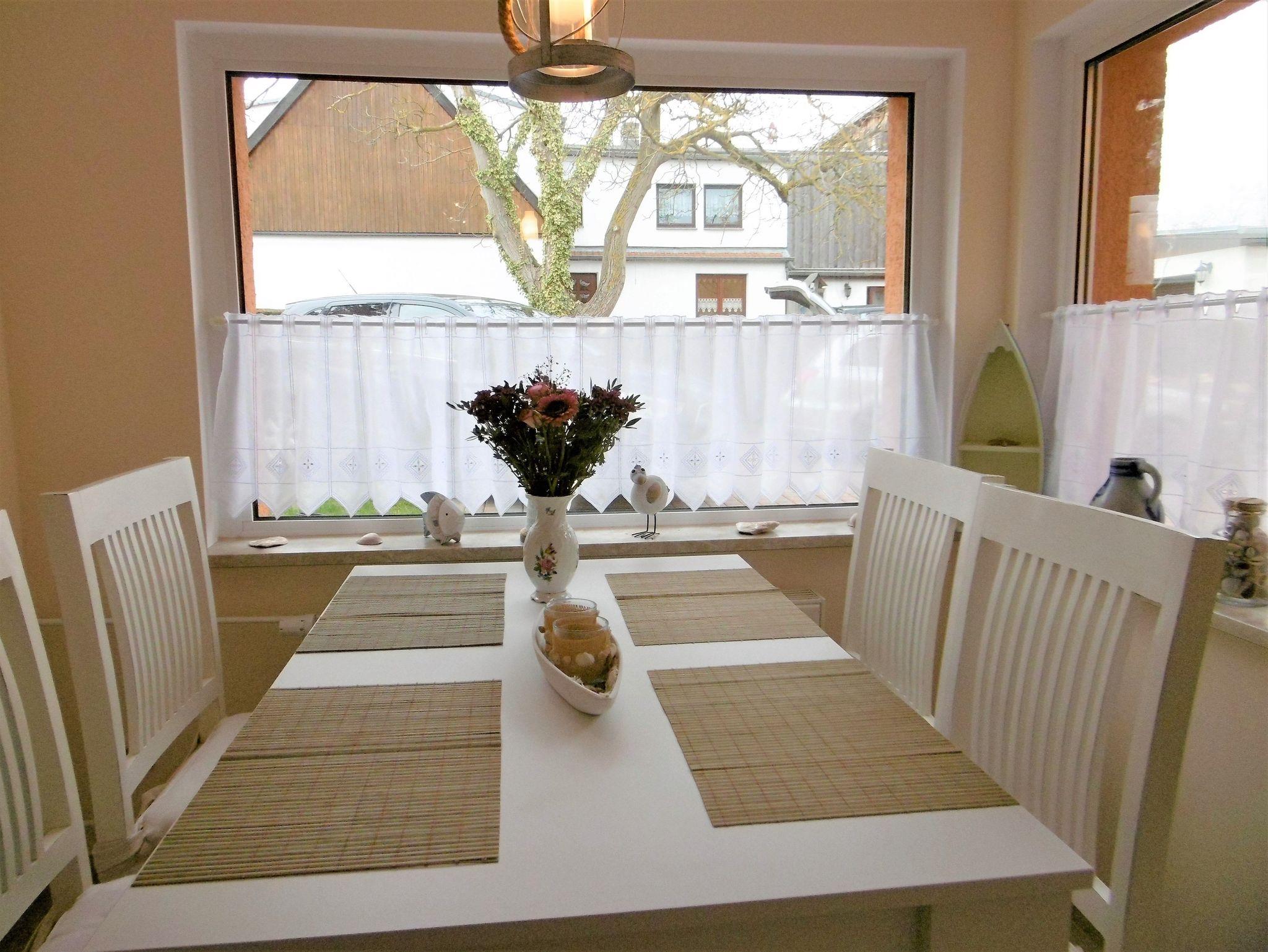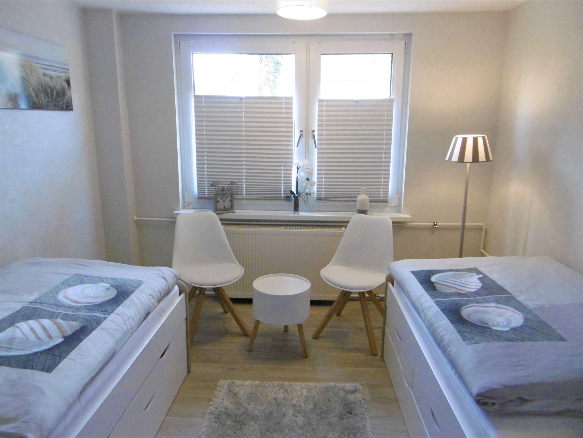Die modern ausgestattete Ferienwohnung im Erdgeschoss umfasst ein kombiniertes Wohn- / Schlafzimmer mit Doppelbett, ein Schlafzimmer mit 2 Einzelbetten, ein Badezimmer mit ebenerdiger Dusche und eine kleine Diele mit Esstisch.