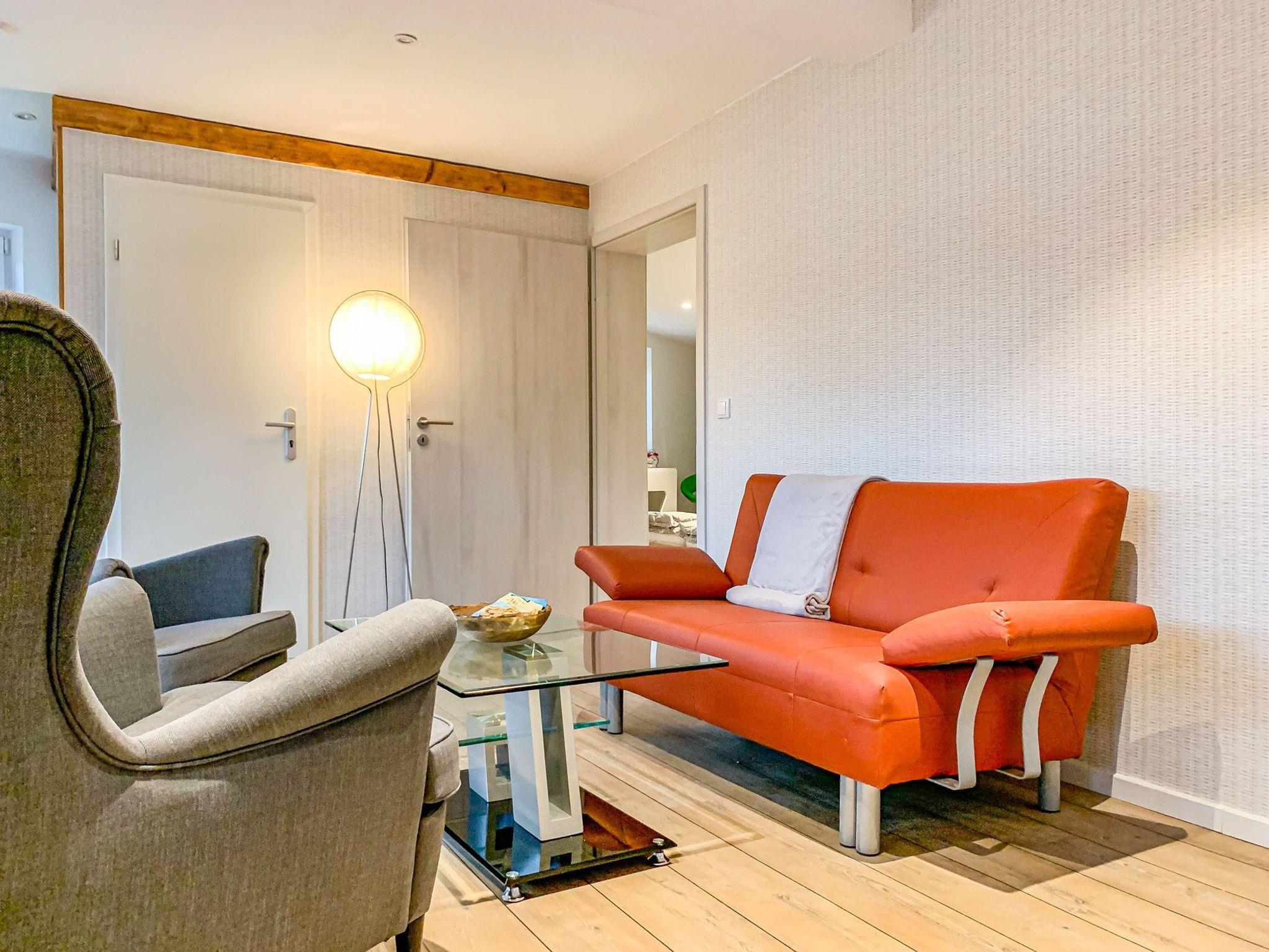 Zentraler Mittelpunkt des Ferienhauses ist der großzügige Eingangsbereich. Von hier aus gelangt man in das Wohnzimmer, das Esszimmer- und das Schlafzimmer, sowie in die Küche. Das zweite Wohnzimmer bietet den direkten Zugang zur geschützt liegenden Terrasse. Die geräumige, mit modernen Geräten ausgestattete Küche bietet alles was man zum Kochen braucht. Zu beiden Seiten schließen sich zwei separate Bäder an die Küche an. Im Obergeschoss befindet sich das zweite, helle Schlafzimmer mit Zugang zur Dachterrasse und eigenem WC.