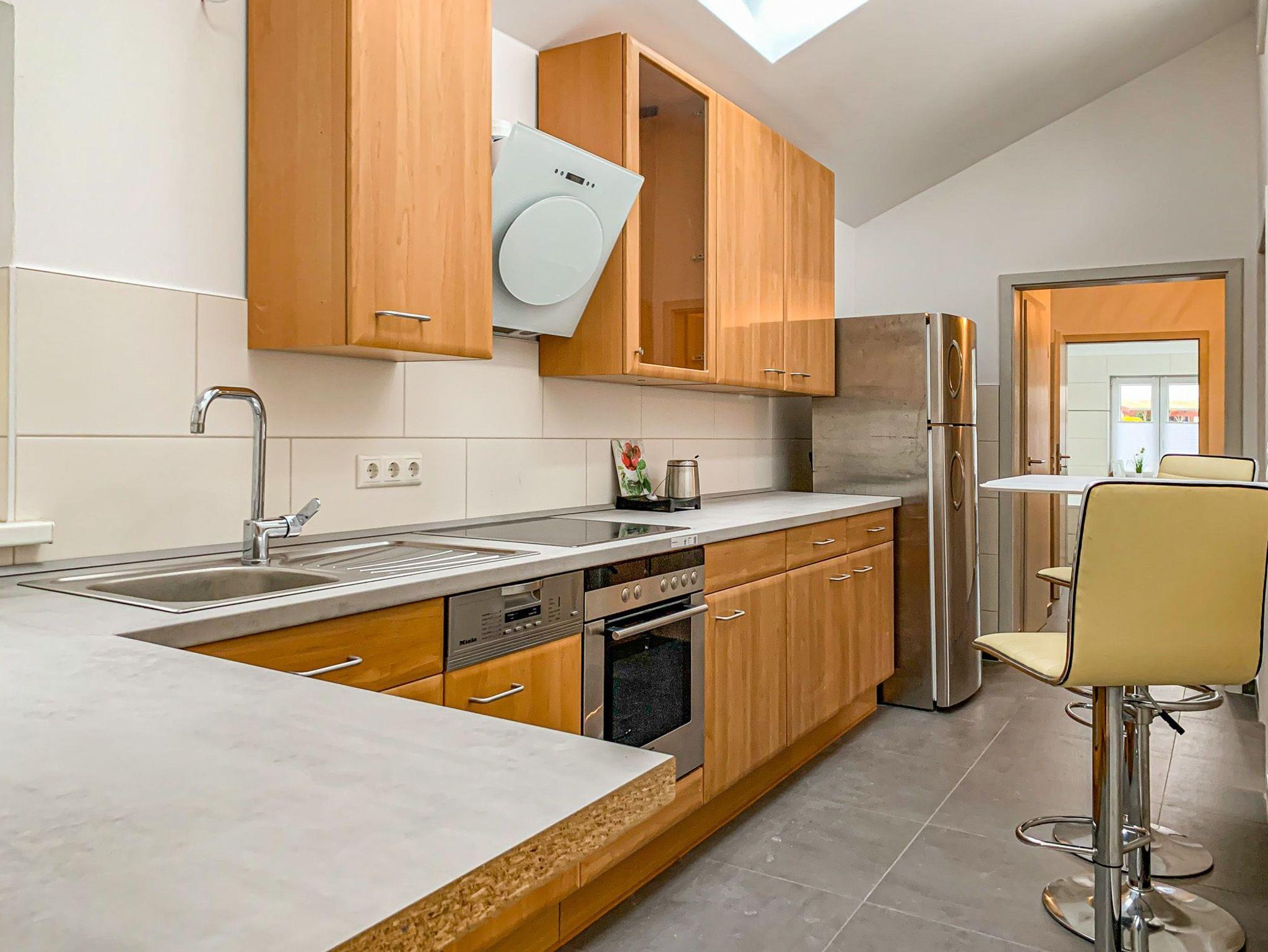 Kühlschrank, E-Herd, Wasserkocher, Toaster, Kaffeemaschine, Geschirr, Besteck