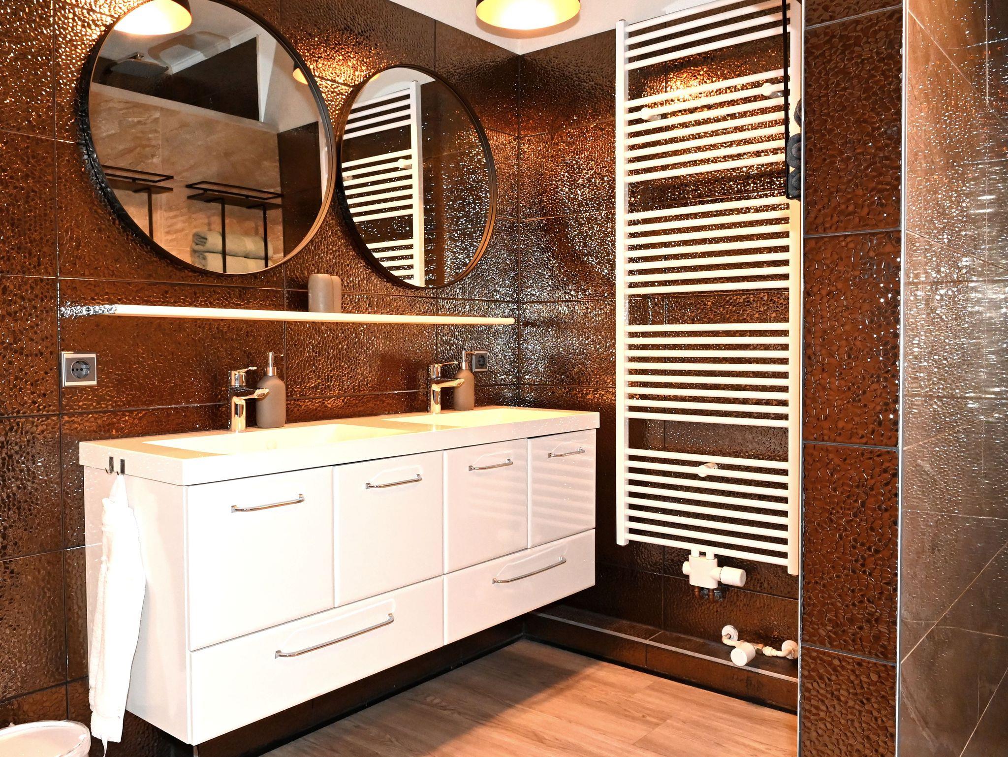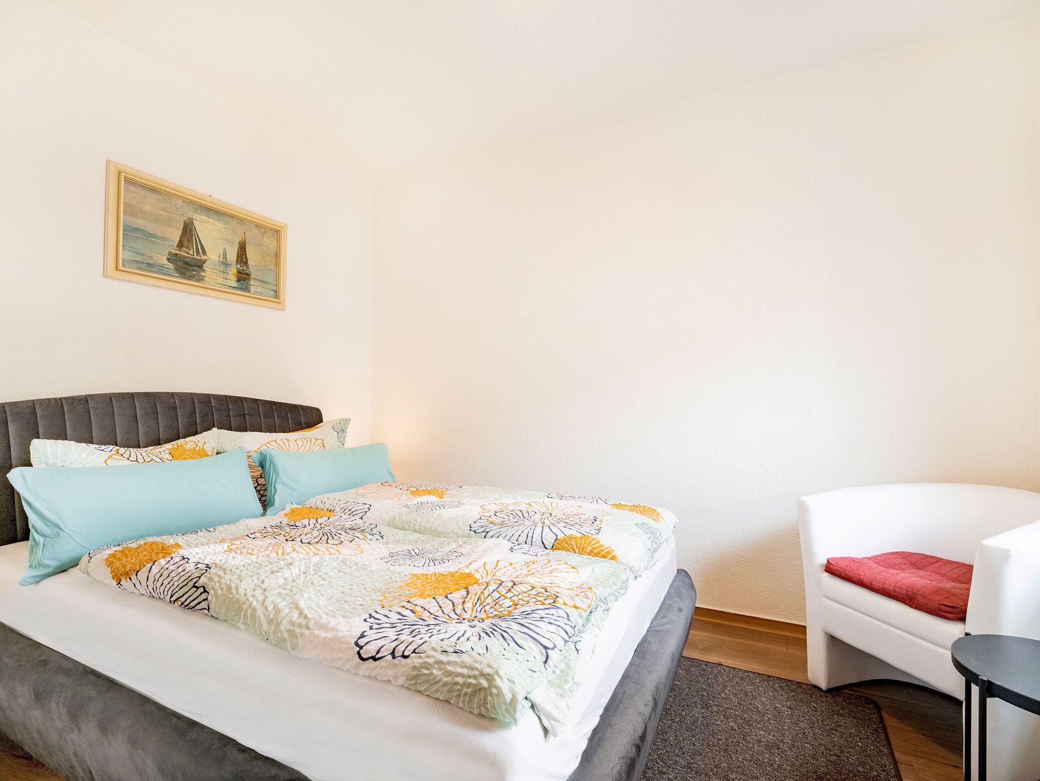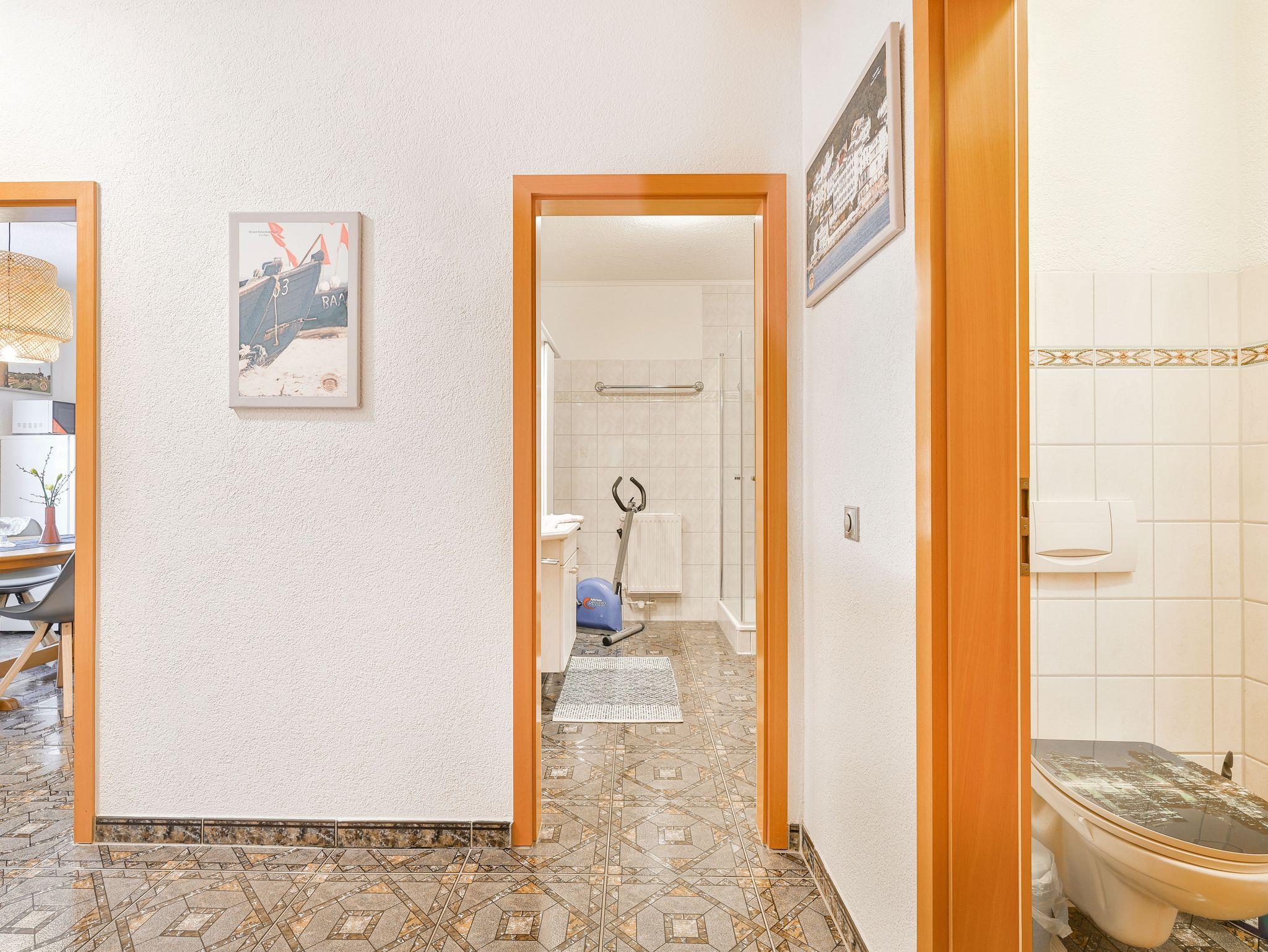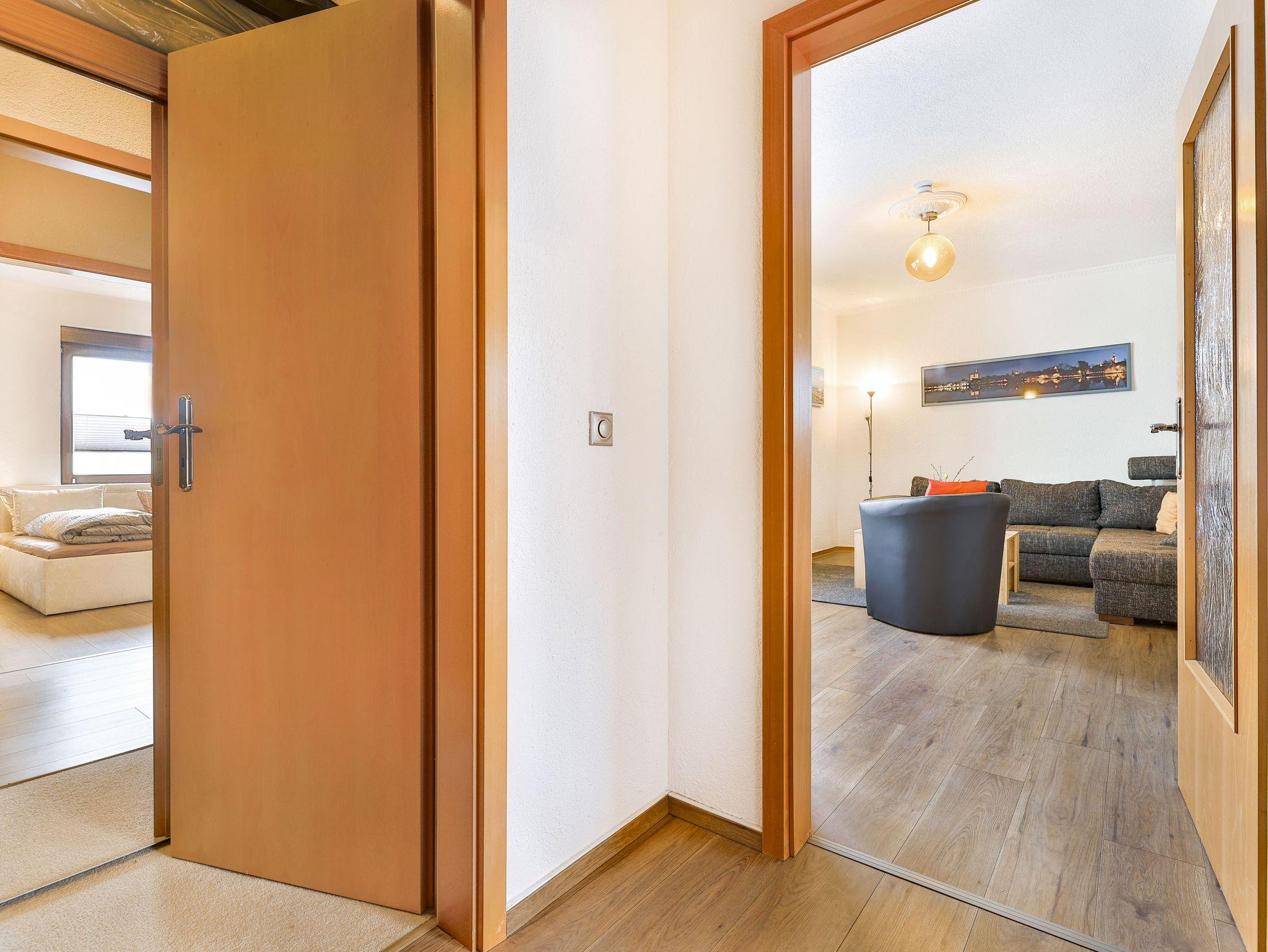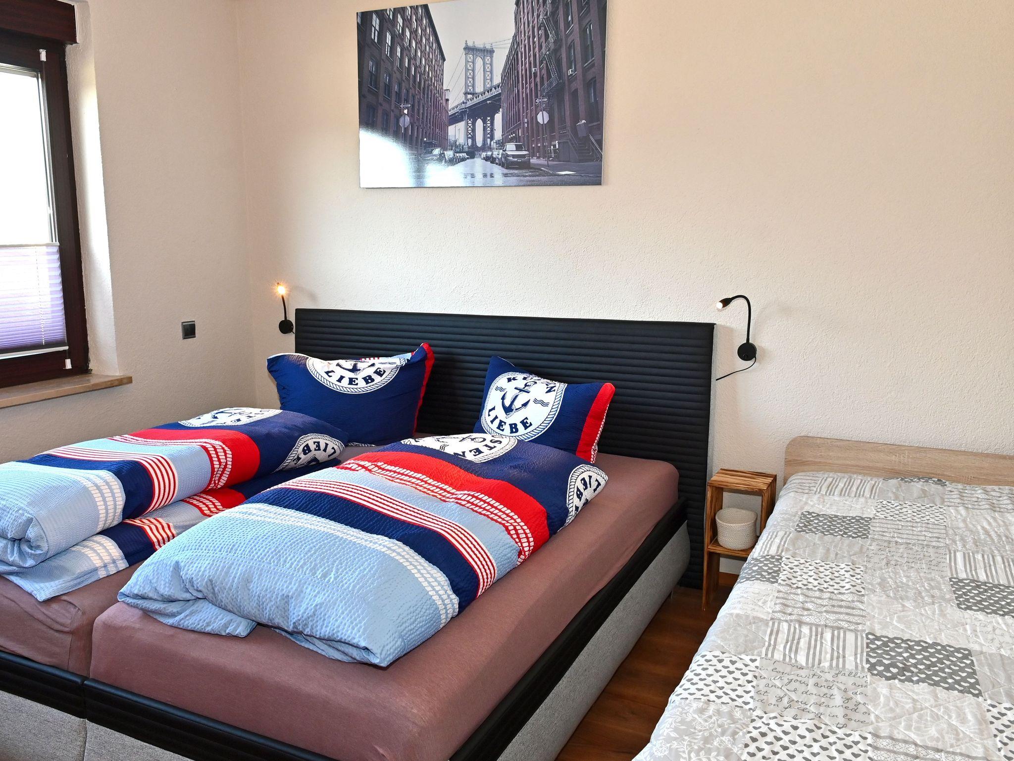 Die Ferienwohnung 1 im 1.OG ist über eine außenliegende Metal-Wendeltreppe zu erreichen. Die Wohnung verfügt über 3 Schlafzimmer, 1 Badezimmer, 1 Gäste-WC sowie eine Küche mit Essbereich. Ebenso gibt es ein Schrankzimmer auf dem Flur.