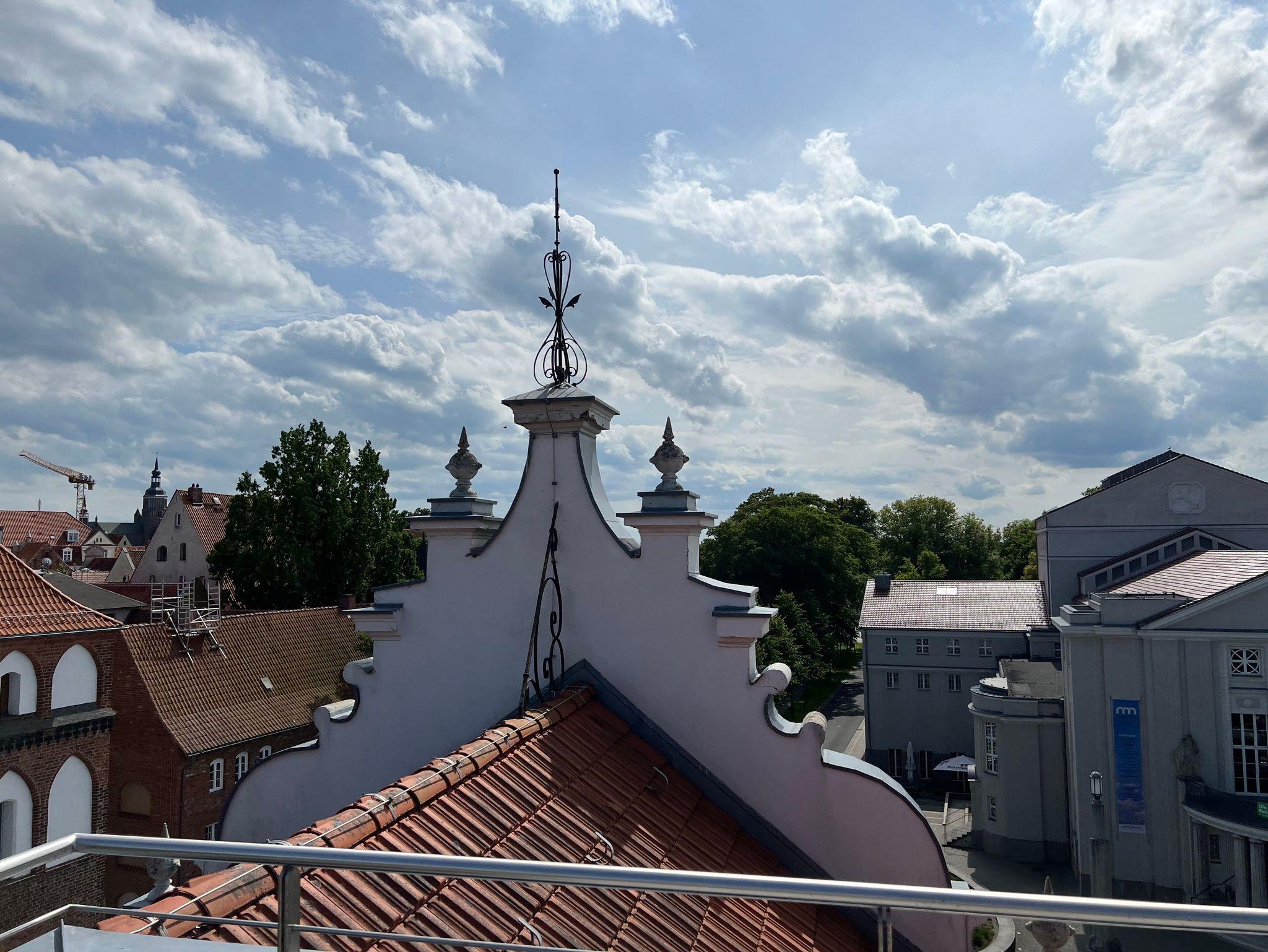 Allen Gästen unseres Hauses steht eine große Gemeinschaftsdachterrasse zur Verfügung. Hier haben Sie einen fantastischen Bilck auf das Stralsunder Theater, die Stadtmauer, die Altstadt und den Hafen.