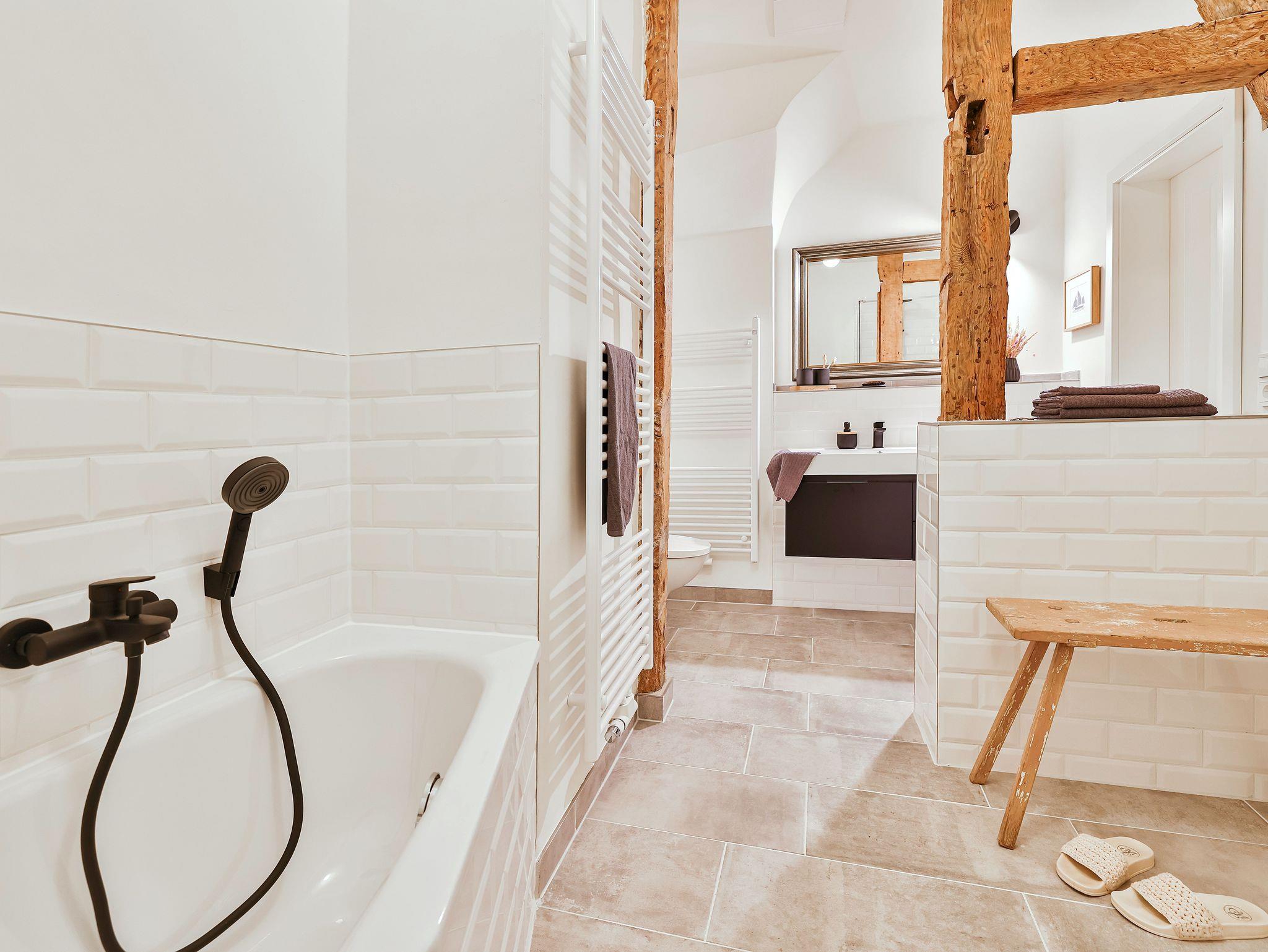 Im 1. OG gibt es 3 separate Schlafzimmer mit 3 Doppelbetten und das zweite Bad mit Dusche.