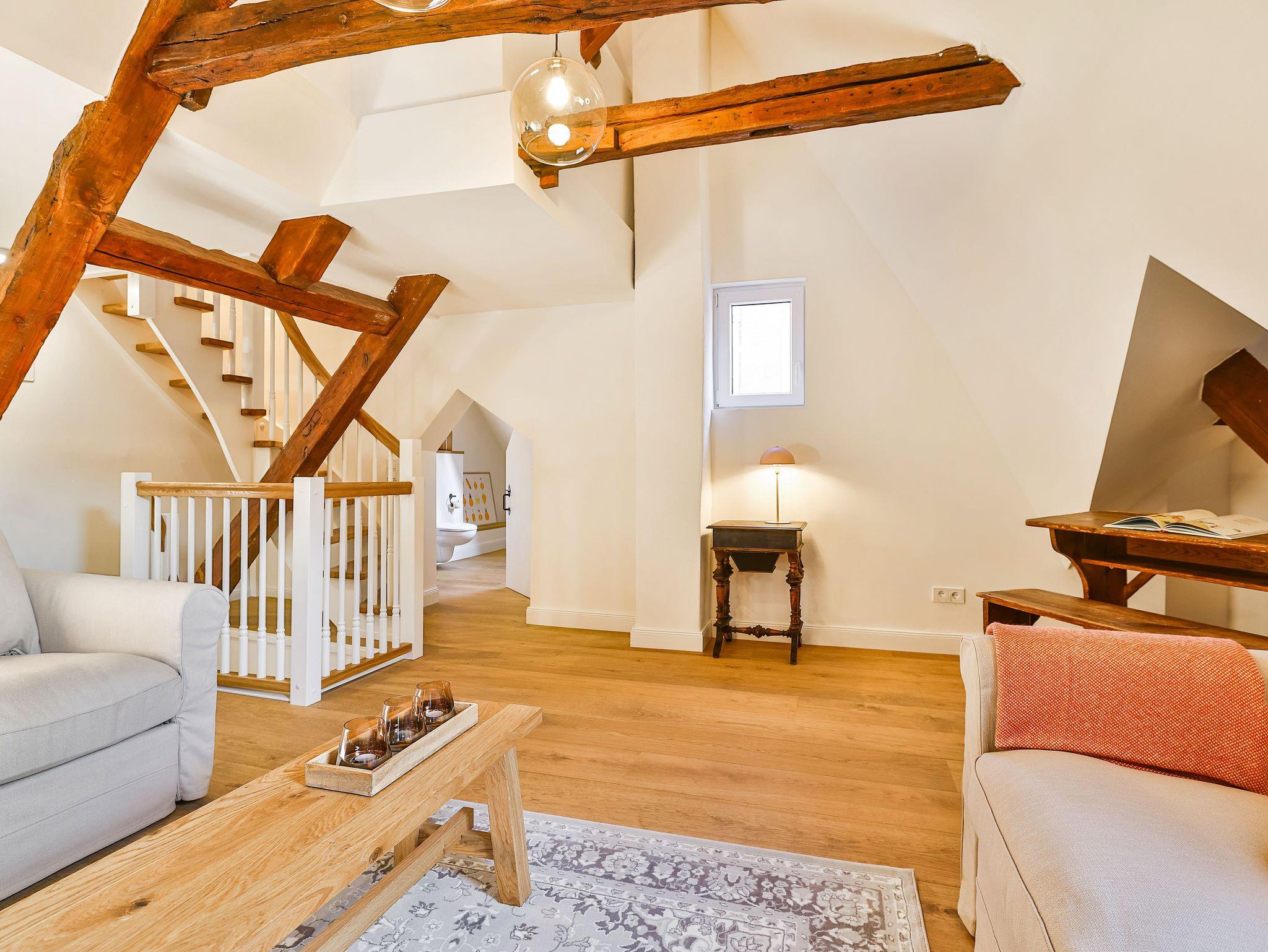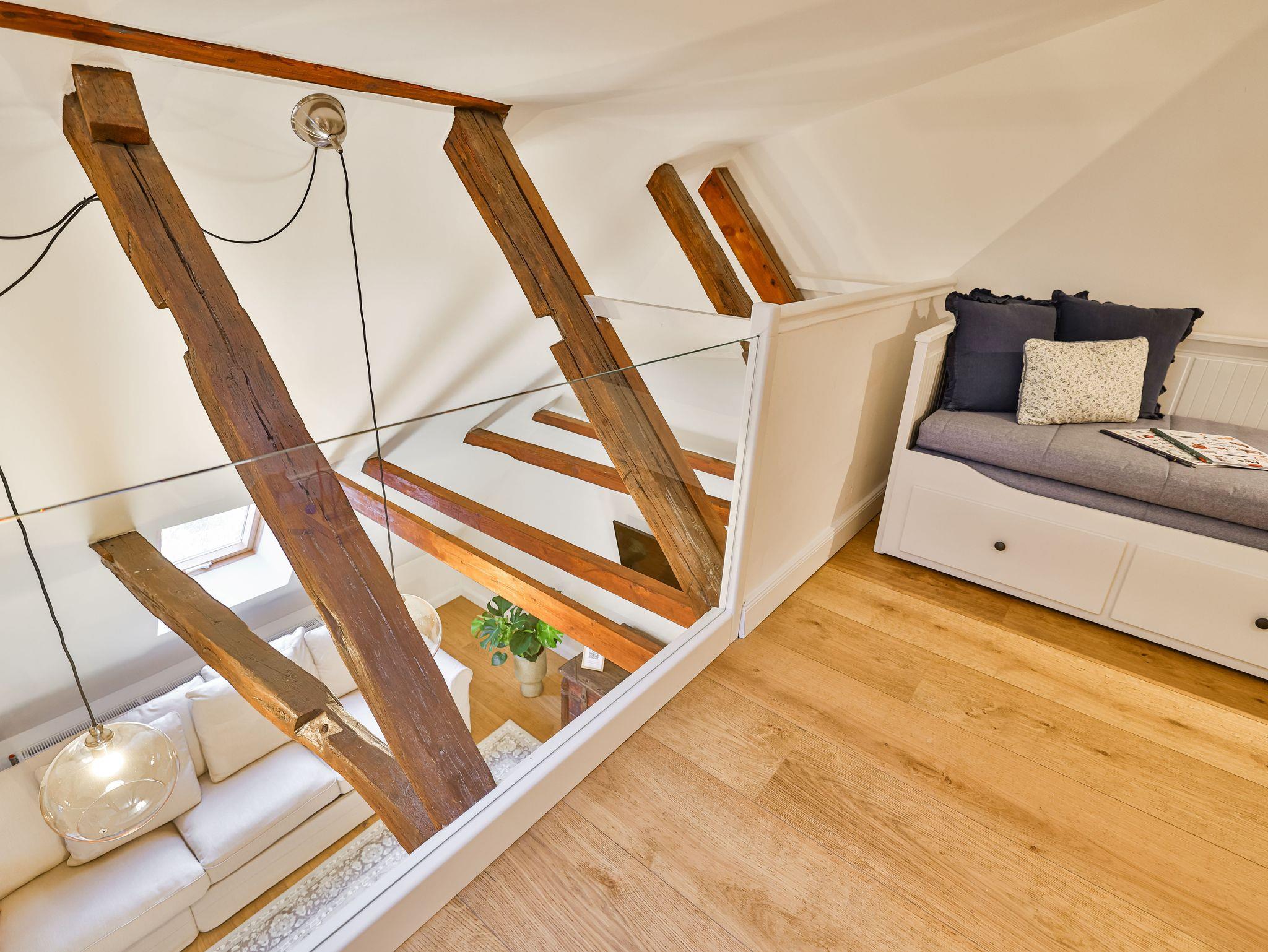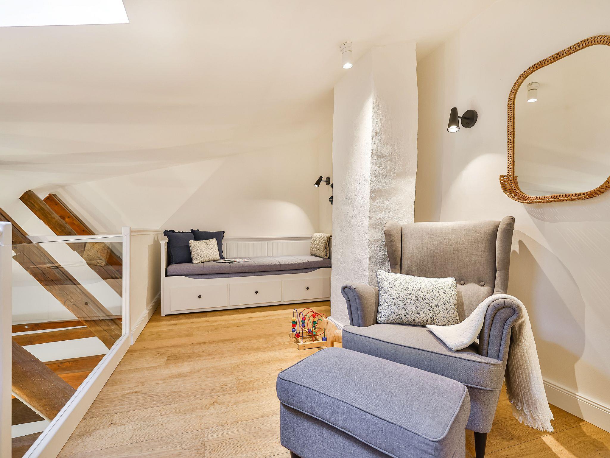 Im 2. OG gibt es das große Wohnzimmer mit 1 Schlafsofas und eine Galerie mit einem weiteren Doppelbett und das kleine Bad.