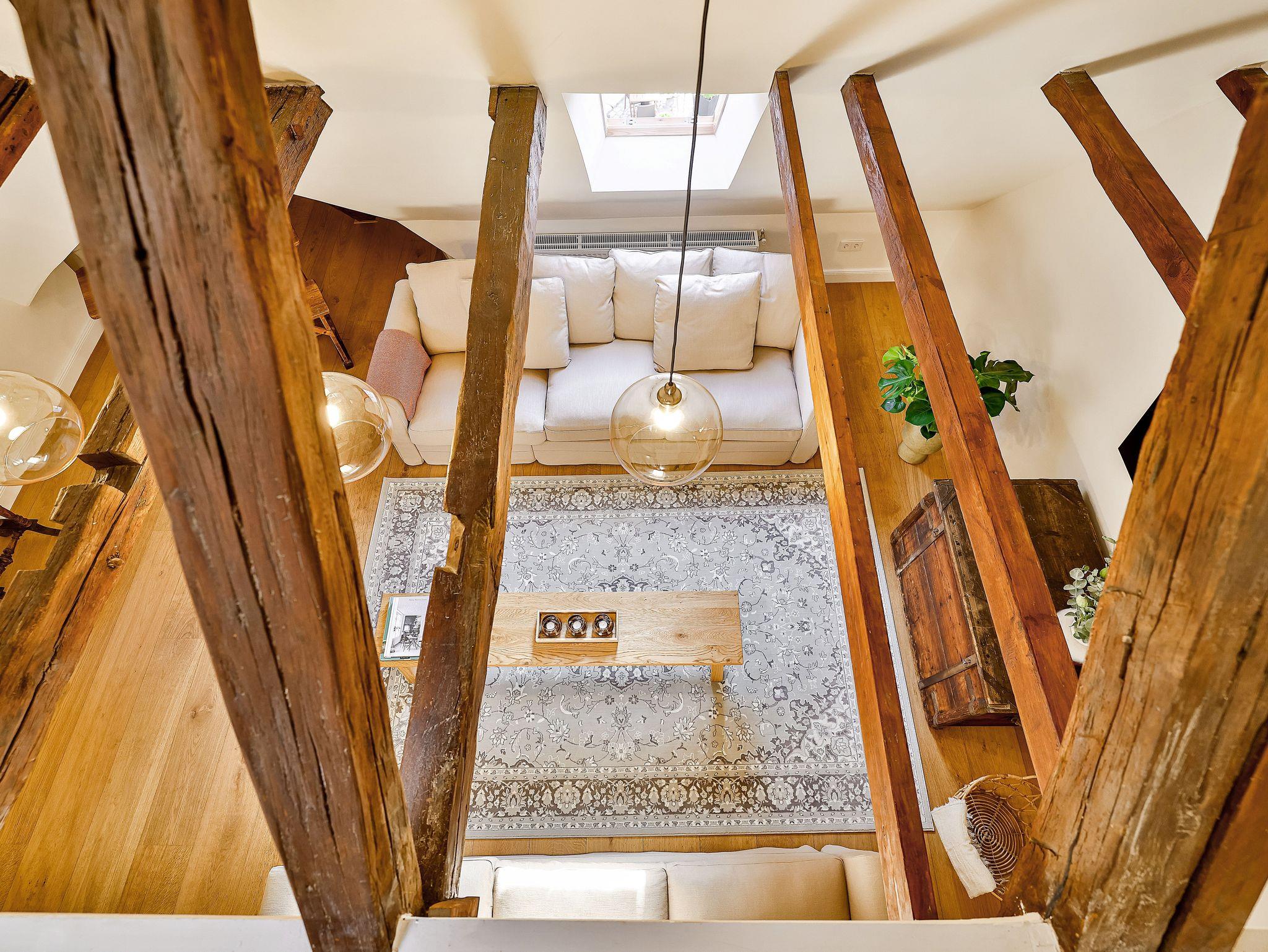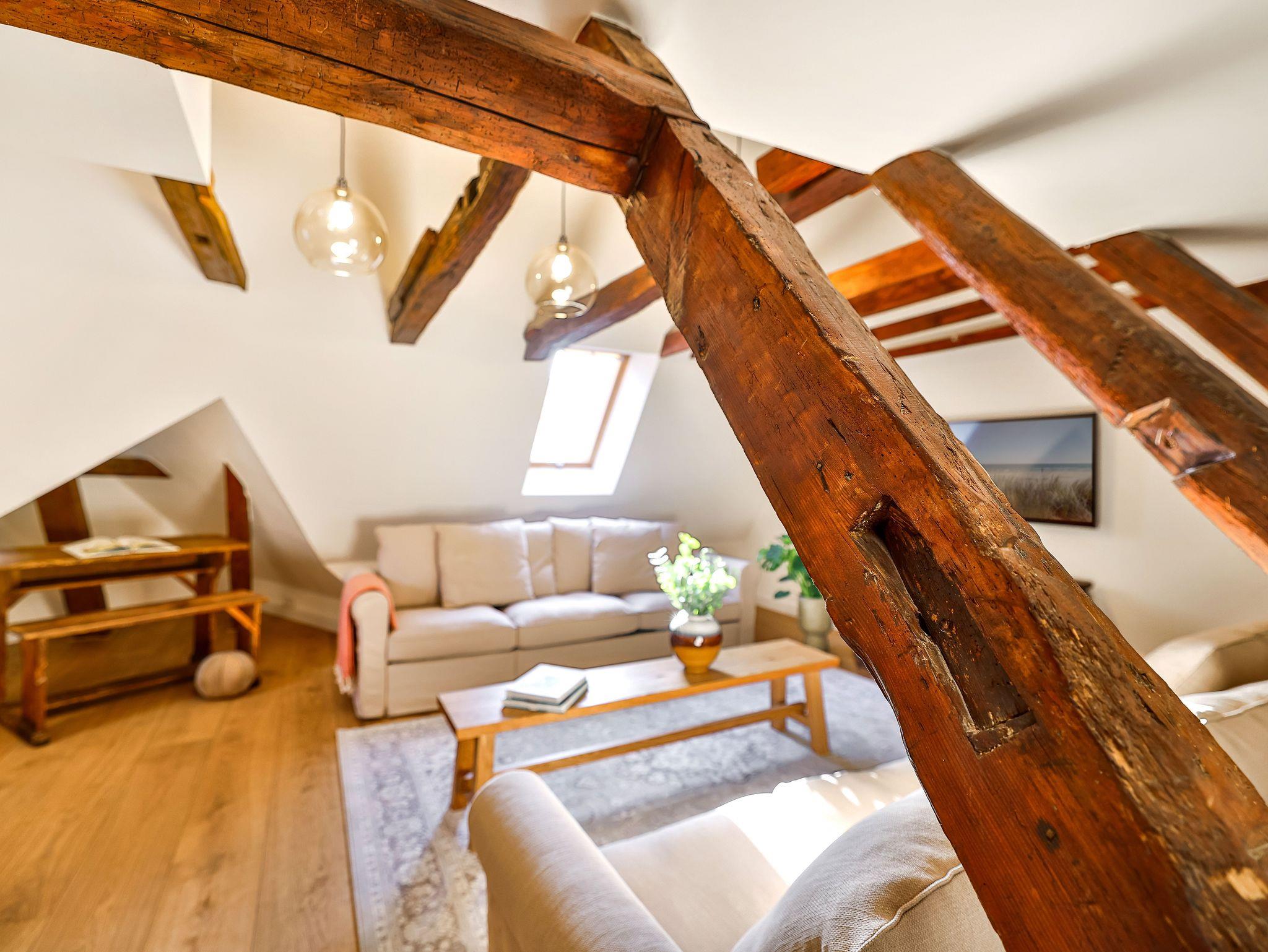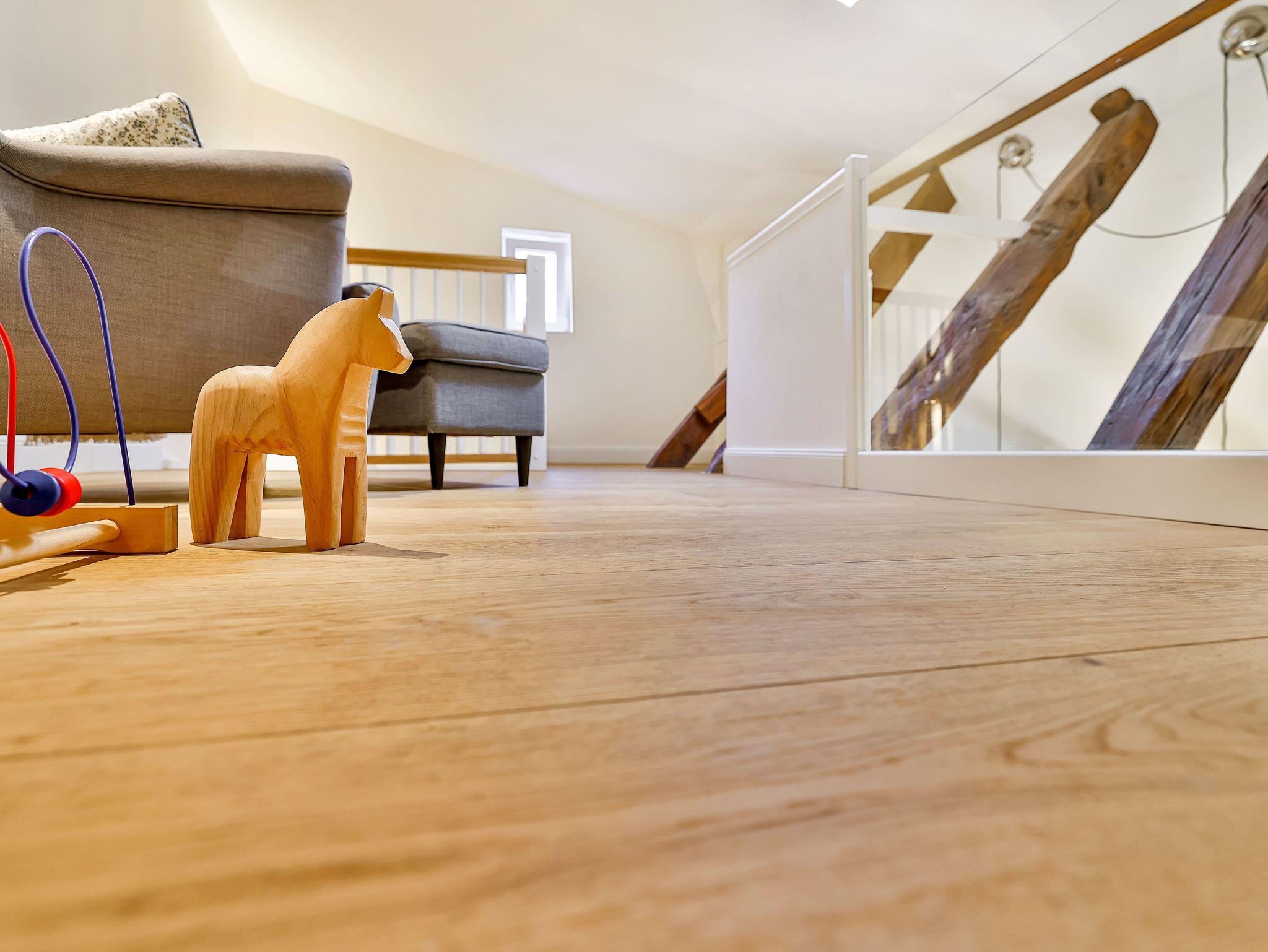 Im 2. OG gibt es das große Wohnzimmer mit 1 Schlafsofas und eine Galerie mit einem weiteren Doppelbett und das kleine Bad.