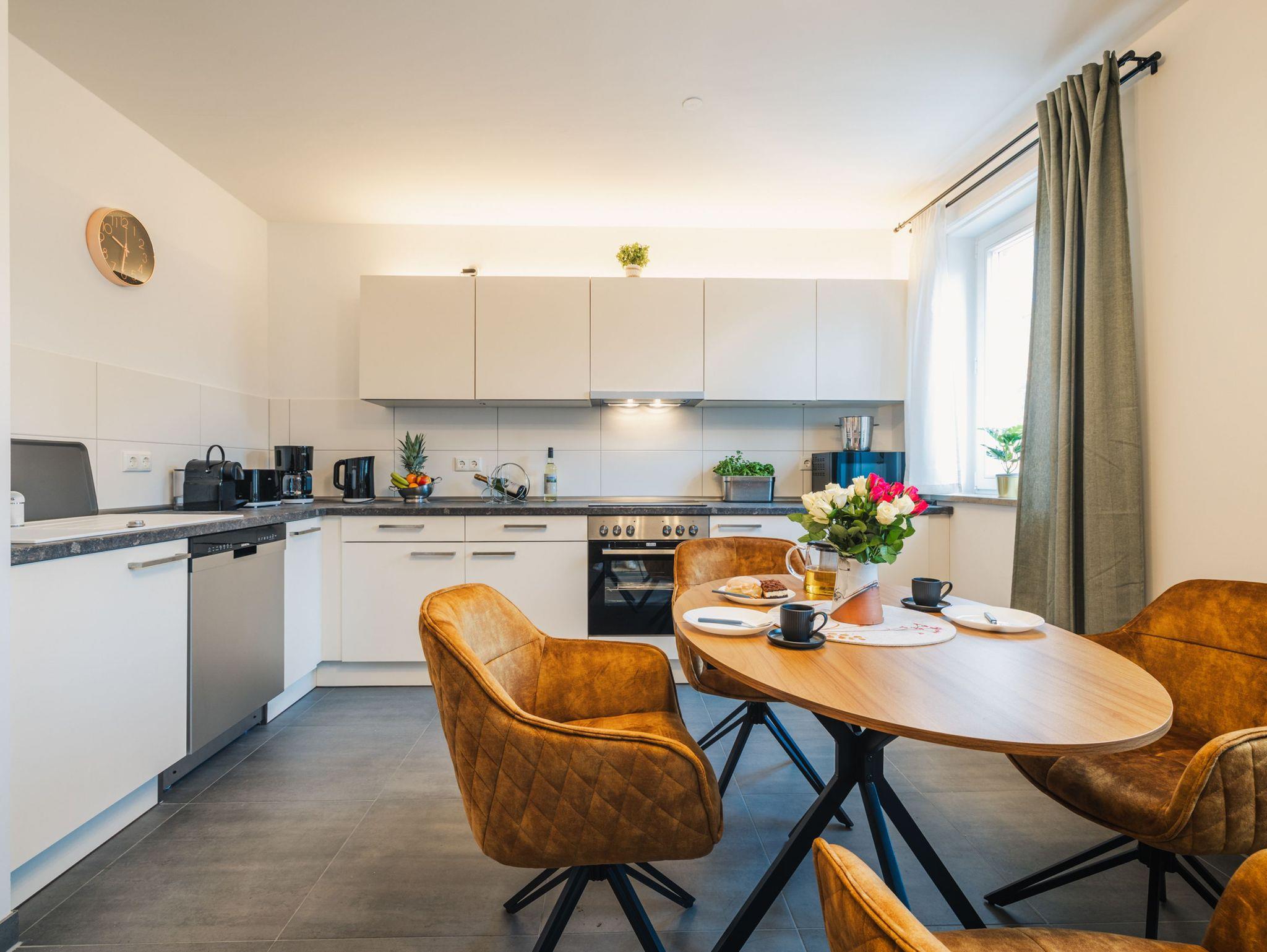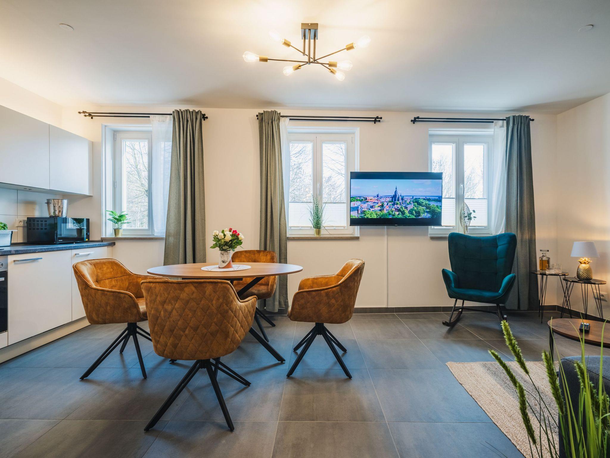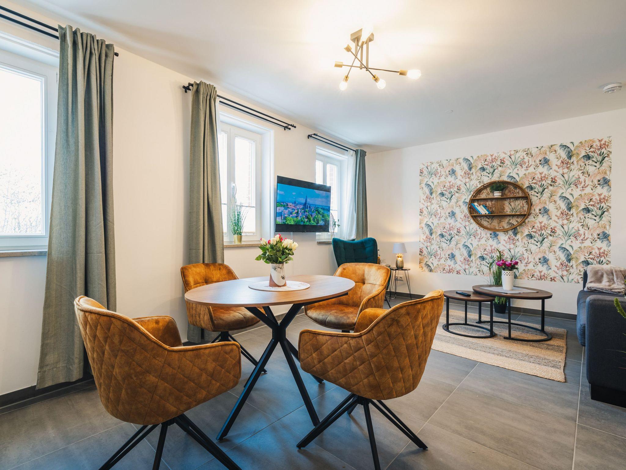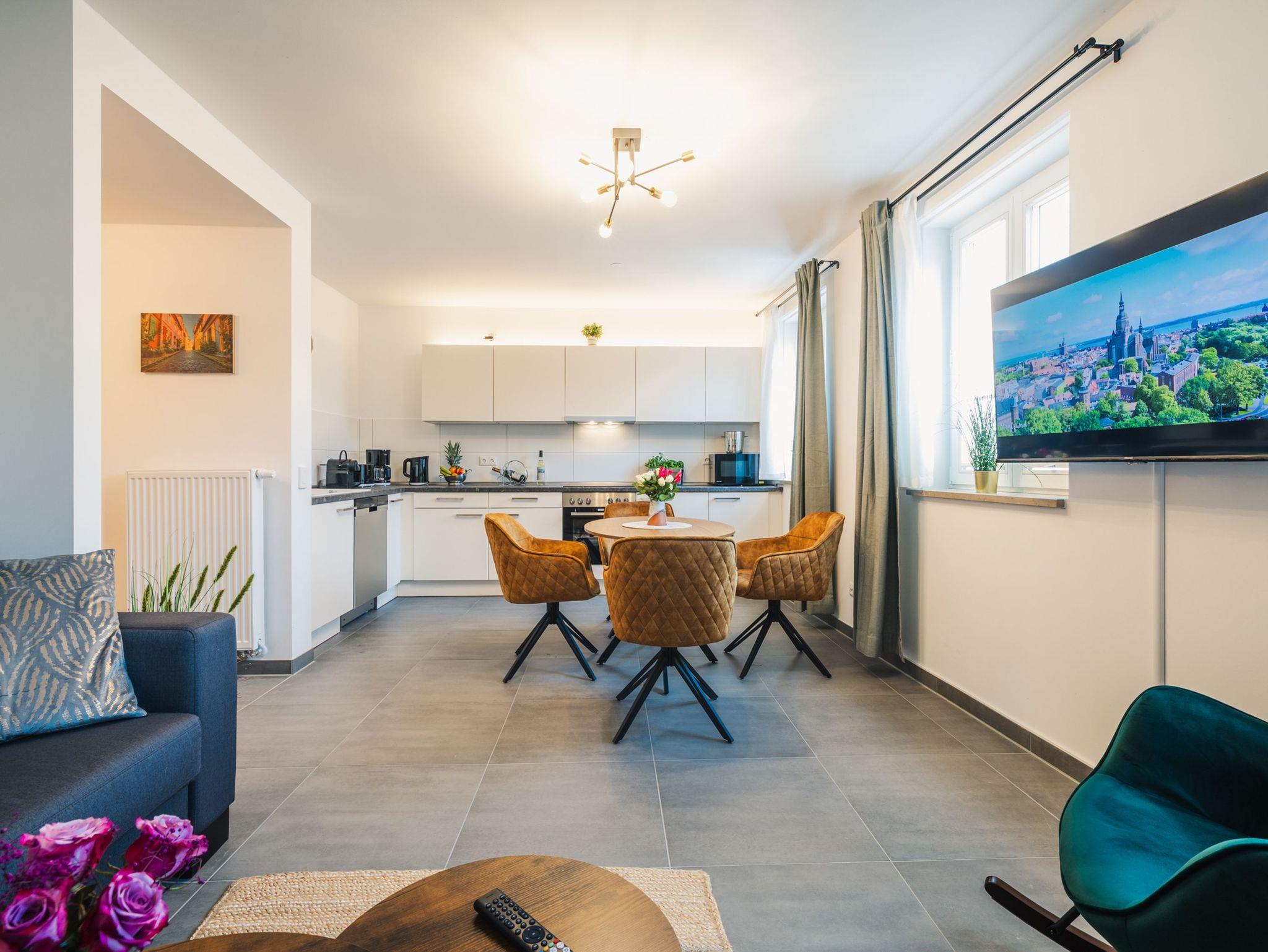Das Altstadt Studio 10 liegt im 1. Obergeschoss und bietet dir auf rund 65 m² eine durchdachte und helle Ferienwohnung für bis zu 4 Personen. Nach dem Ankommen öffnet sich ein freundlicher Wohnbereich, der Wohnen, Essen und Kochen angenehm miteinander verbindet. Im Wohnbereich stehen ein Sofa und ein TV bereit, das Schlafsofa (160x200) lässt sich zu einem vollwertigen Bett umbauen und bietet zwei zusätzliche Schlafplätze. Direkt angrenzend liegt der Essbereich, ideal für gemeinsame Mahlzeiten oder einen entspannten Start in den Tag. Die Küche ist vollständig ausgestattet und bietet Kühlschrank, Herd, Backofen und Spülmaschine sowie Kochutensilien. Für Kaffee und Frühstück sind Wasserkocher, Toaster, Kaffeemaschine und eine Nespresso Kapselmaschine vorhanden, sodass du dich unkompliziert selbst versorgen kannst. Das separate Schlafzimmer ist mit einem Doppelbett (180x200) eingerichtet und verfügt ebenfalls über einen TV. Von hier aus gelangst du auf den kleinen Balkon zum Innenhof, perfekt für eine kurze Pause zwischendurch. Das Badezimmer ist modern gestaltet und mit Dusche, WC und Bidet ausgestattet. Wenn du mit dem Auto anreist, kannst du einen überdachten Parkplatz auf dem Hof optional dazu buchen.