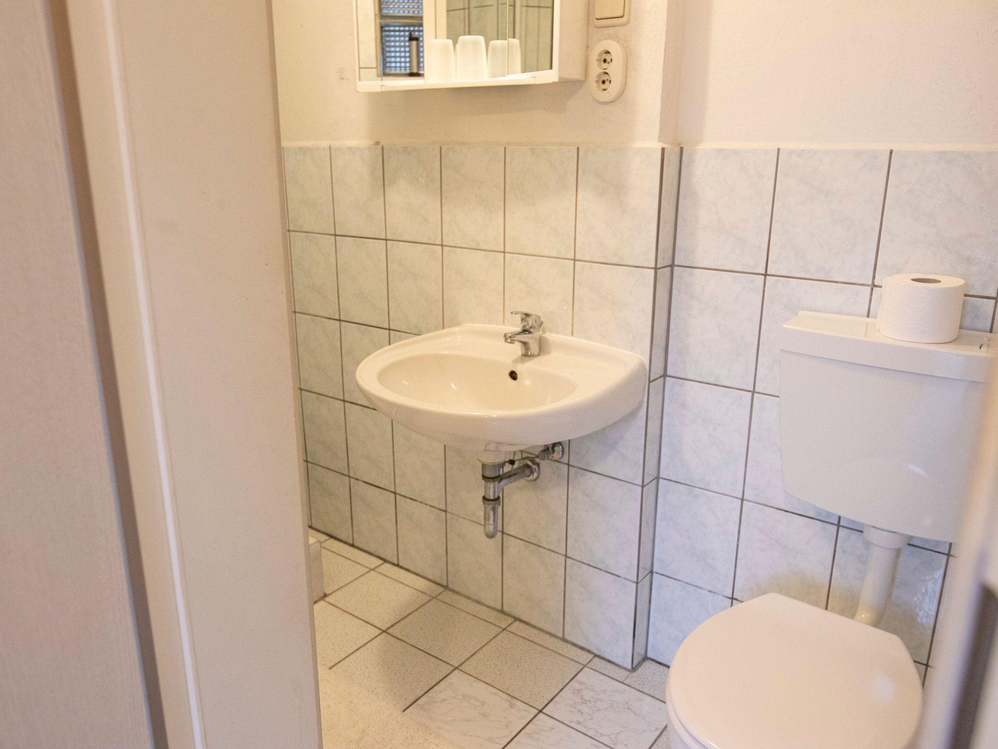 Im Eingangsbereich der kleinen 22m² Maisonettewohnung befindet sich eine kleine, voll ausgestattete Singleküche (2-Kochplatten, Kühlschrank, Kaffeemaschine, Wasserkocher etc.), ein Tisch mit 2 Stühlen. Von dort gelangt man in das Bad mit Dusche, Waschbecken und WC.