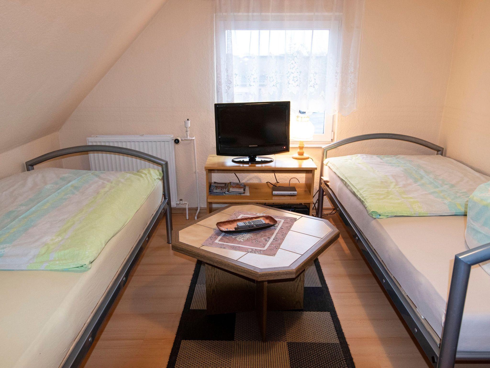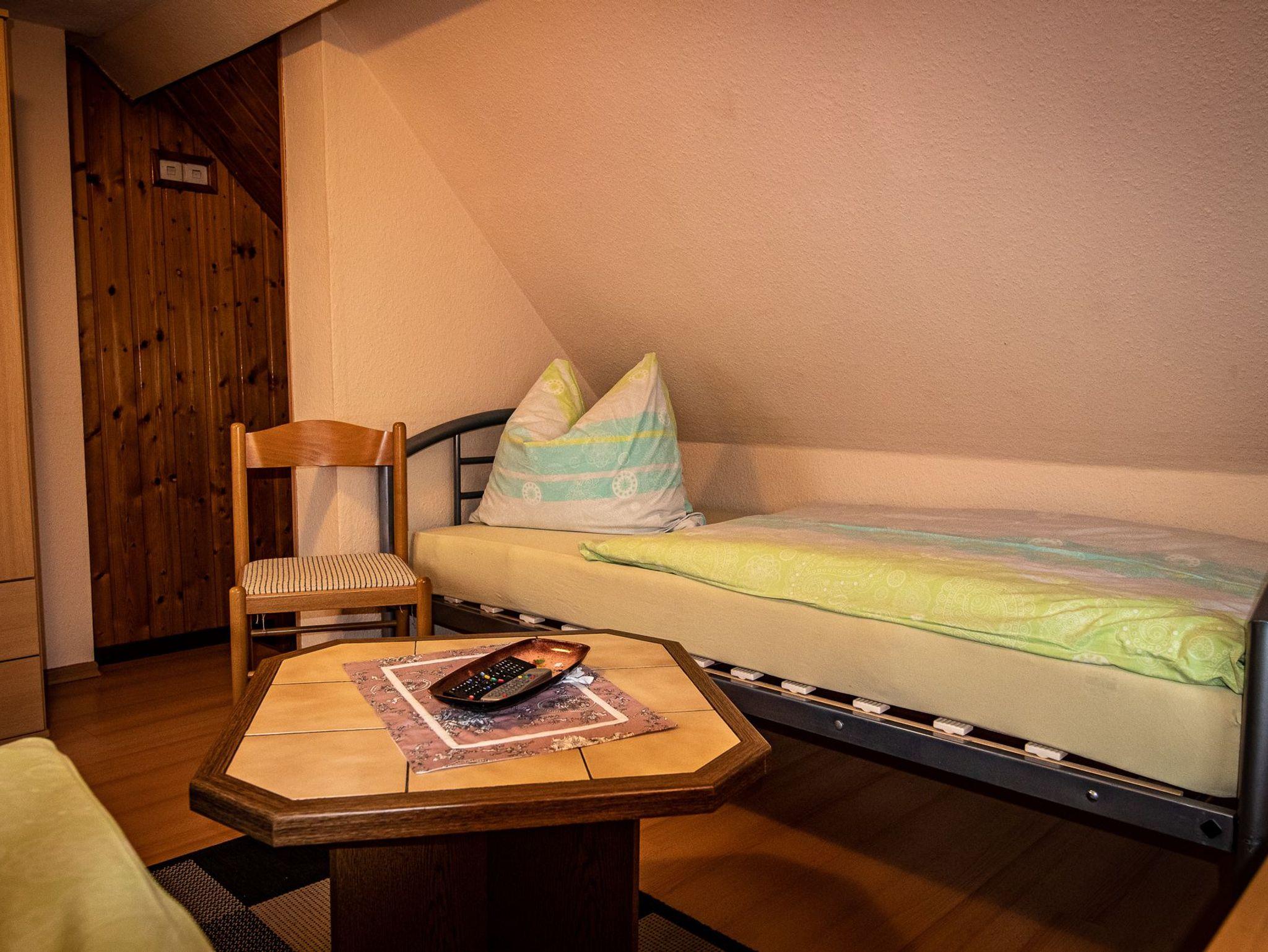 Über eine steile Treppe (nicht alters- und behindertengerecht!) gelangt man im Obergeschoss in den Wohn-Schlafraum, welcher mit 2 Einzelbetten, Tisch, 2 Stühlen, Kabel-TV und einem Waschschrank eingerichtet ist. Bei Bedarf kann man die beiden Betten auch zusammen stellen.