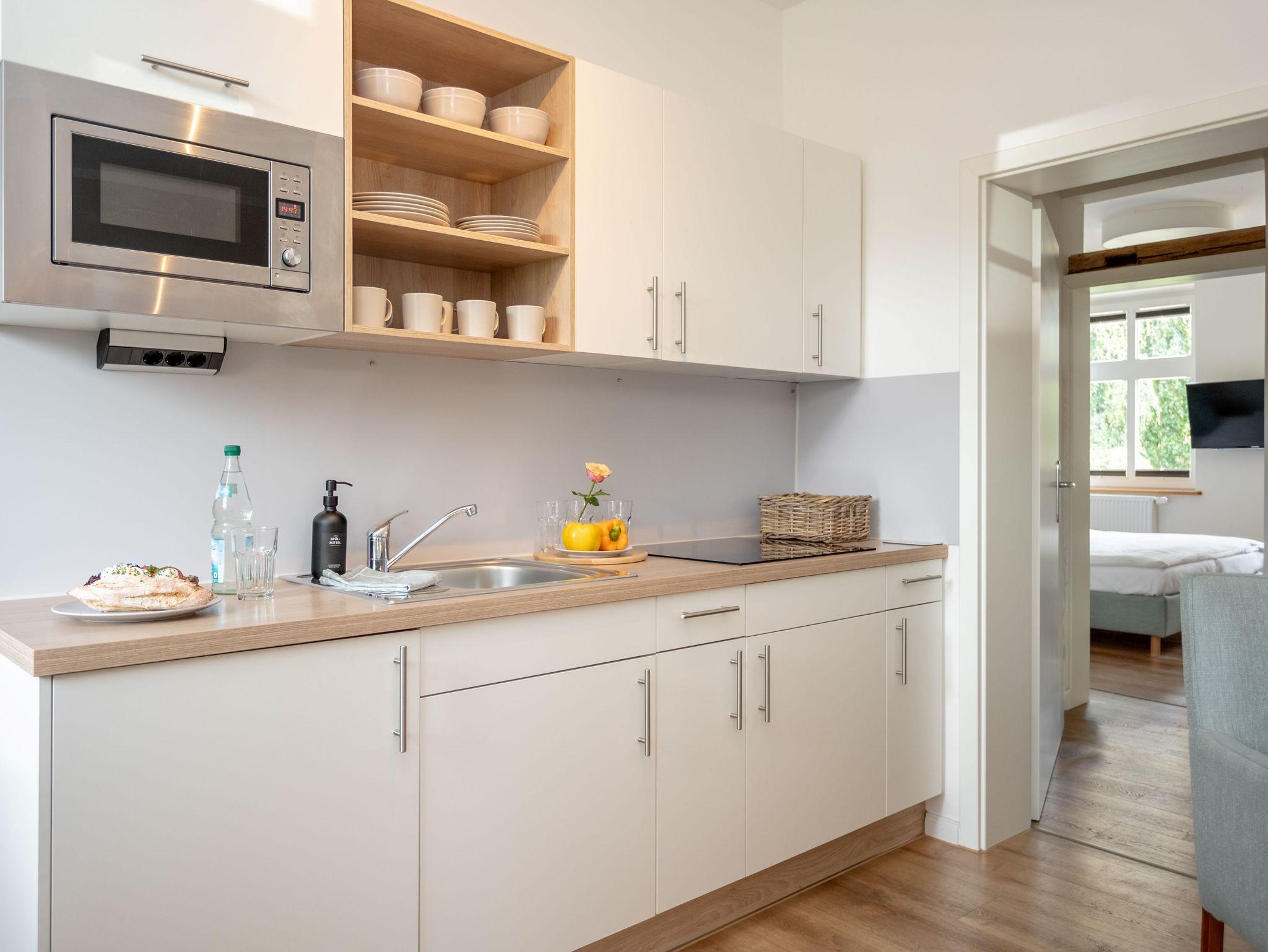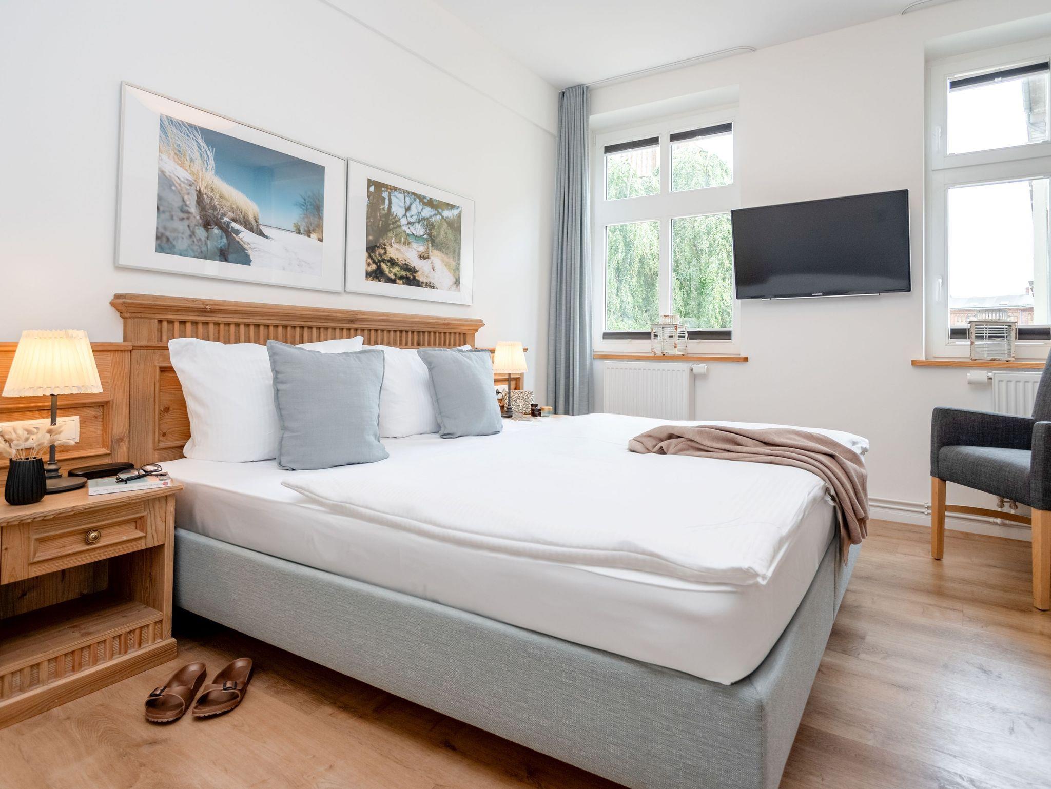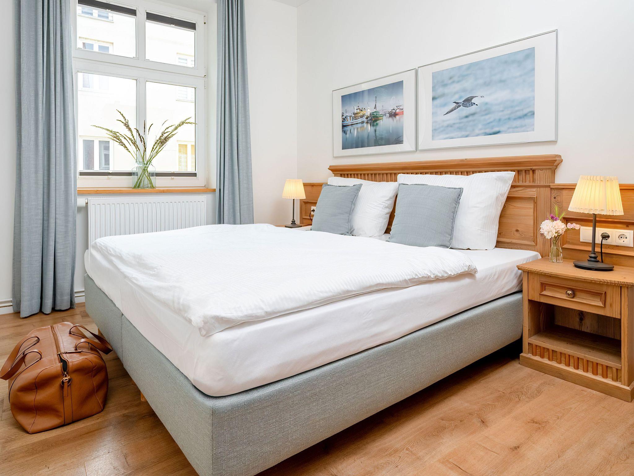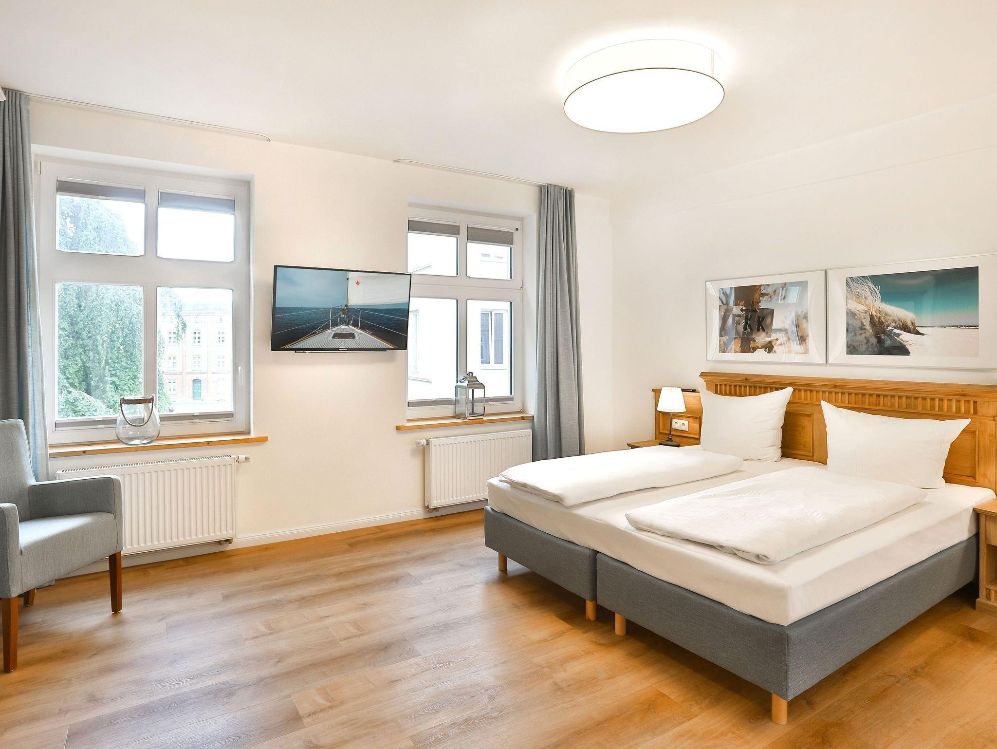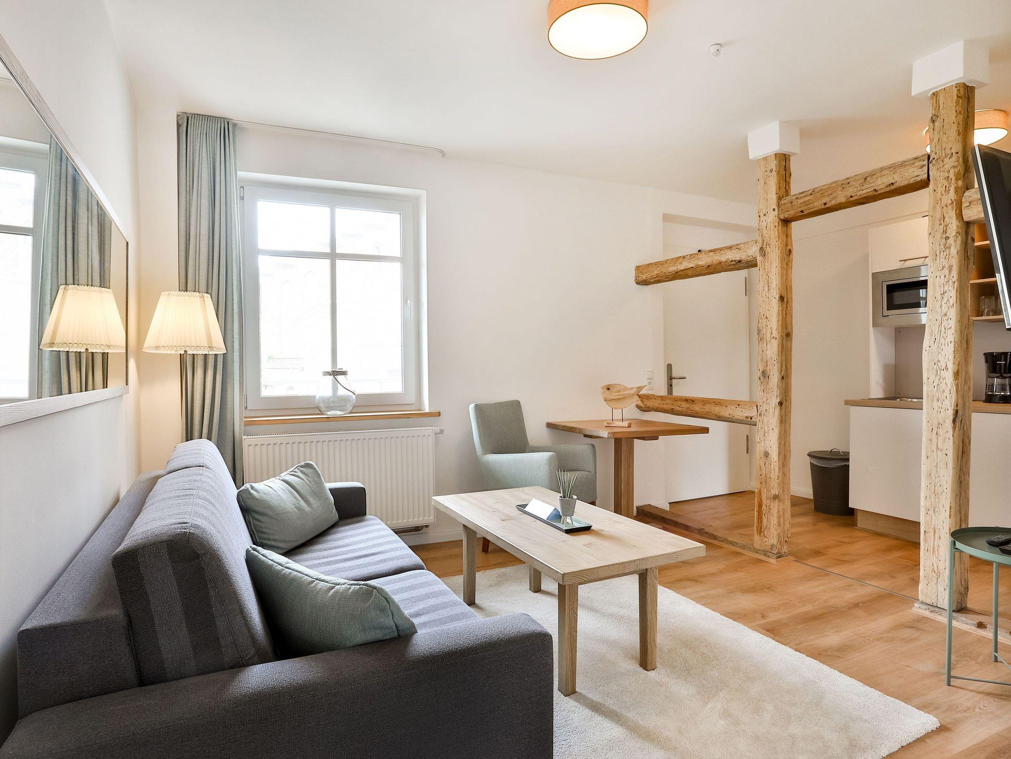 Die Drei-Raum-Apartments Superior sind unsere geräumigsten Unterkünfte. Sie befinden sich im 1. Obergeschoss und bieten entweder einen Blick zum Innenhof oder auf die St.-Marien-Kirche. Diese Apartments bieten Platz für getrennte Schlafzimmer oder die ganze Familie. Jedes Apartment verfügt über zwei Schlafzimmer mit je einem gemütlichen Boxspringbett, TV/Radio, sowie ein Wohnzimmer bzw. eine Wohnküche mit Sitzecke und Schlafcouch, eine gut ausgestattete Küchenzeile und ein Badezimmer mit Dusche.