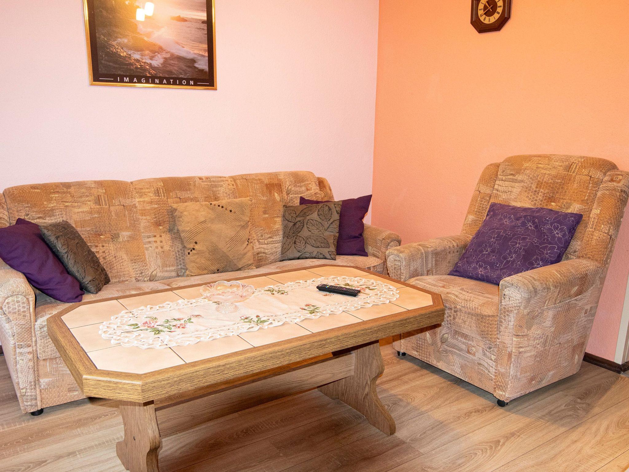 Es stehen eine kleine 1-Raum-Maisonettewohnung und eine 2-Raum-Ferienwohnung zur Verfügung. Im Garten gibt es eine sonnige Sitzecke mit Grillmöglichkeit und Hollywoodschaukel.