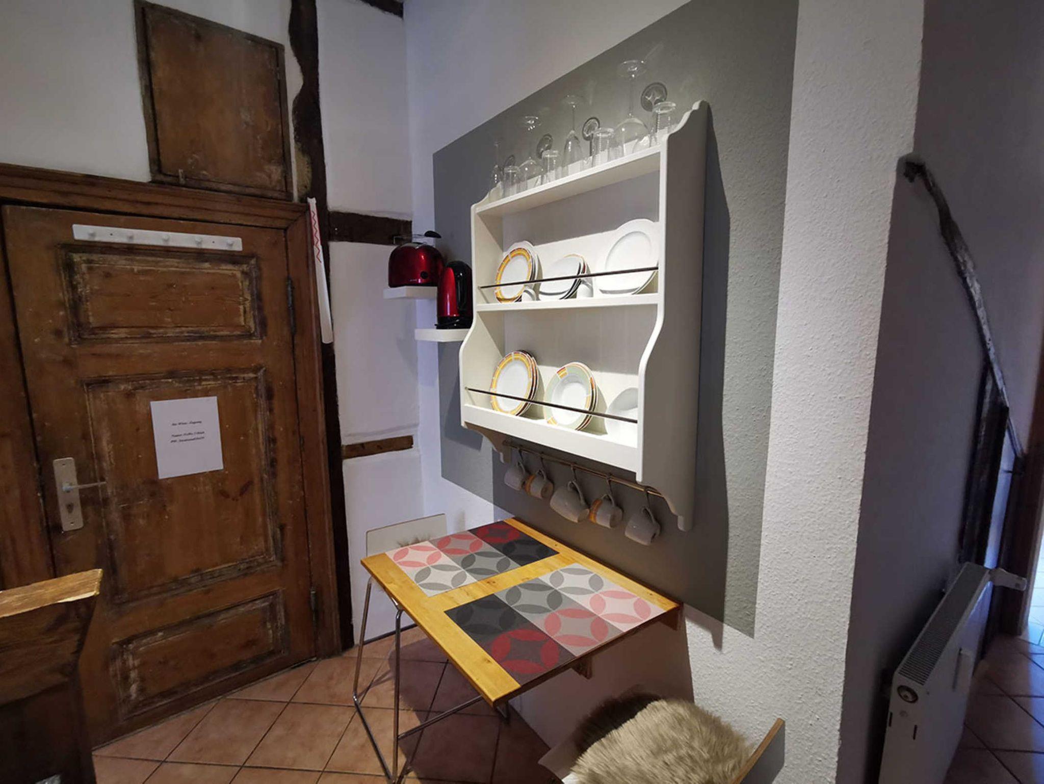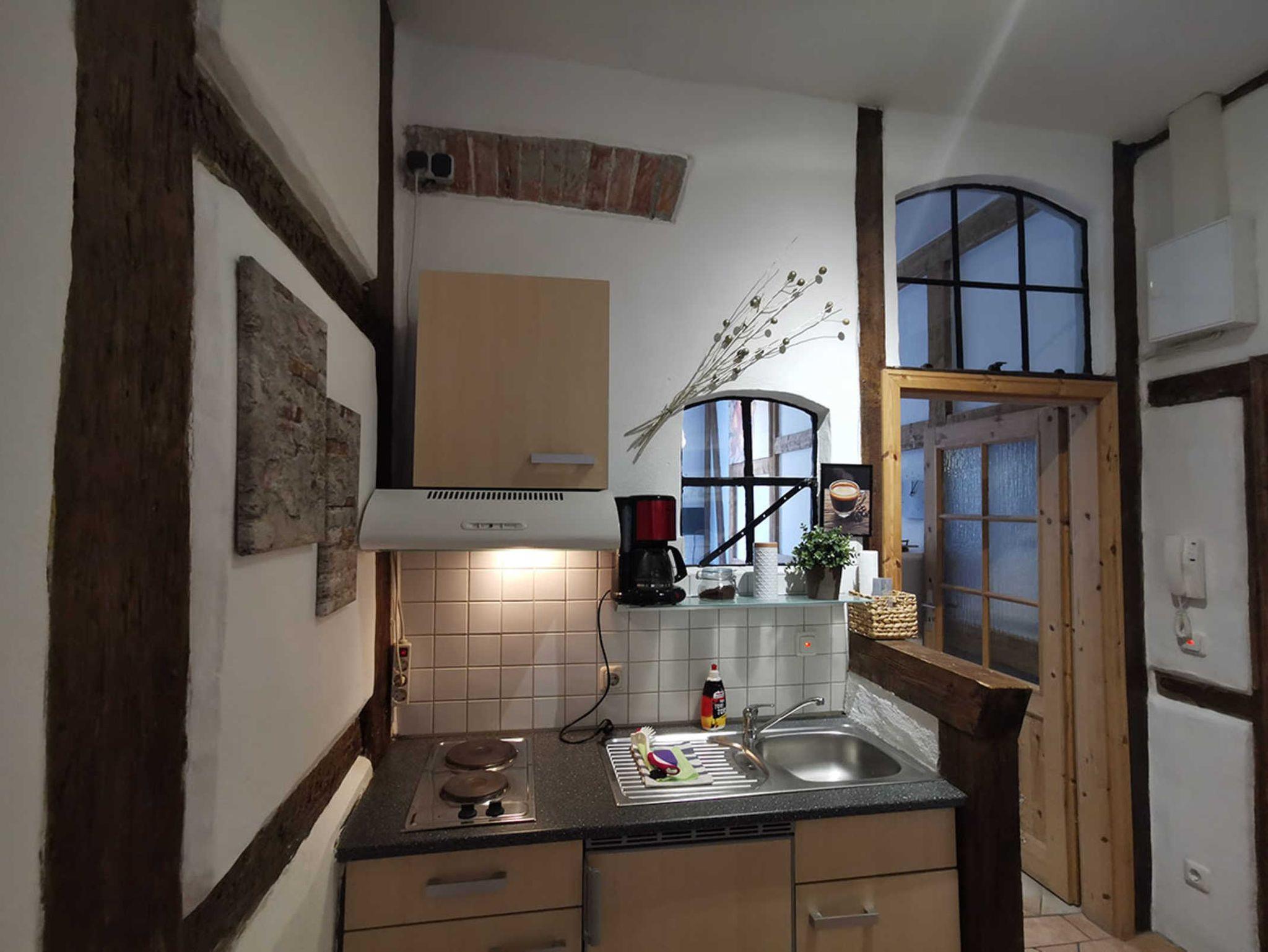 Die FeWo hat ein kombiniertes Wohn- und Schlafzimmer mit 2 getrennten Betten, die man zum Kuscheln natürlich auch zusammen schieben kann. Die Küche bietet einen Kühlschrank, E-Herd, Wasserkocher, sowie eine kleine Sitzgelegenheit zum Frühstück oder Abendessen. Das Bad ist gefliest, mit Dusche und einem Fenster zum begrünten Innenhof.