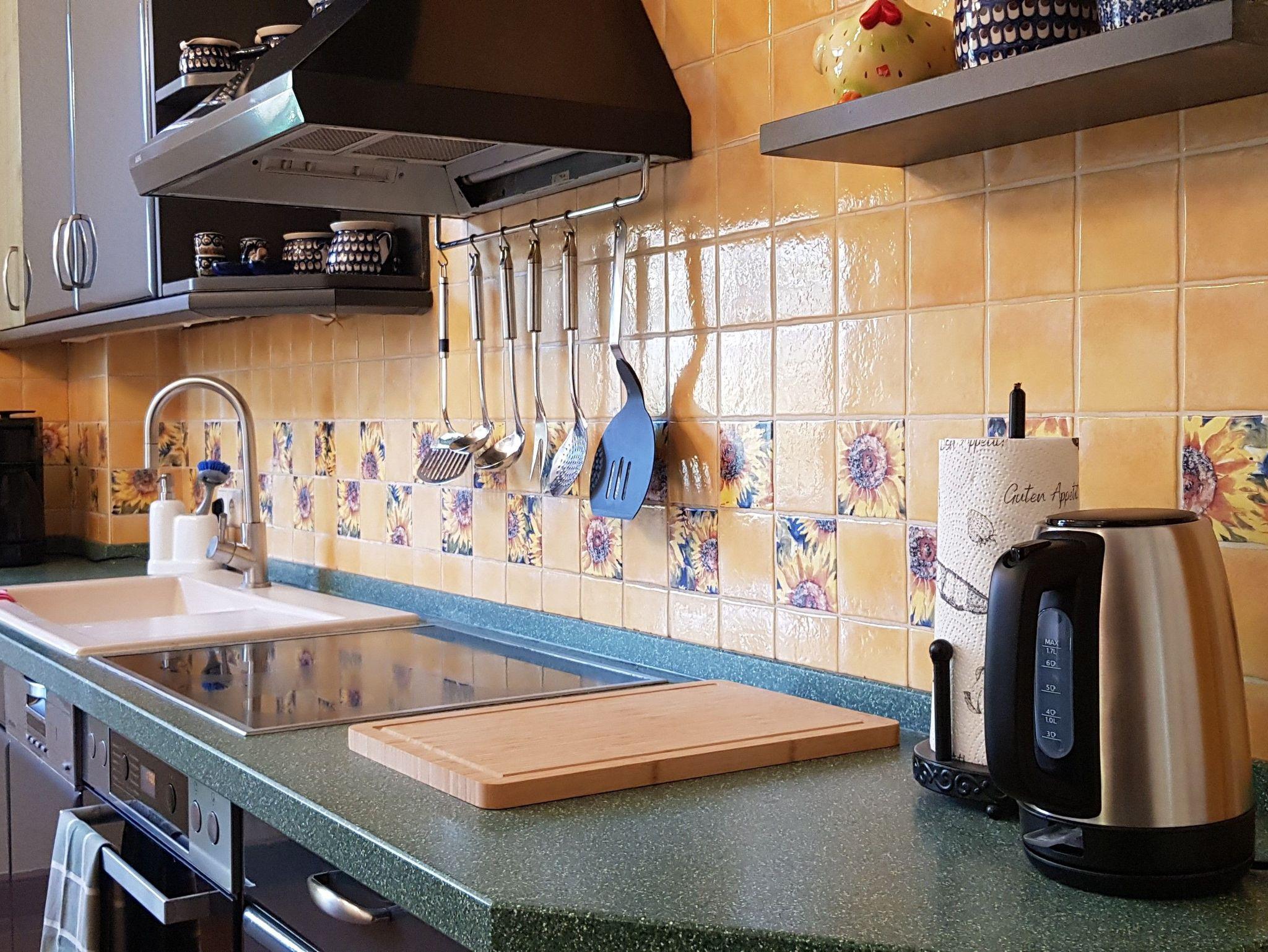 Die großzügig geschnittene Küche ist voll ausgestattet, das Bad mit ebenerdiger Dusche, Wanne und WC