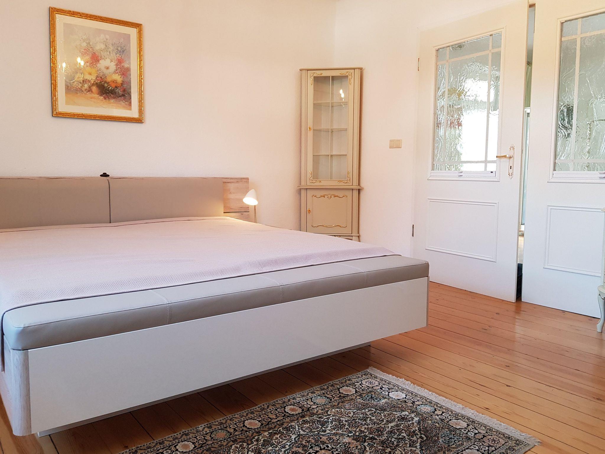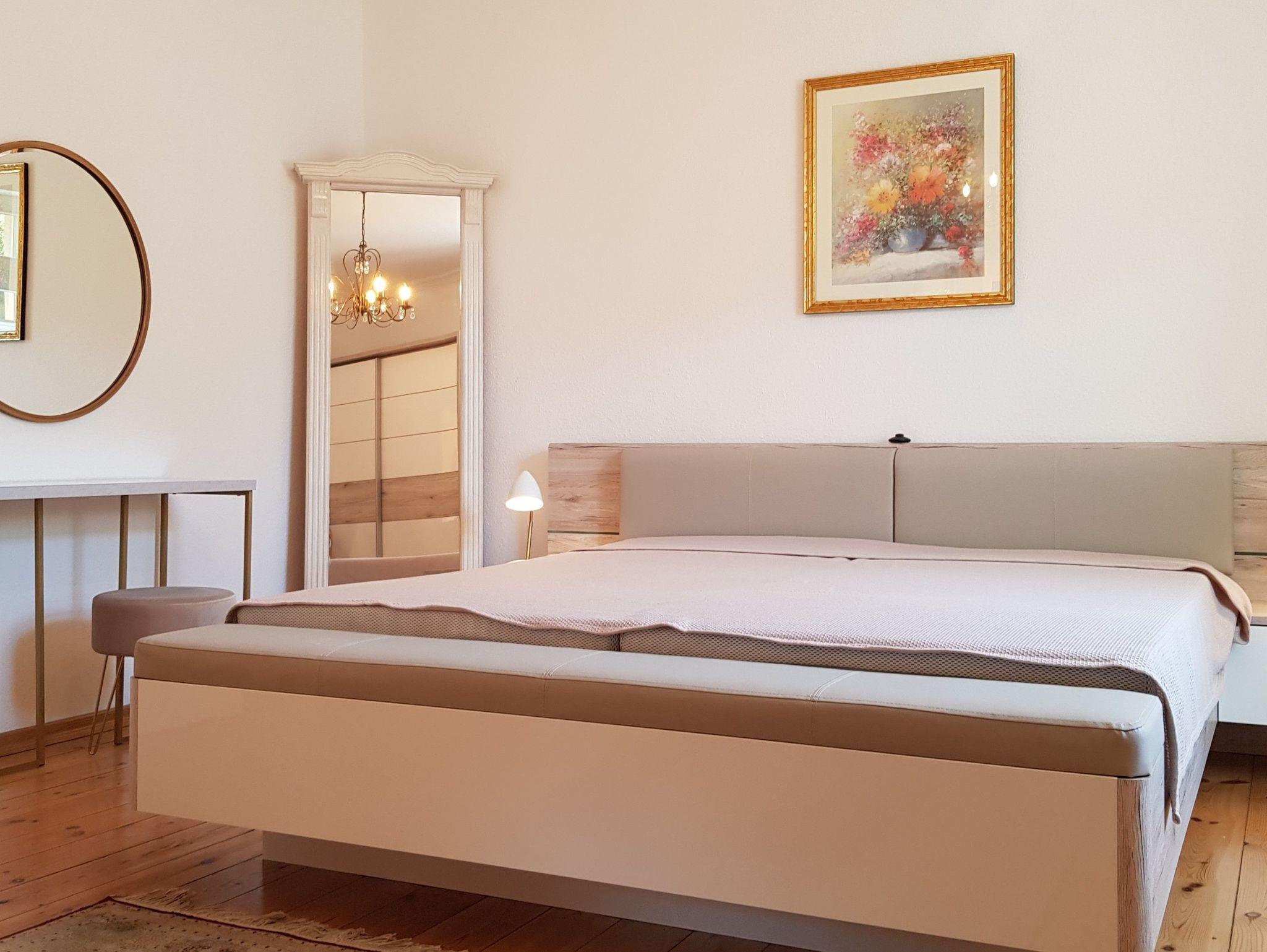 Die 110m große Wohnung (1.OG - ca. 6 Stufen) mit 3 Schlafzimmern ist ideal für einen Mehrgenerationen-Urlaub oder größere Familien. Während das 1. Schlafzimmer (Doppelbett 1,90x2,00m) über einen eigenen, kleinen Balkon verfügt, bietet das 2. Schlafzimmer (Doppelbett 1,90x2,00m) einen nostalgisch anmutenden Kamin. Das 3. Schlafzimmer ist mit einem 1,60m breiten Bett ausgestattet. Die Schlafzimmer sind mit geräumigen Kleiderschränken, für viel Stauraum, möbliert.