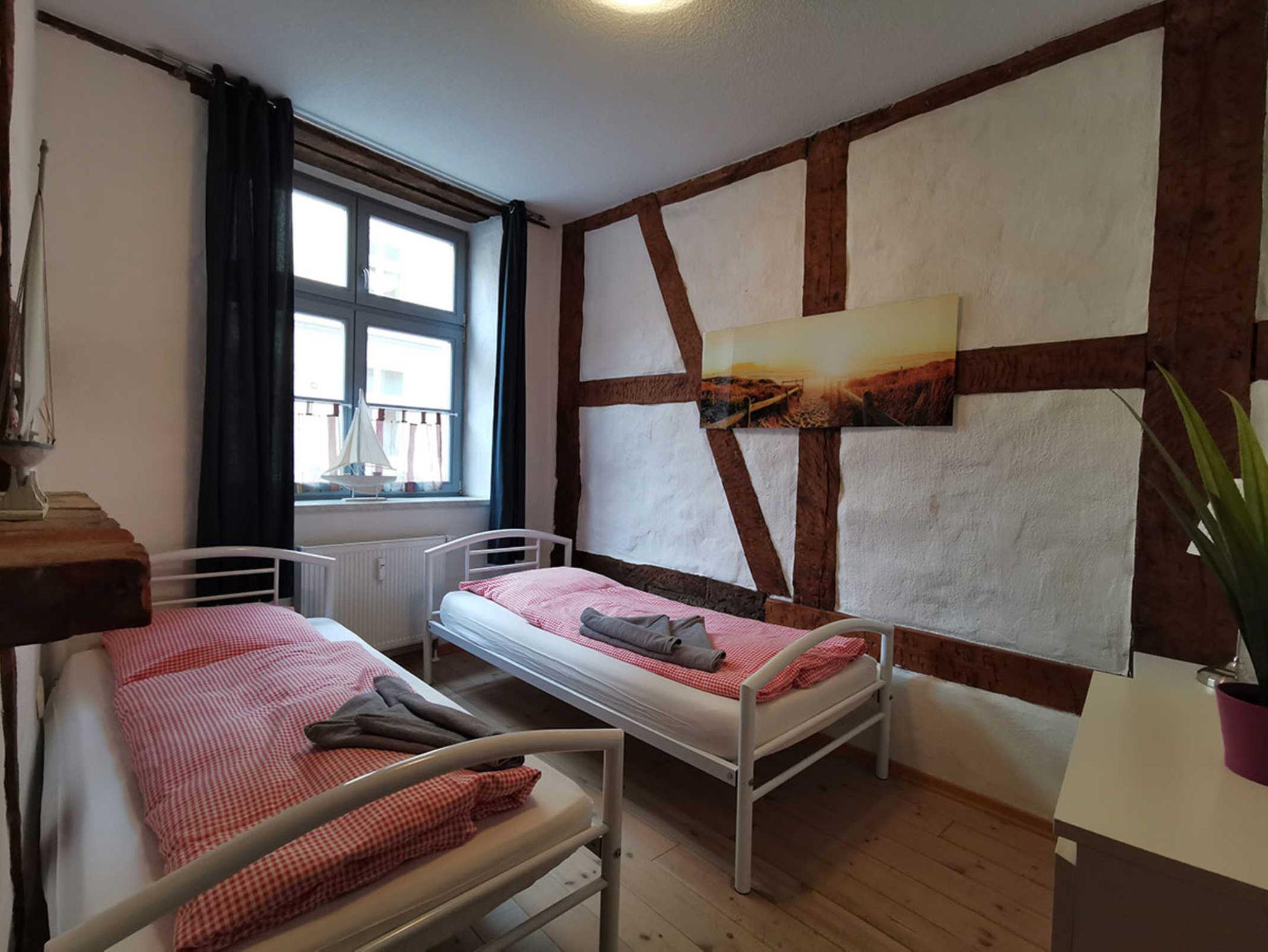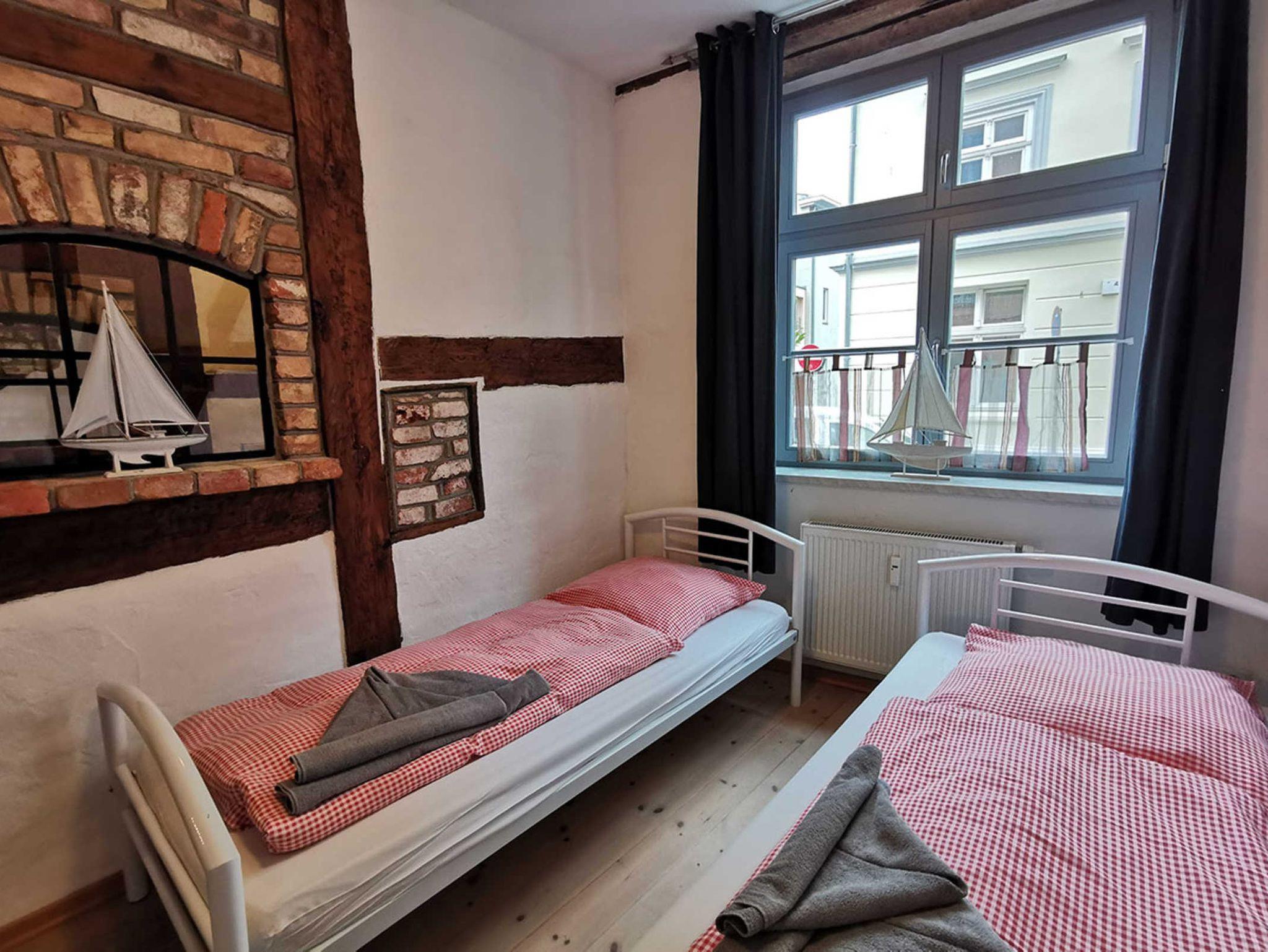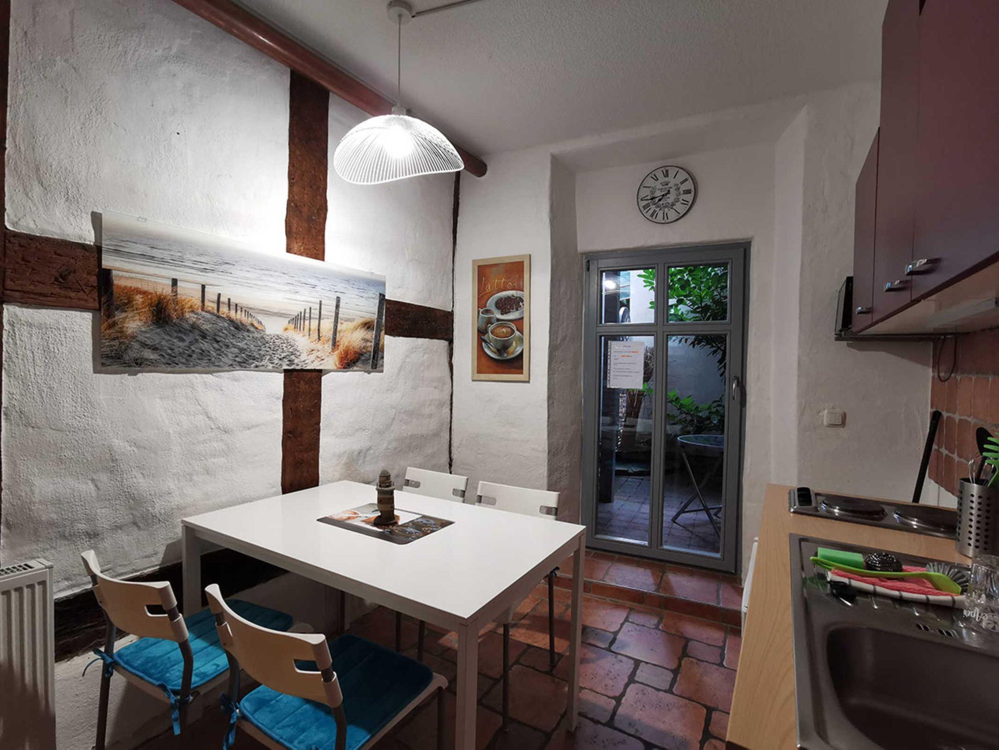 Unsere Ferienwohnung (ca 70 m²) befindet sich in der Frankenstr. 49 im Erdgeschoss, direkt in der Altstadt in Hafennähe. Sie verfügt über ein Wohnzimmer mit großem Esstisch für 6 Personen und 2 Schlafzimmer. Die Aufbettung für die 5. und 6. Person befindet sich auf der Schlafcouch im Wohnzimmer. Die Küche mit Einbauküche und großem Esstisch hat Zugang zur Terrasse, mit Blick zum historischen Innenhof. Das Bad ist gefliest mit WC und Dusche.
