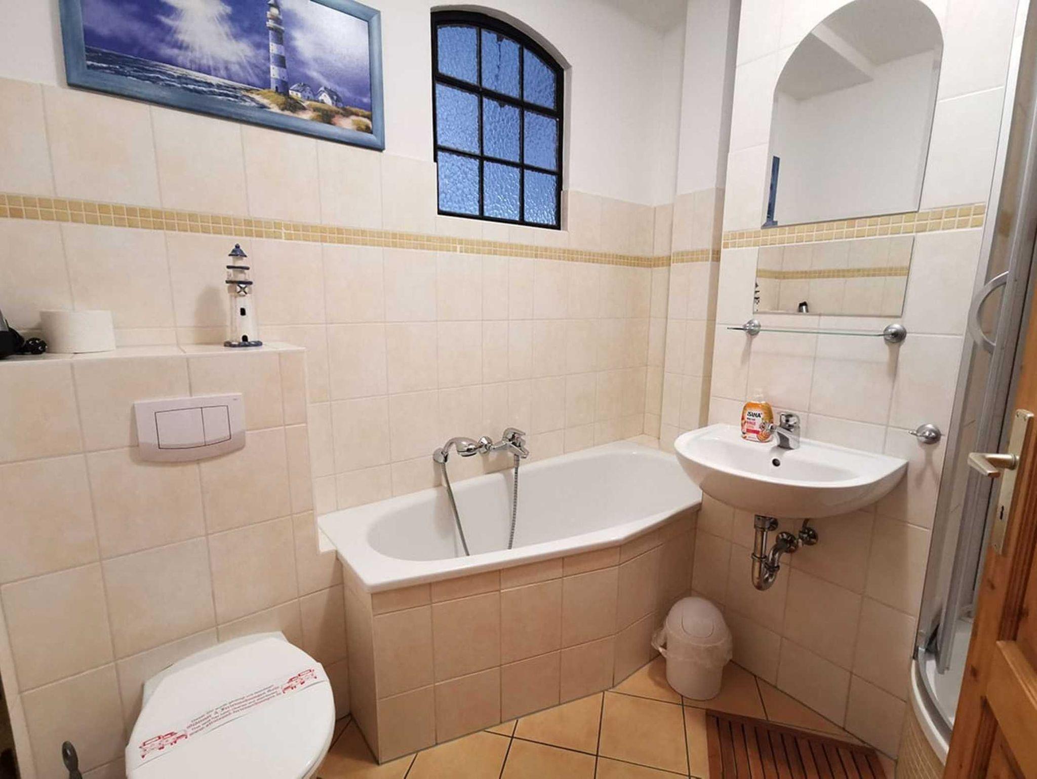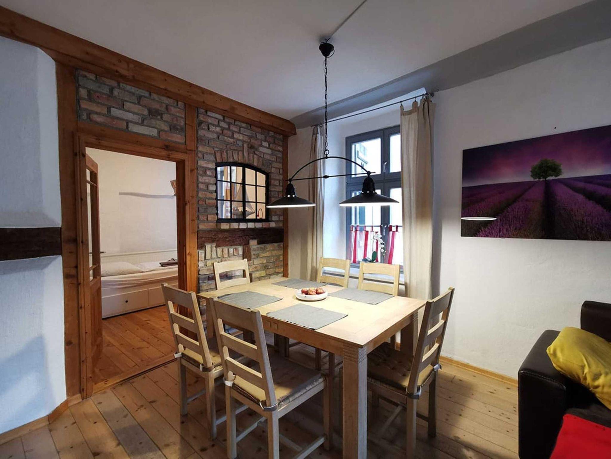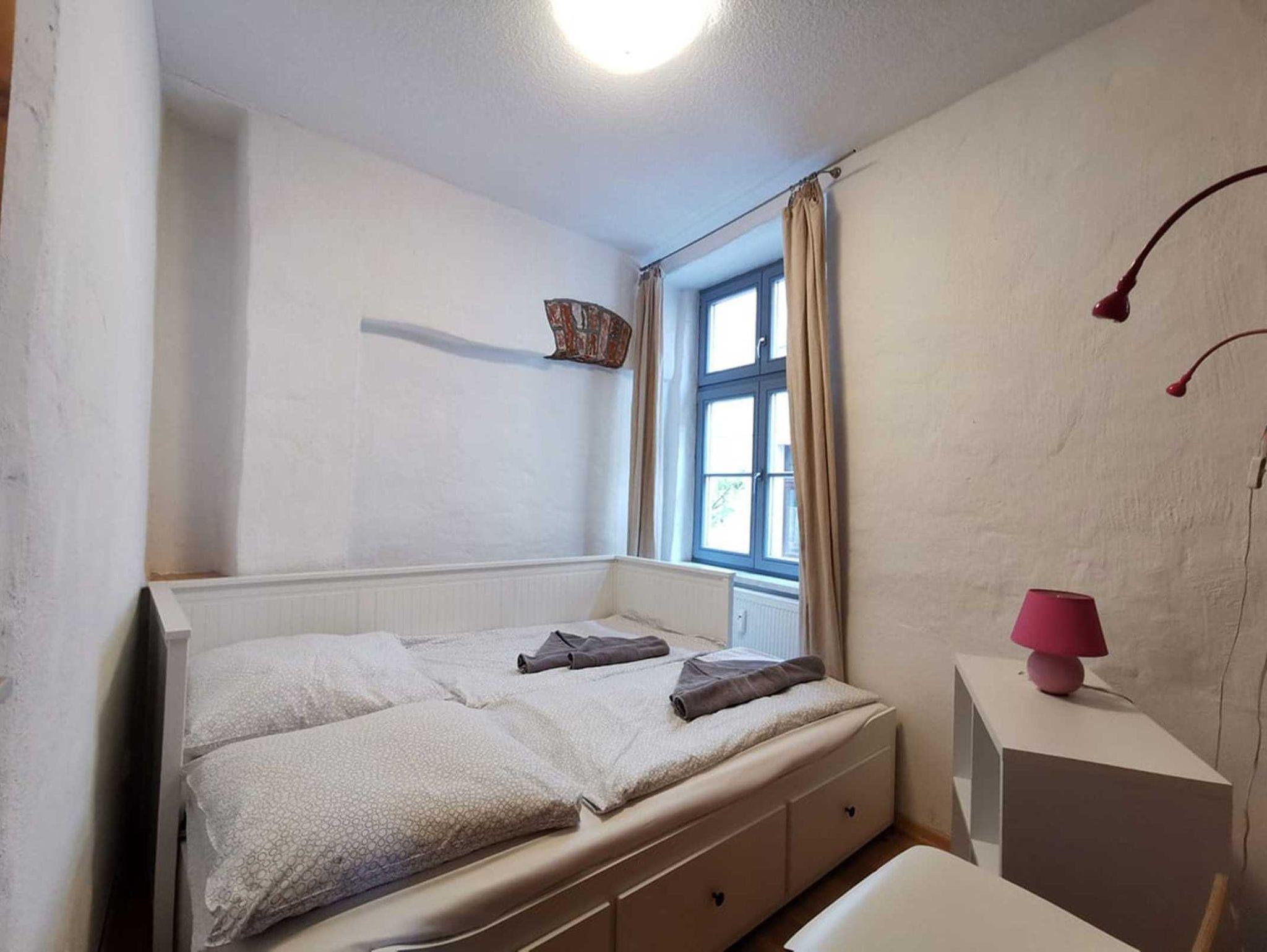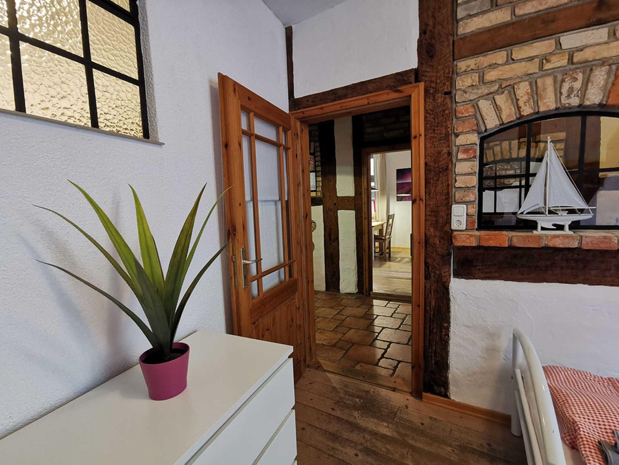Unsere Ferienwohnung (ca 70 m²) befindet sich in der Frankenstr. 49 im Erdgeschoss, direkt in der Altstadt in Hafennähe. Sie verfügt über ein Wohnzimmer mit großem Esstisch für 6 Personen und 2 Schlafzimmer. Die Aufbettung für die 5. und 6. Person befindet sich auf der Schlafcouch im Wohnzimmer. Die Küche mit Einbauküche und großem Esstisch hat Zugang zur Terrasse, mit Blick zum historischen Innenhof. Das Bad ist gefliest mit WC und Dusche.