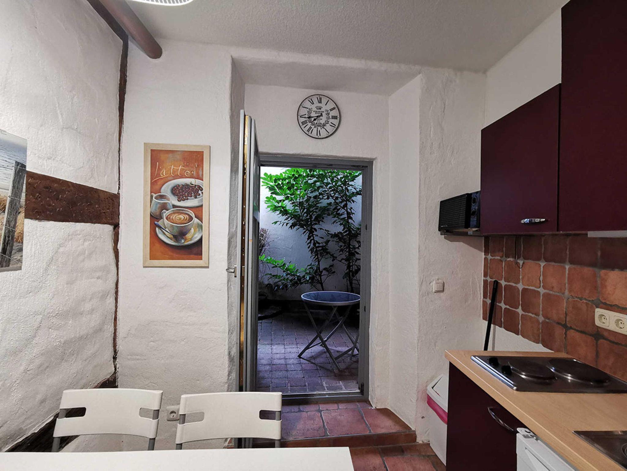 Die Küche mit Einbauküche und großem Esstisch hat Zugang zur Terrasse, mit Blick zum historischen Innenhof. Von dort aus haben Sie einen schönen Blick in Richtung Hafen und Ozeaneum und 1 Gehminute bis zum Hafen.